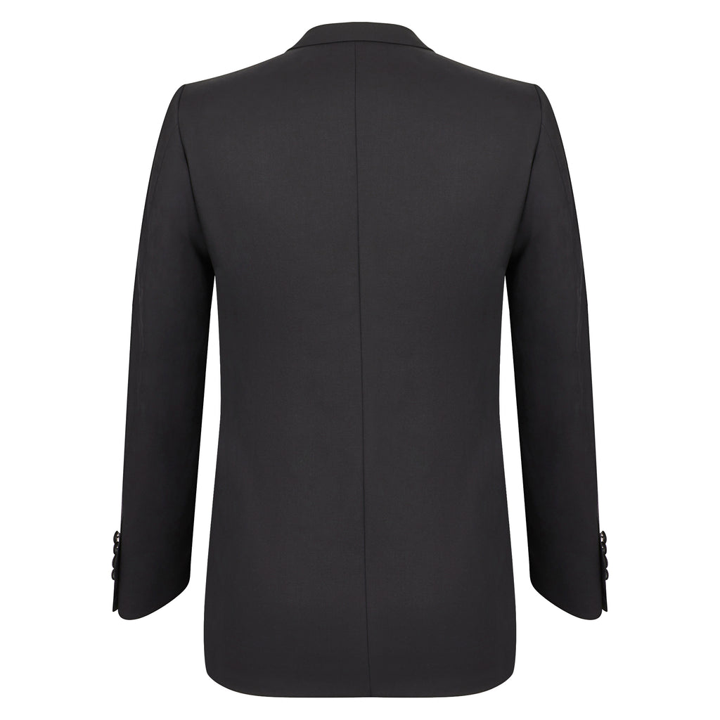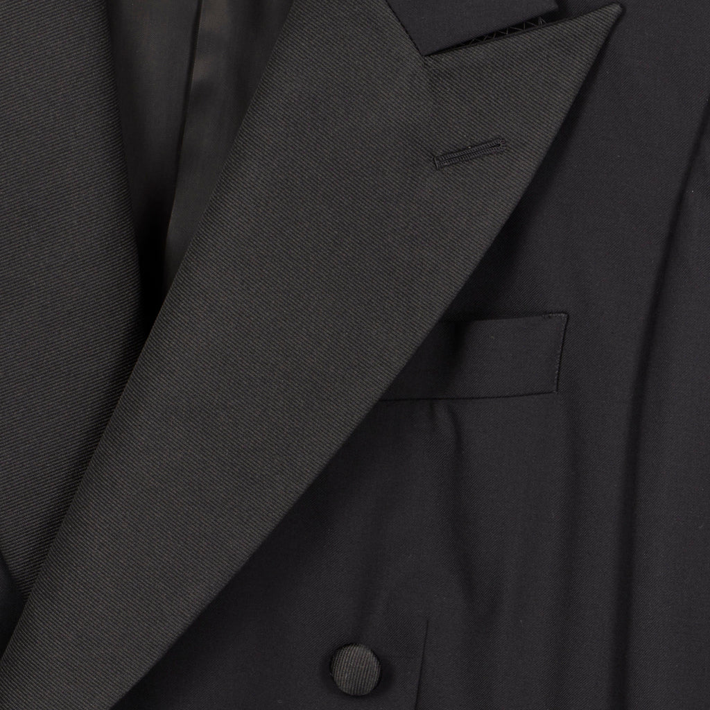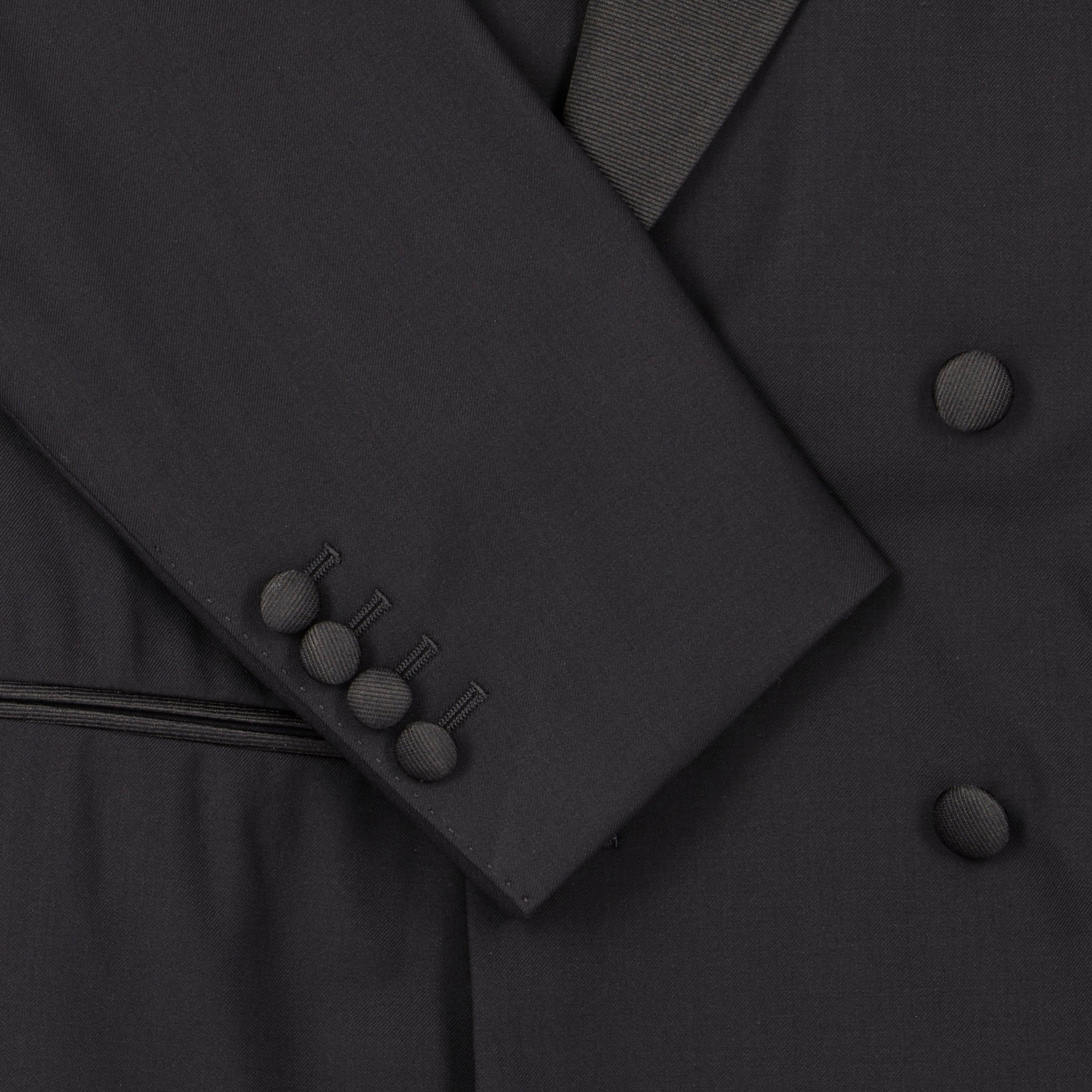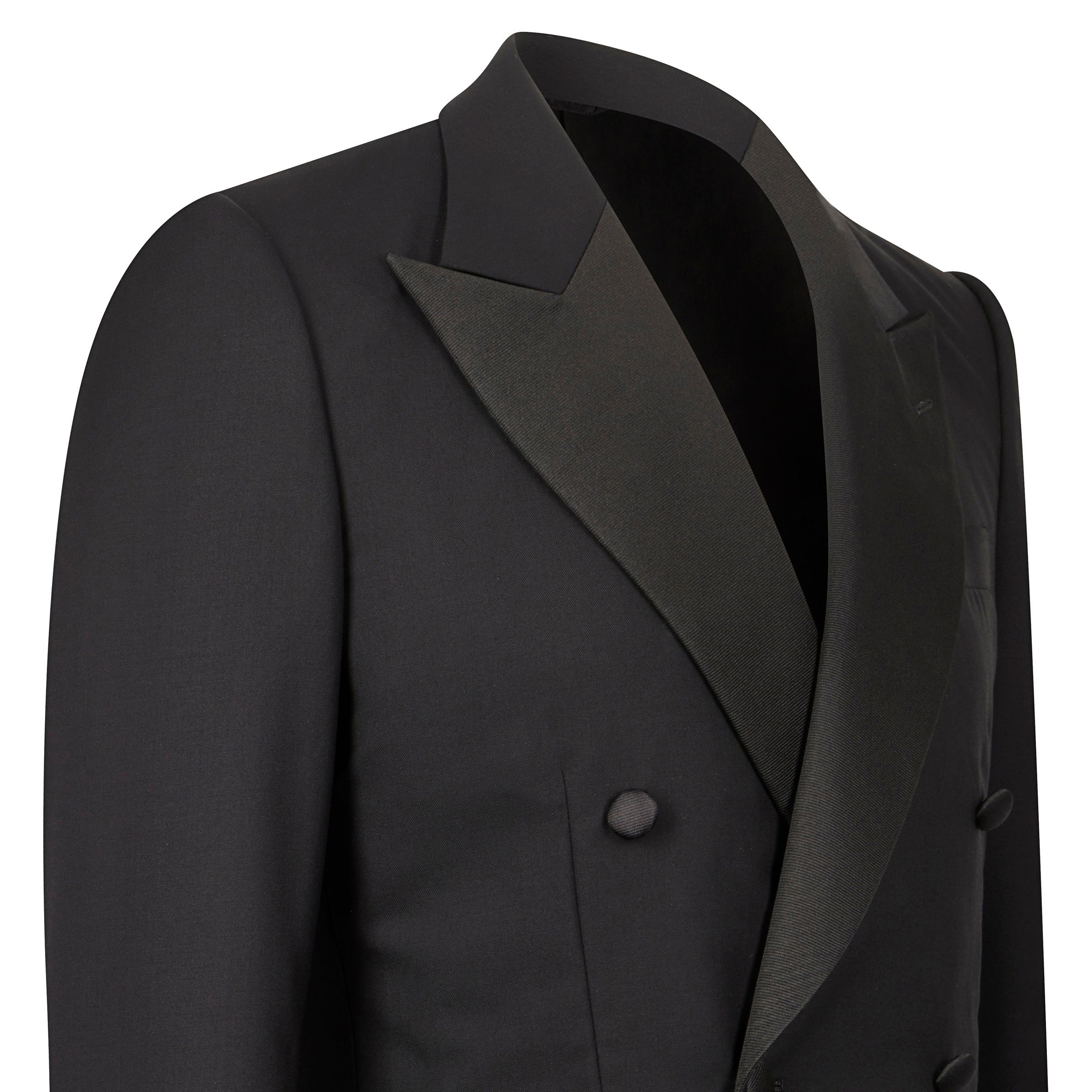 The Sexton ready-to-wear double-breasted dinner suit. Cut in a sharp black Italian wool, this jacket features grosgrain lapels in the classic Sexton peak and a narrowed waist, to induce a striking silhouette.