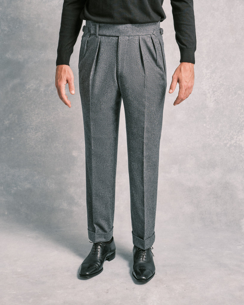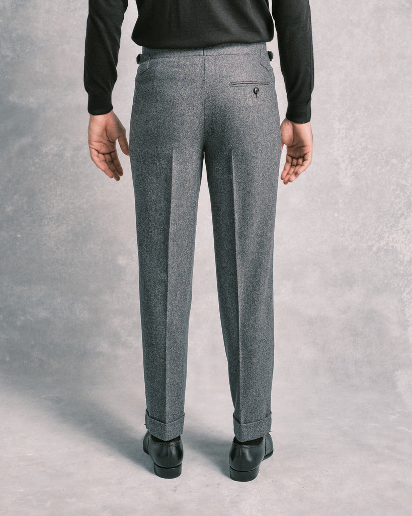 Those who, like us, enjoy a touch of romance in their dress may prefer trousers cut with pleats. Our Heritage Trousers are cut in the classic mid-century style with a high rise, generous legs and two deep, forward-facing pleats on each side of the waist. Trousers like these create the illusion of a slim waist and hips, and form the bottom half of the hourglass shape that starts with our jackets. We finish these with our signature pistol shaped side straps and slant-jet pockets; details which help our Heritage Trousers to retain a clean, fluid line through the leg.
