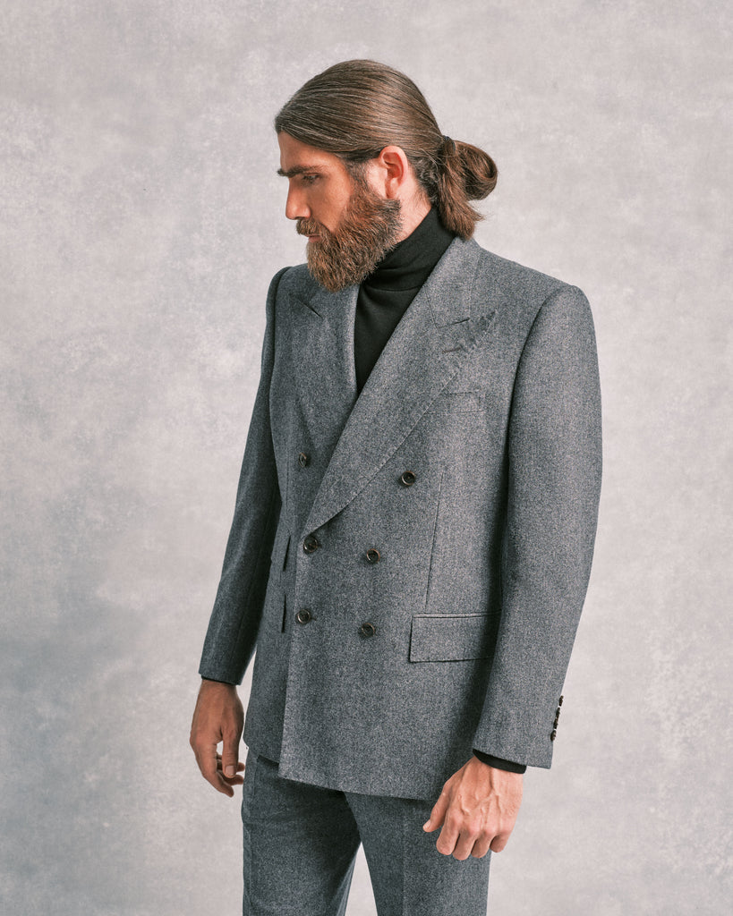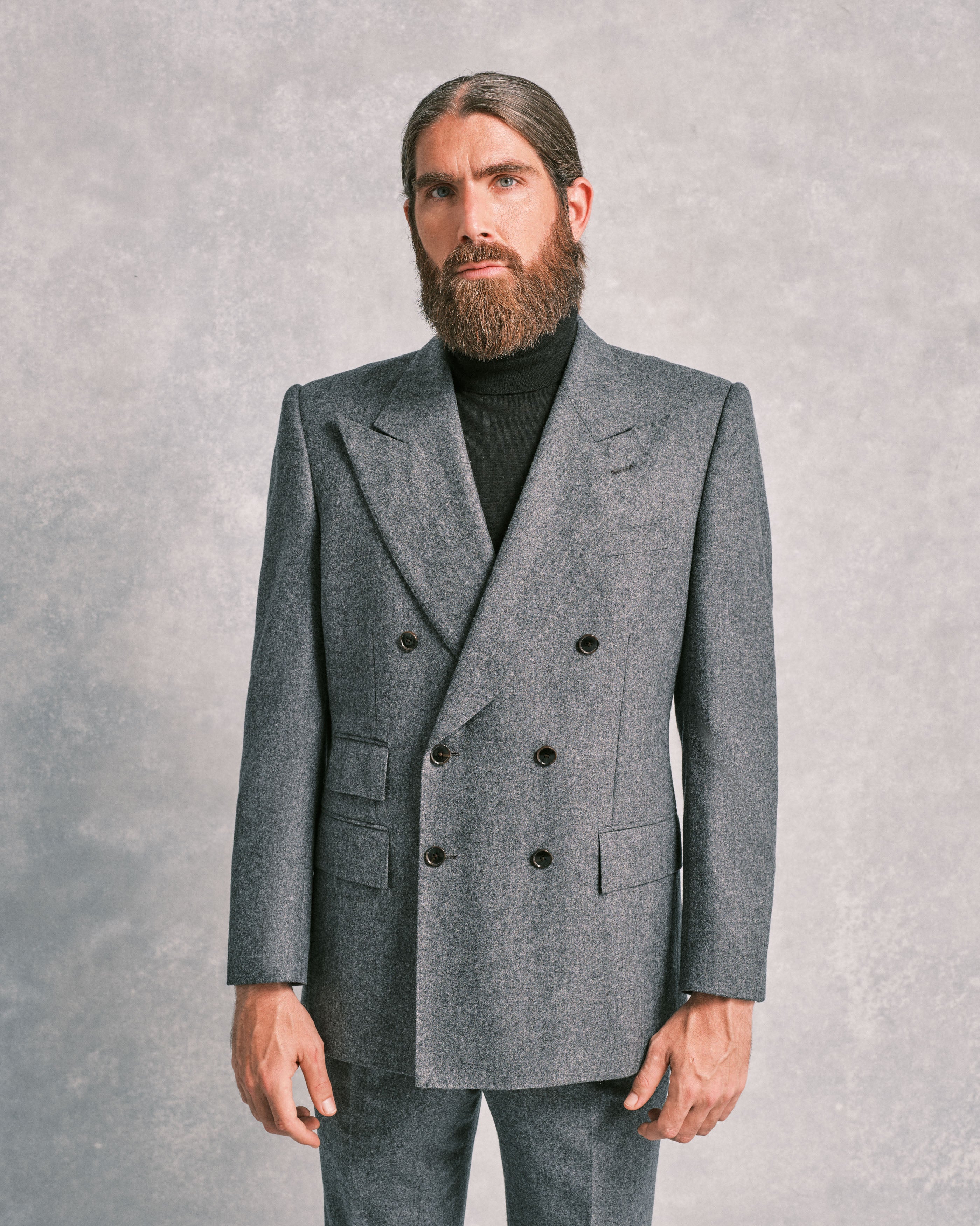 We have paired the double-breasted jacket with our fuller and matching heritage trousers, for a classic, timeless silhouette. Or, for those who prefer a more modern and sleek trouser, our contemporary grey flannel trousers are available here.