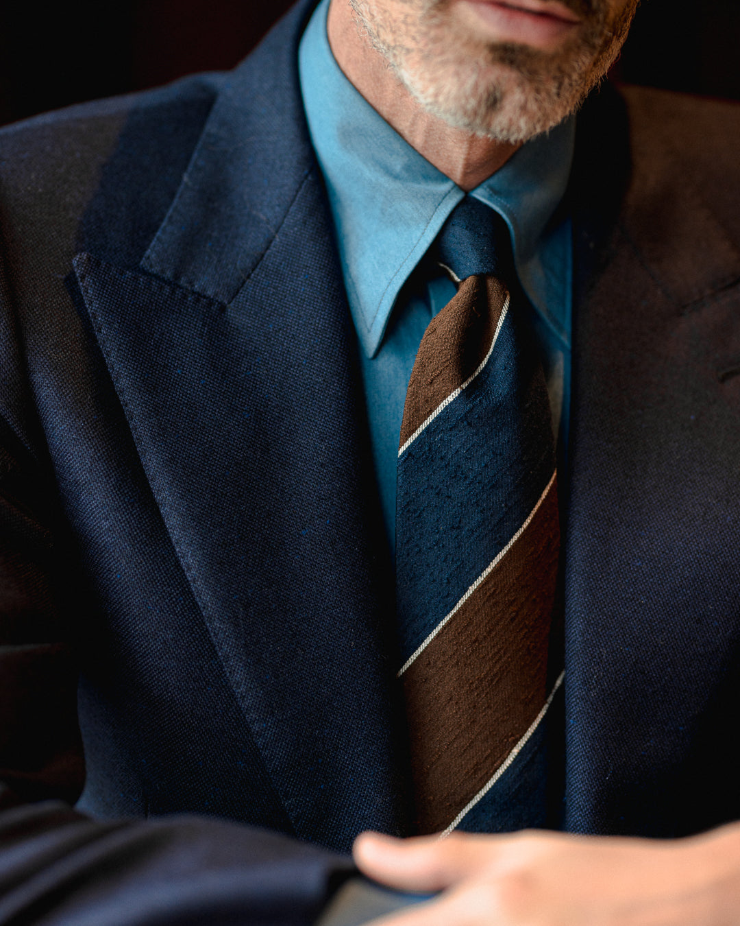 The hidden button-down collar shirt is the most versatile of Sexton shirts with our signature dramatic (9.4cm) spear point collar, with a soft construction to allow it to roll gently around a tie. The Hidden button down points stays perfectly in place when worn without a tie. The proportions work perfectly wi our jacket proportions.
