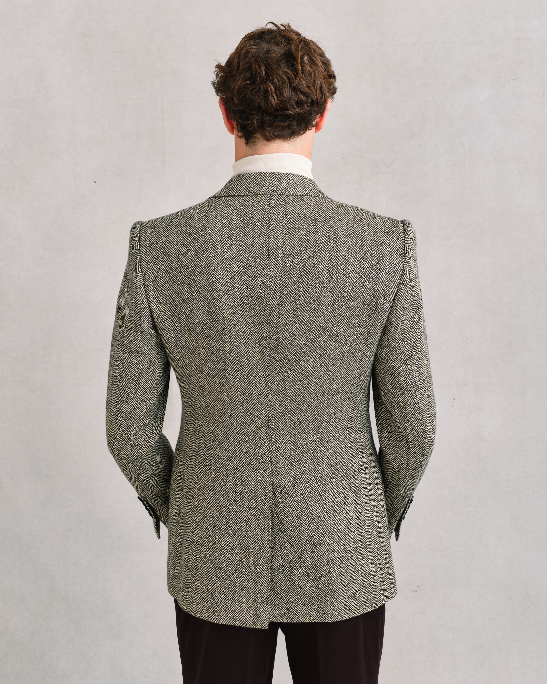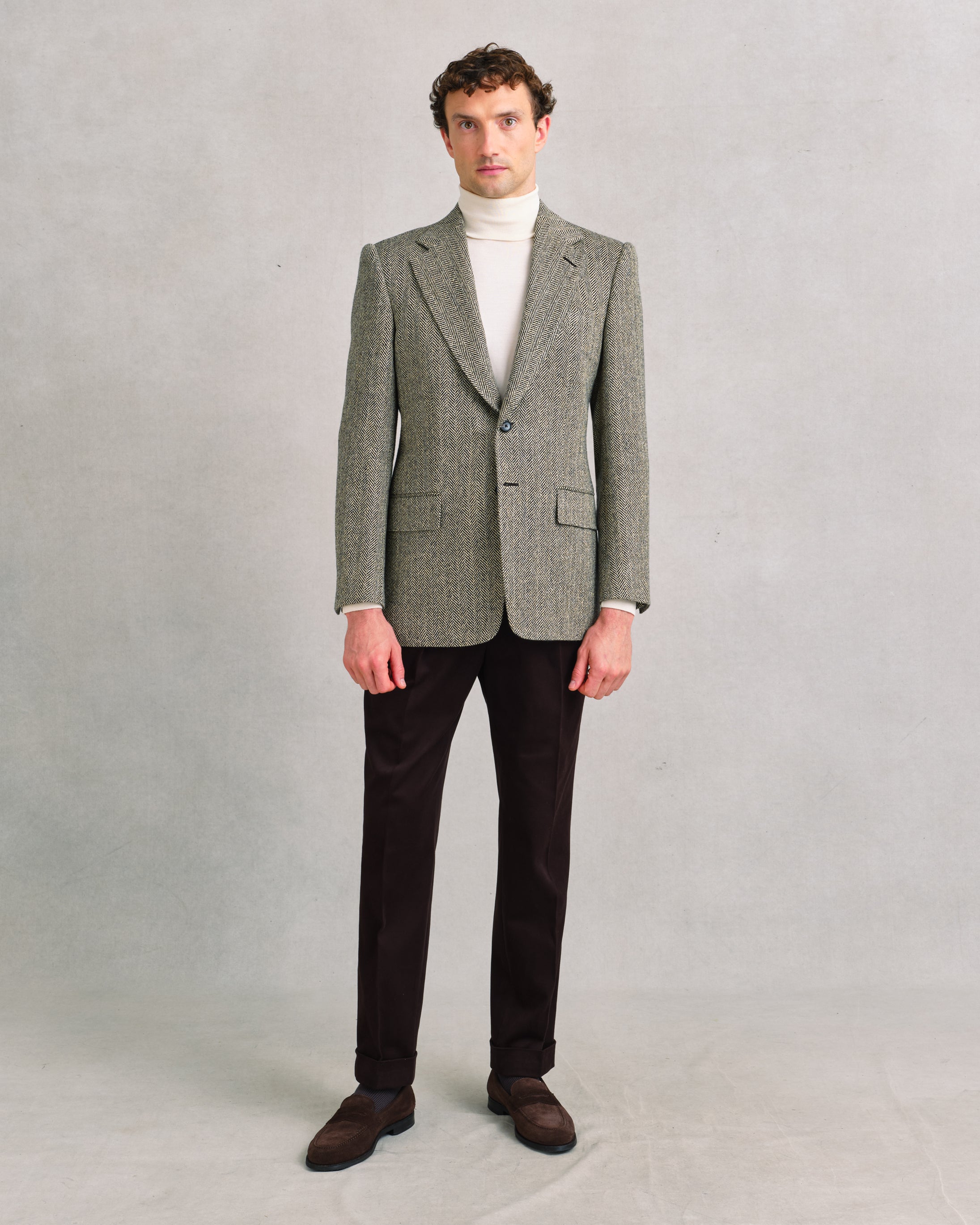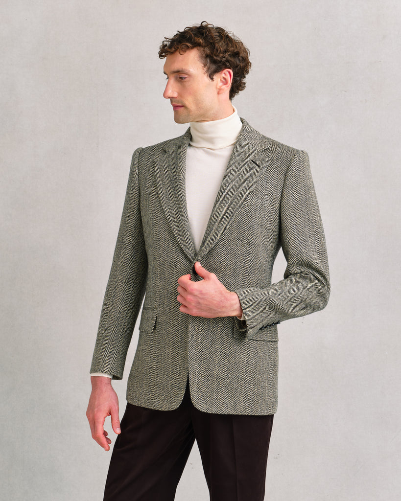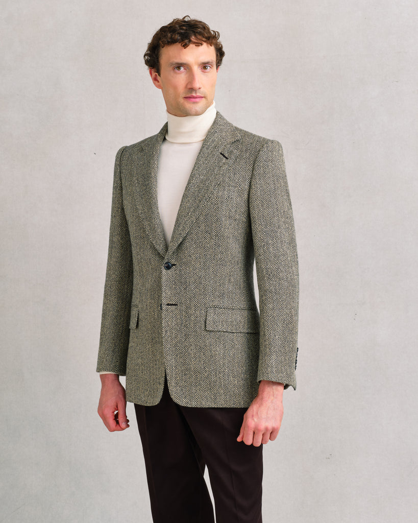 Sports jacket that balances British tradition with Sexton refinement. Woven in a dark chocolate brown and light beige herringbone, the cloth has a bold one-inch repeat that makes the texture clear and generous. Substantial in weight yet open in weave, it carries 10% silk for a touch of softness and elegance. Cut with a notch lapel, the jacket feels classic, versatile, and chic—an autumn-winter piece that brings both texture and style.