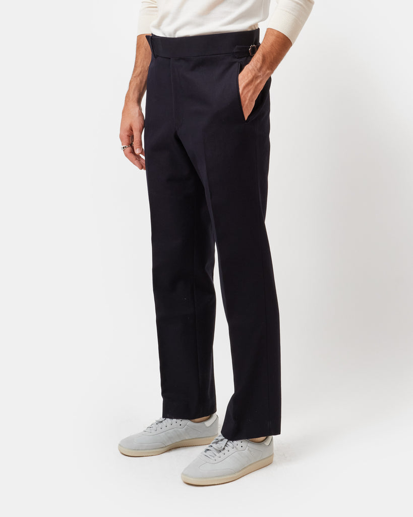Discover the perfect blend of style and comfort with the Midnight Cotton Canvas Classic Trousers. These trousers pair seamlessly with the matching jacket to form a timeless suit. However, their classic design and cotton canvas fabric make them equally appealing as separate pieces. Elevate your everyday attire with these trousers, offering versatility and refined charm.