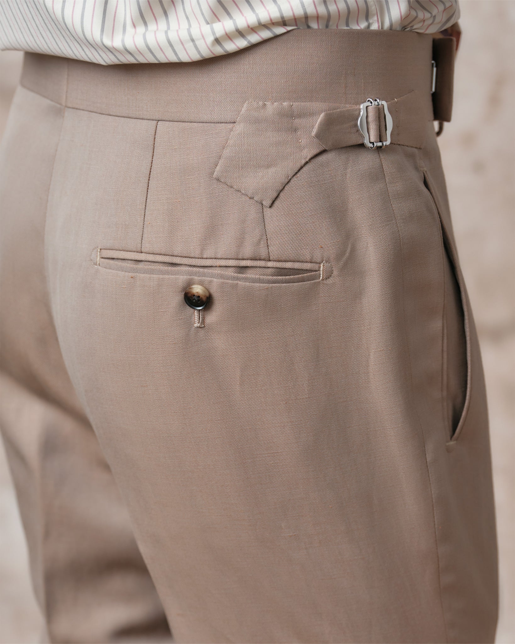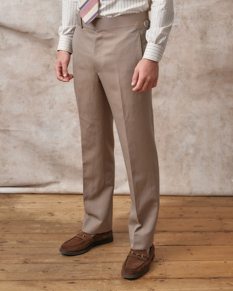 A perfect trouser to complete a multitude of summer outfits. Cut from a wonderfully light wool linen blend sepia tone cloth with a subtle peached finish.