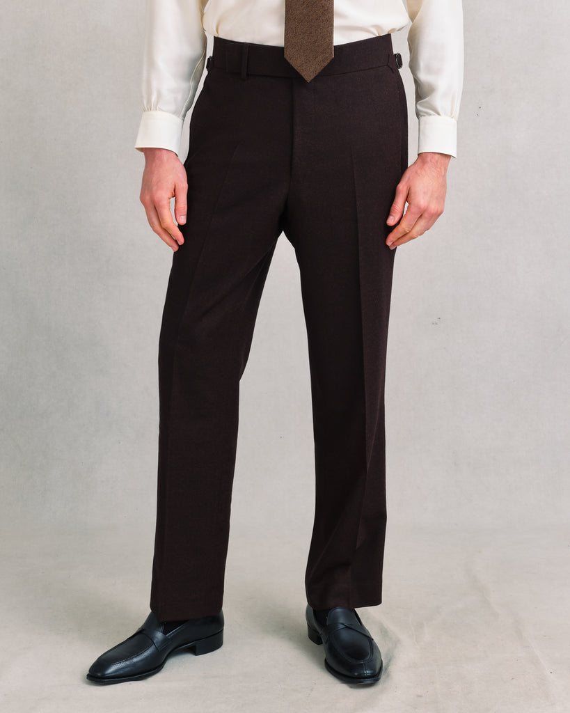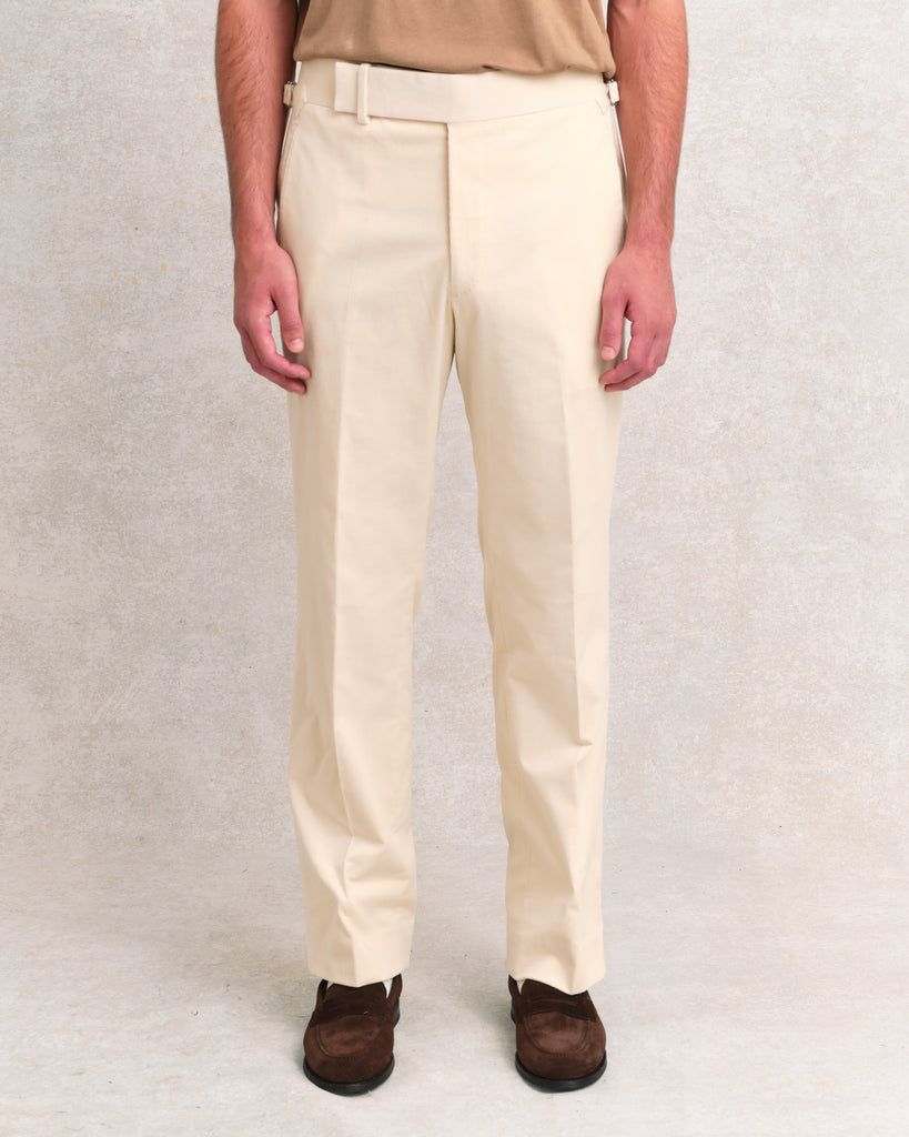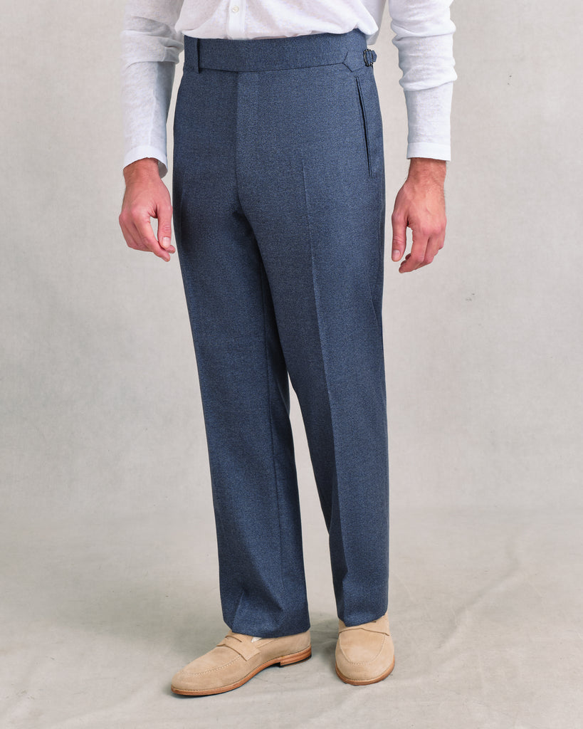 Our plain front trousers that are close fitting up top and fuller through the leg.