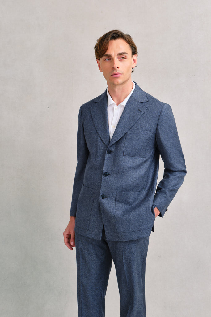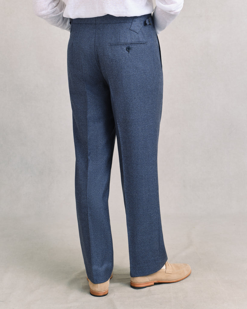 High-waisted and full in cut, these classic trousers are tailored in a 10oz flannel that mixes navy, sky blue, and grey into a textured RAF-inspired shade. The wide waistband and flowing leg bring balance and ease, making them versatile enough to wear as separates or with the control jacket for a complete look.