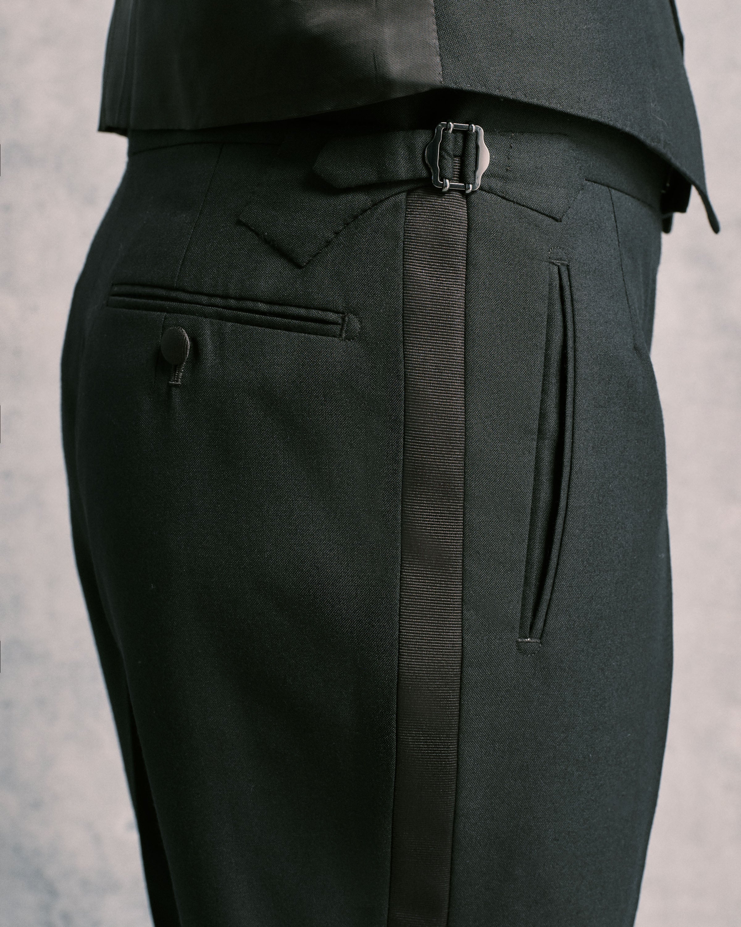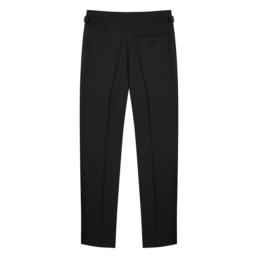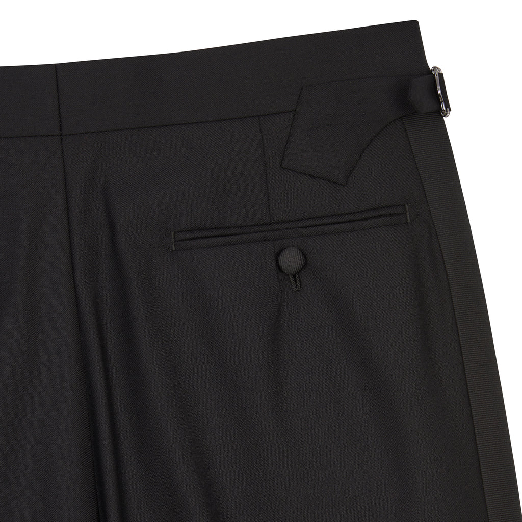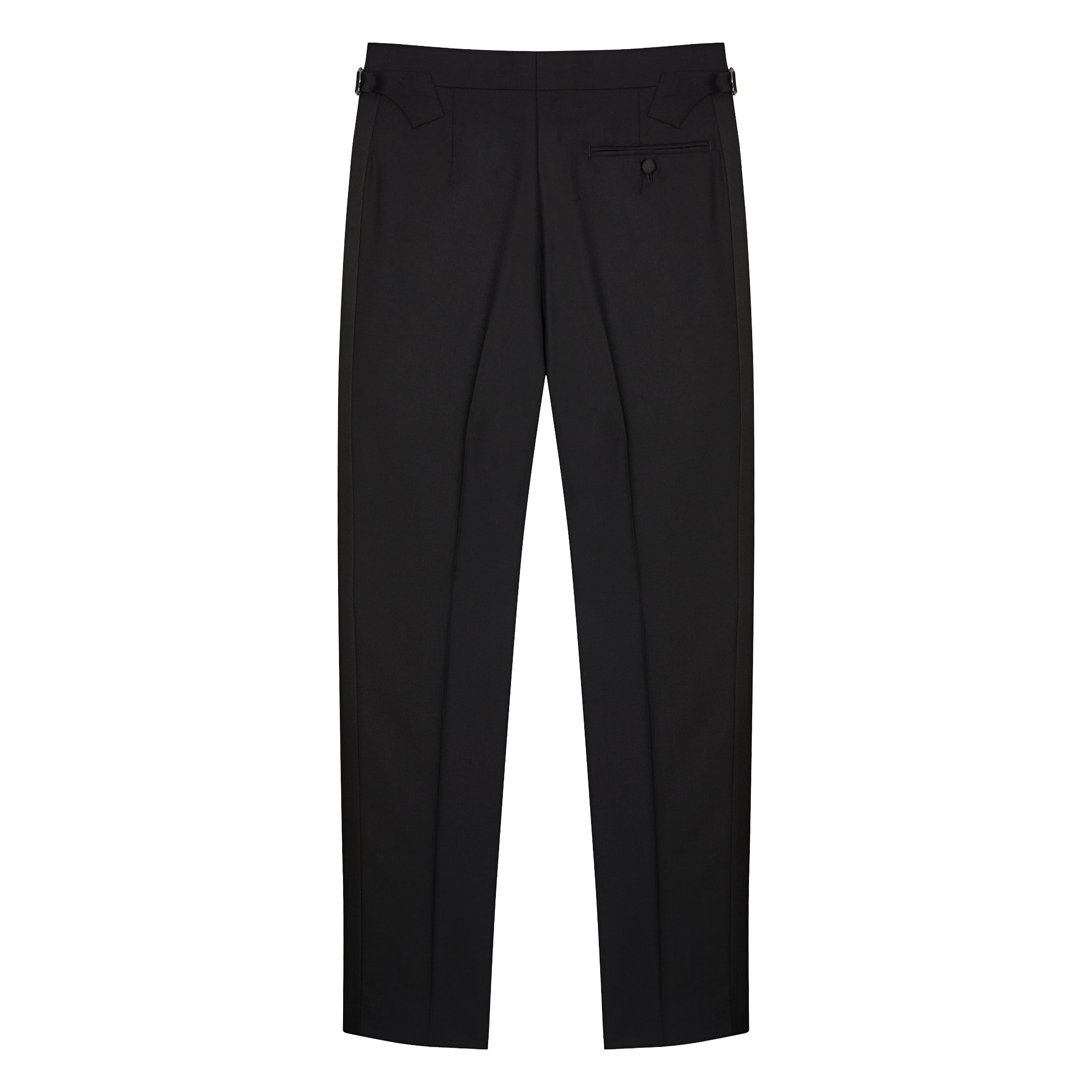 A clean, close and unfussy dress trouser, cut in a British black wool and featuring a grosgrain braid down the side of the leg. Our Contemporary trousers are simple and elegant without too much drape, yet still comfortable and with an elegant rise.