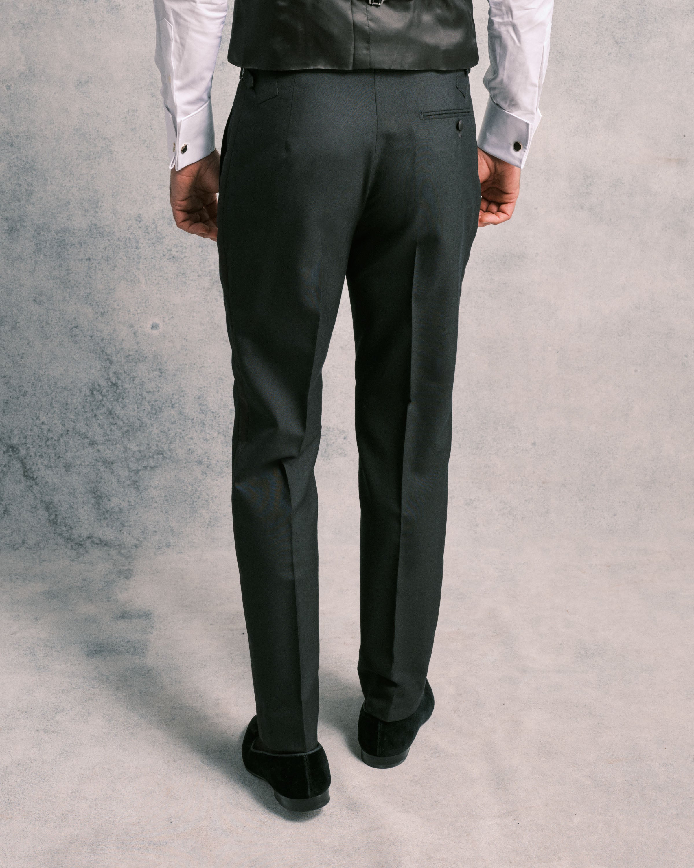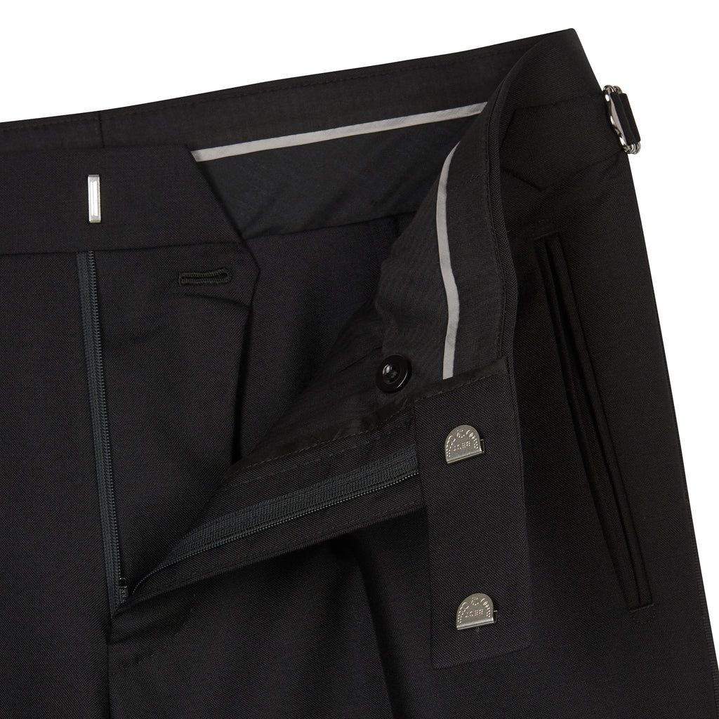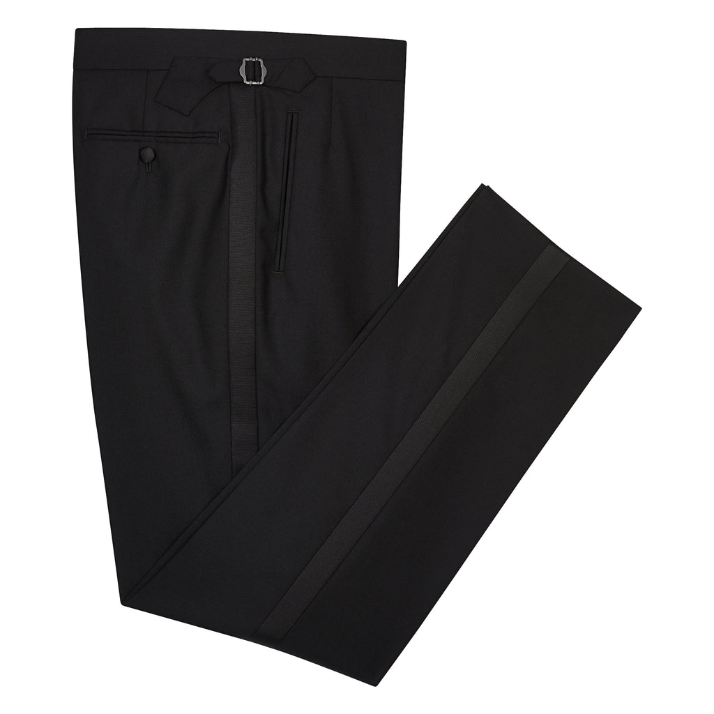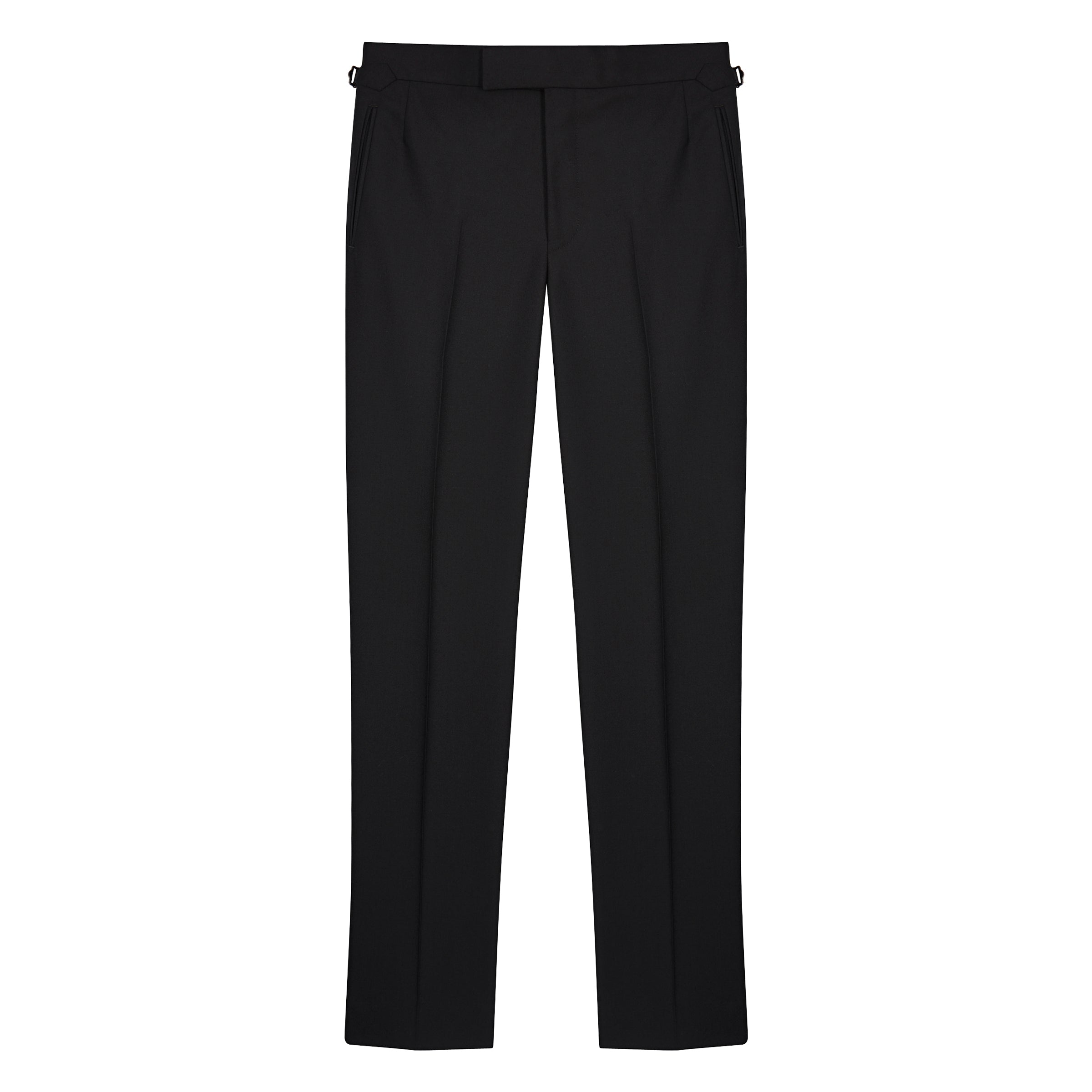 A clean, close and unfussy dress trouser, cut in a British black wool and featuring a grosgrain braid down the side of the leg. Our Contemporary trousers are simple and elegant without too much drape, yet still comfortable and with an elegant rise.