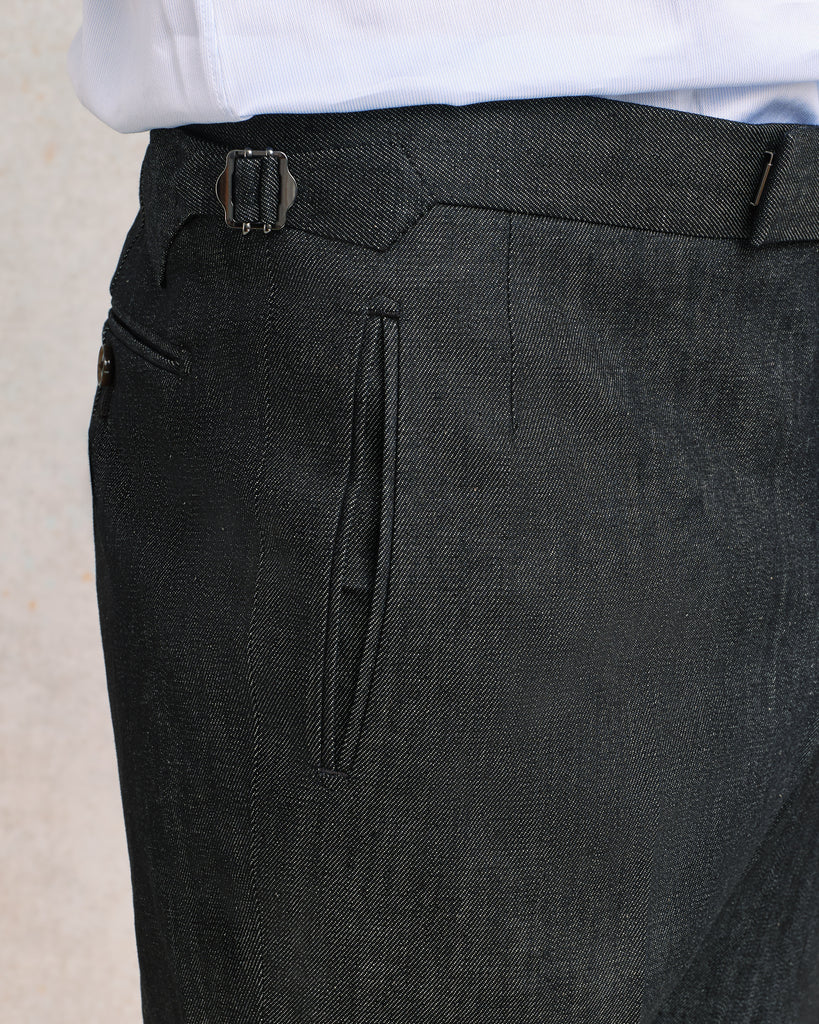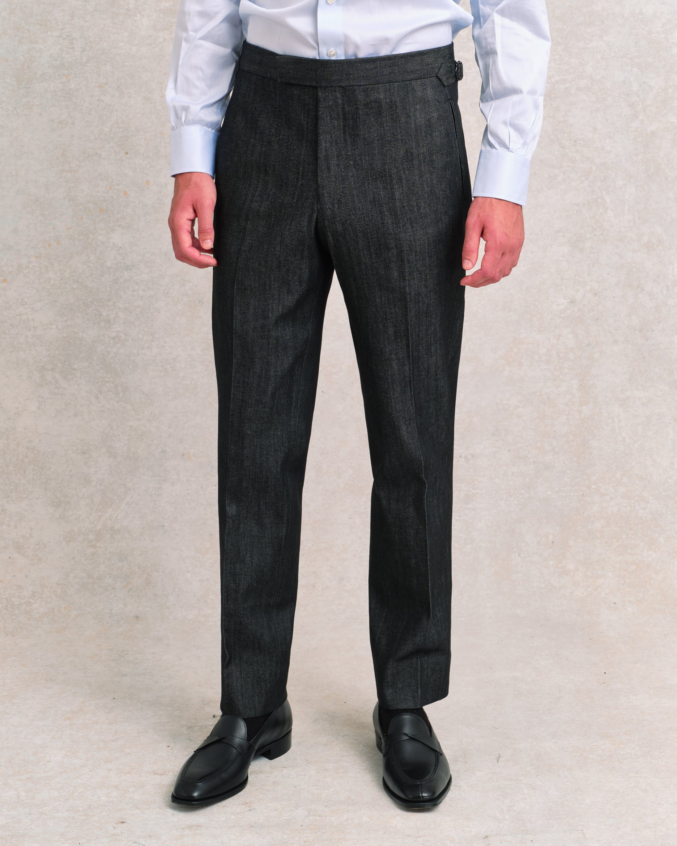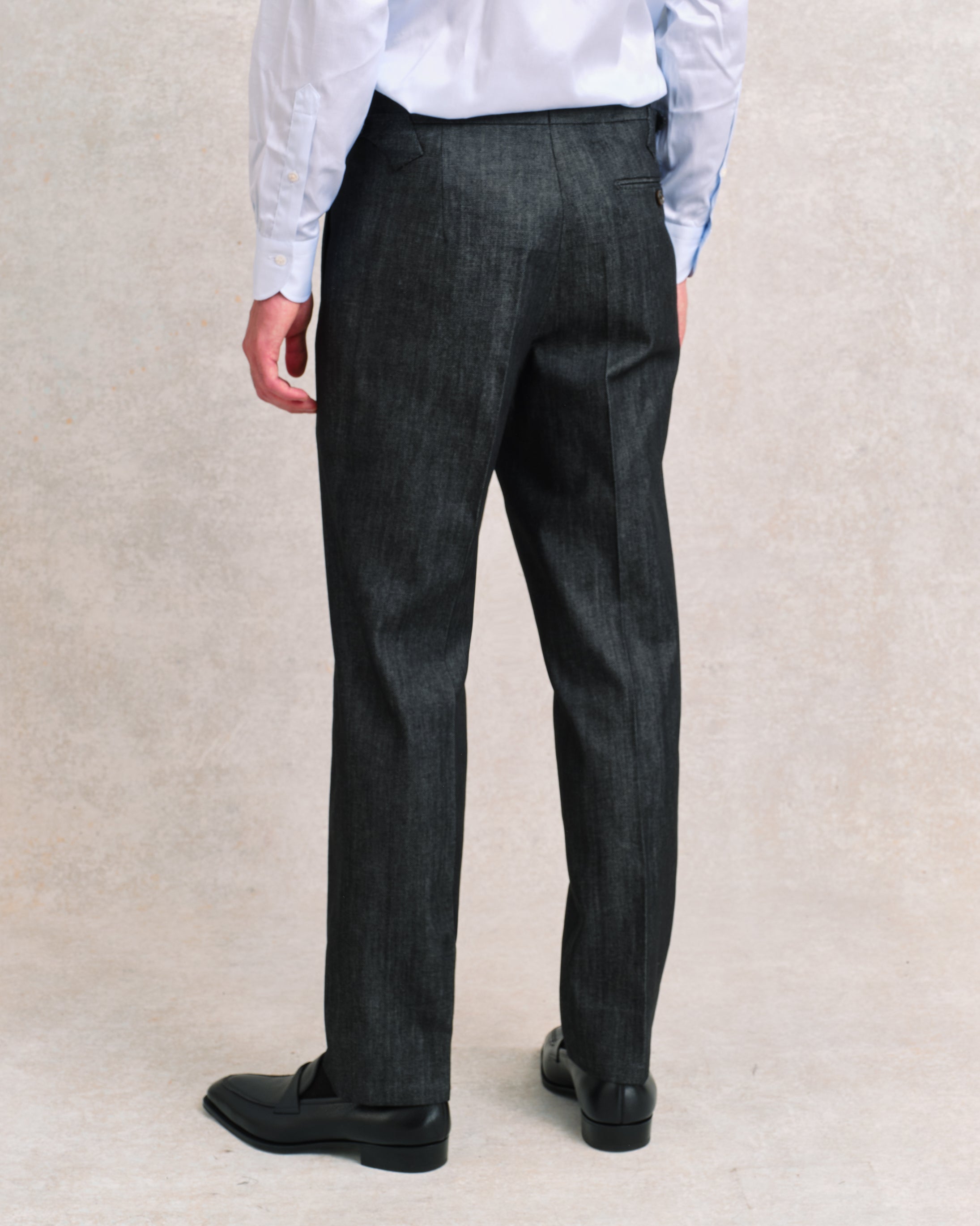 A refined take on denim. Cut in a substantial 510g cotton, the cloth combines black and pale grey yarns to create a dark charcoal tone with depth and elegance. The contemporary cut gives a clean, modern line, making the trousers versatile enough for day or evening. Robust yet smart, they pair easily with tailoring or casual pieces—an understated alternative to classic black trousers.