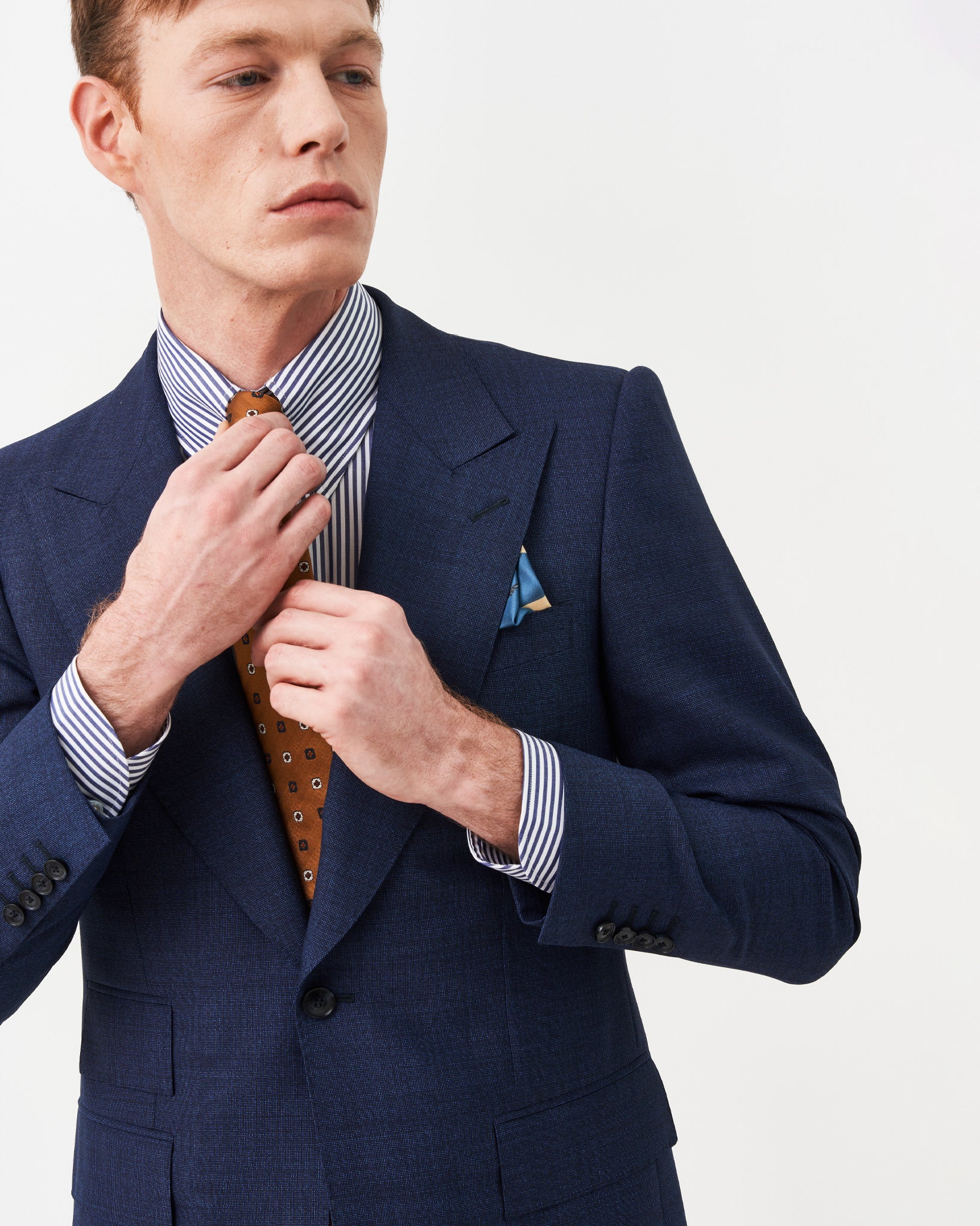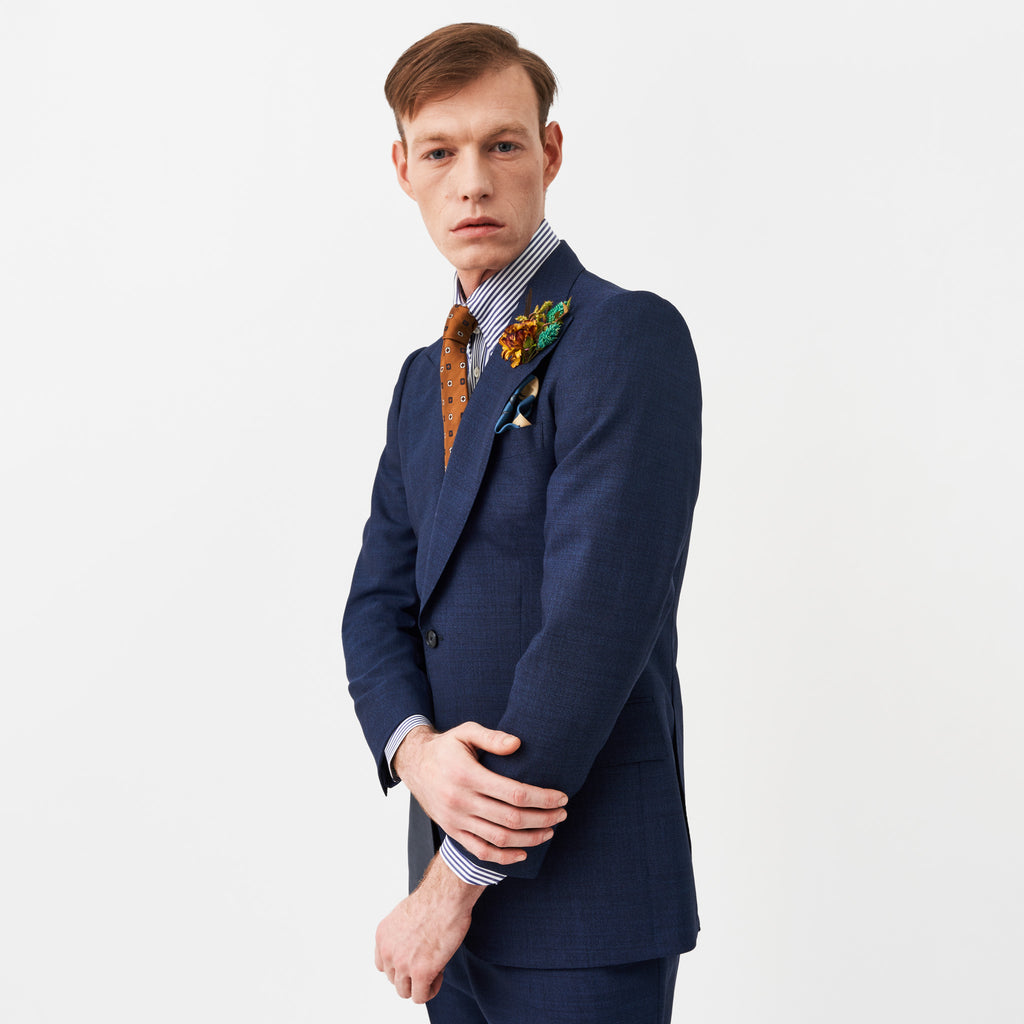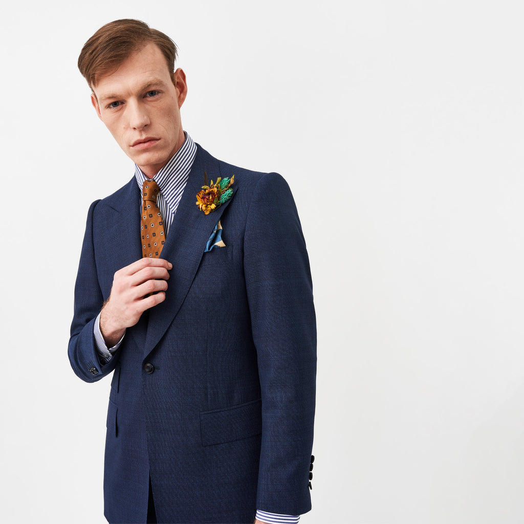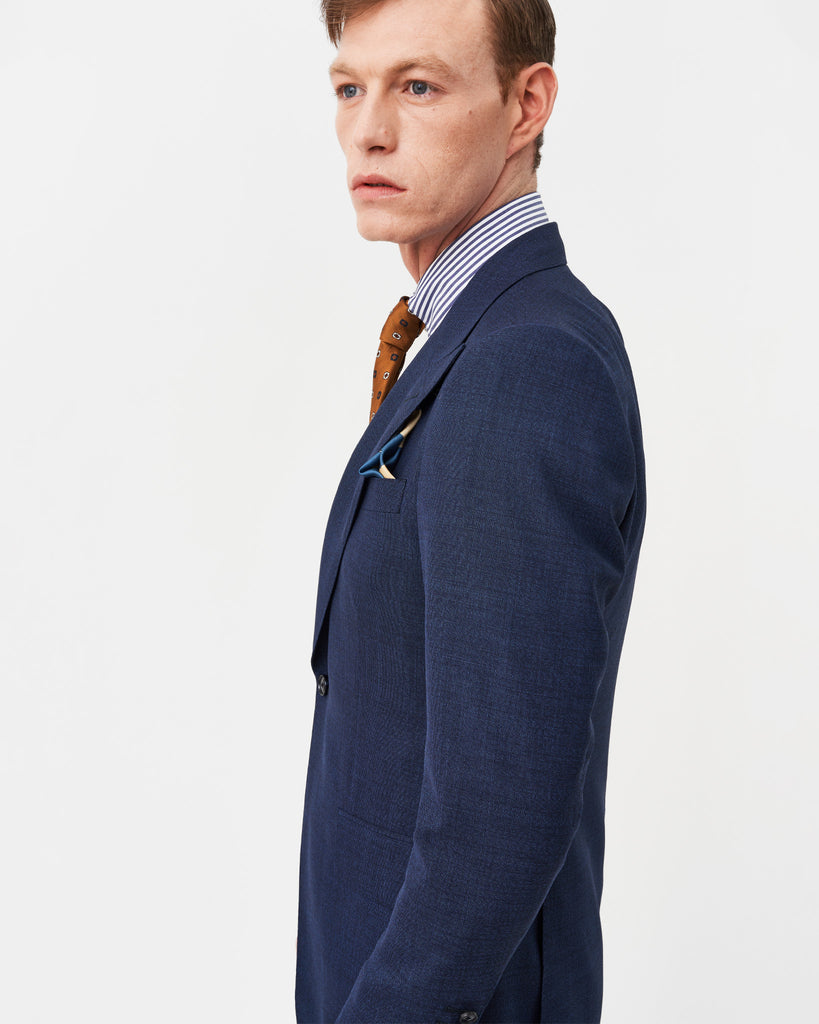 A modern classic summer suit, rich in texture in a fresh shade of blue formal enough for any occasion, but with a sense of modernity. The brown horn buttons add a subtle contrast and make the jacket work equally well as a blazer and a suit jacket.