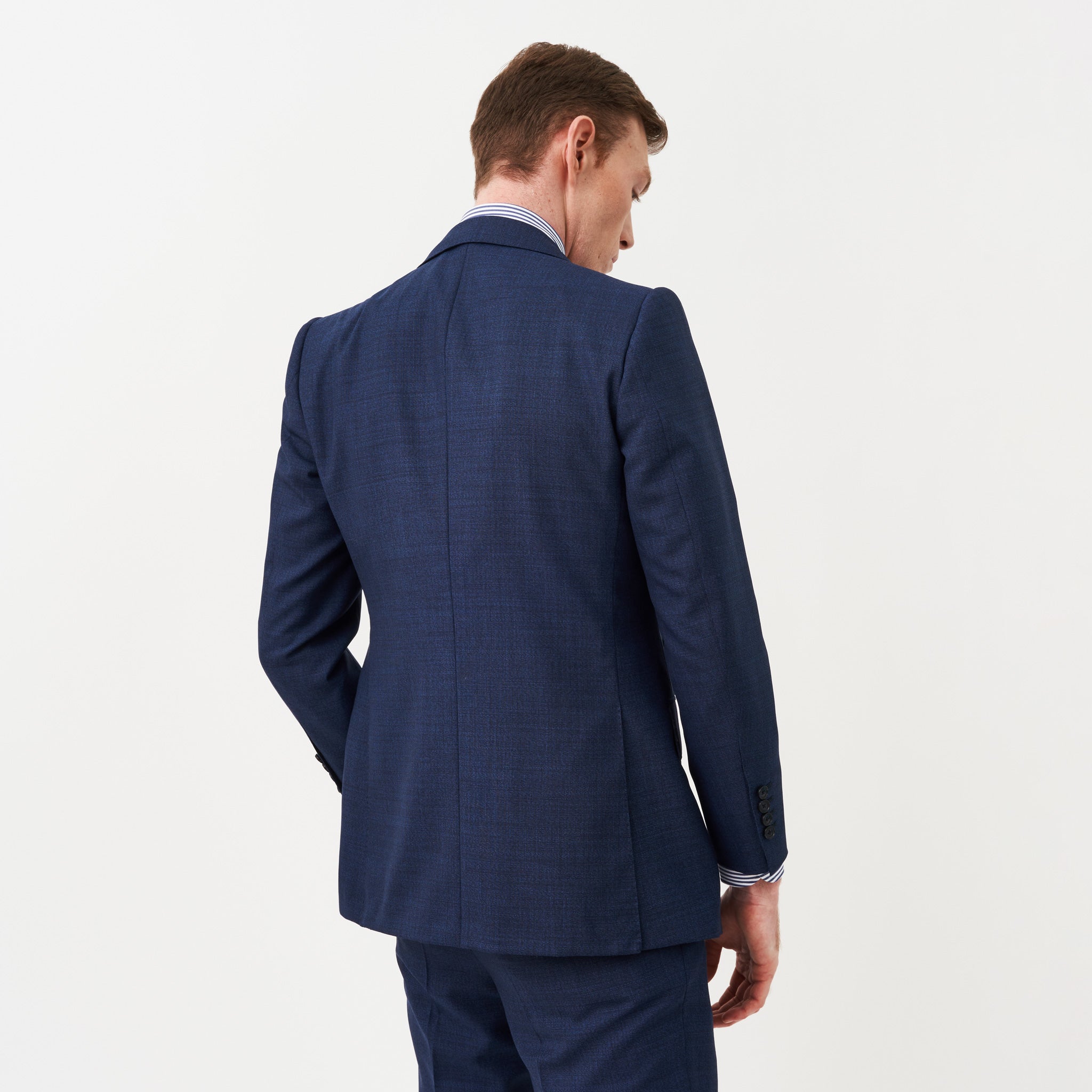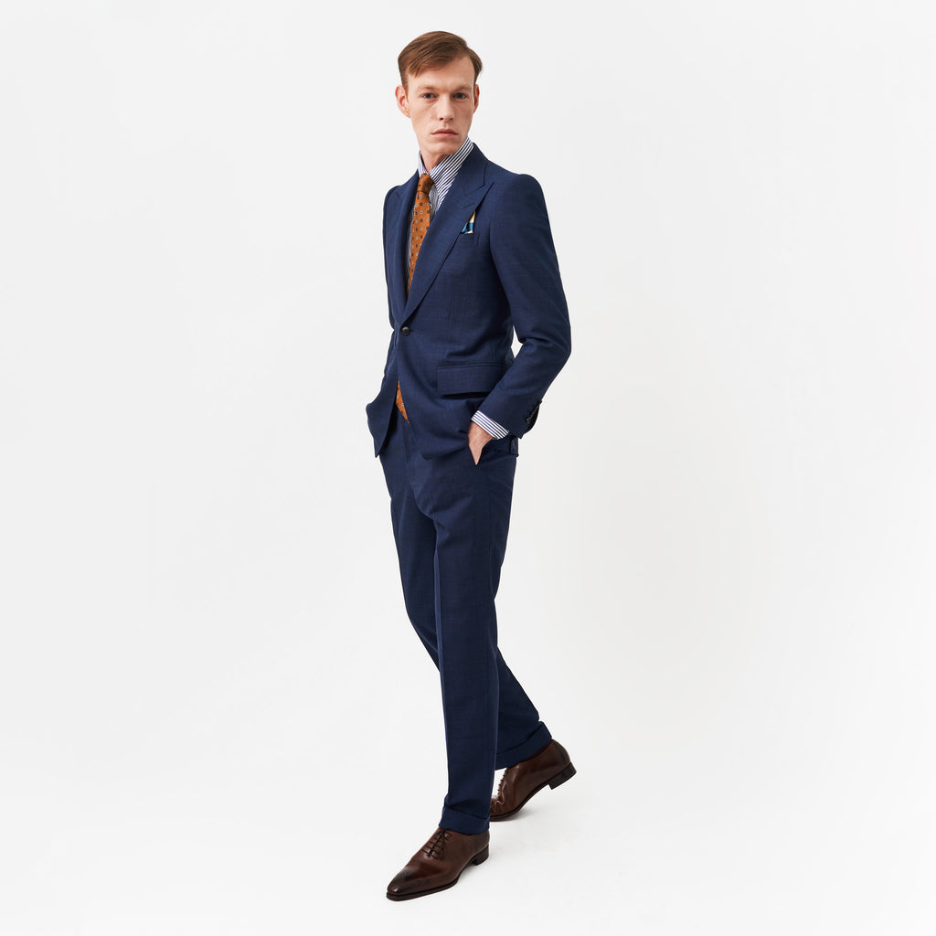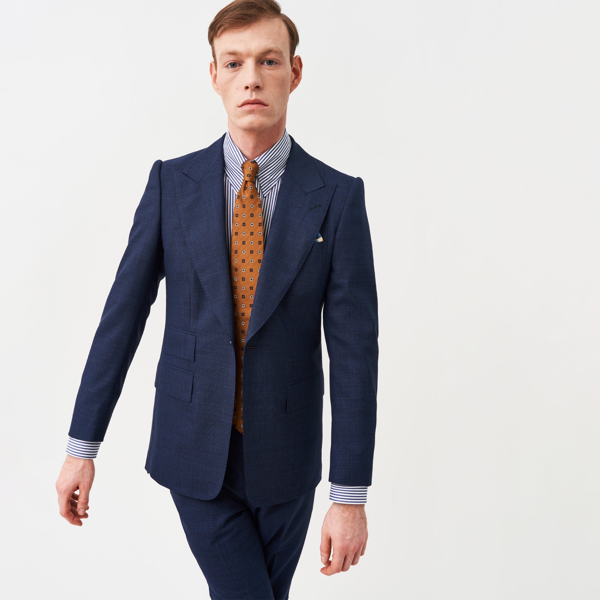 A modern classic summer suit, rich in texture in a fresh shade of blue formal enough for any occasion, but with a sense of modernity. The brown horn buttons add a subtle contrast and make the jacket work equally well as a blazer and a suit jacket.