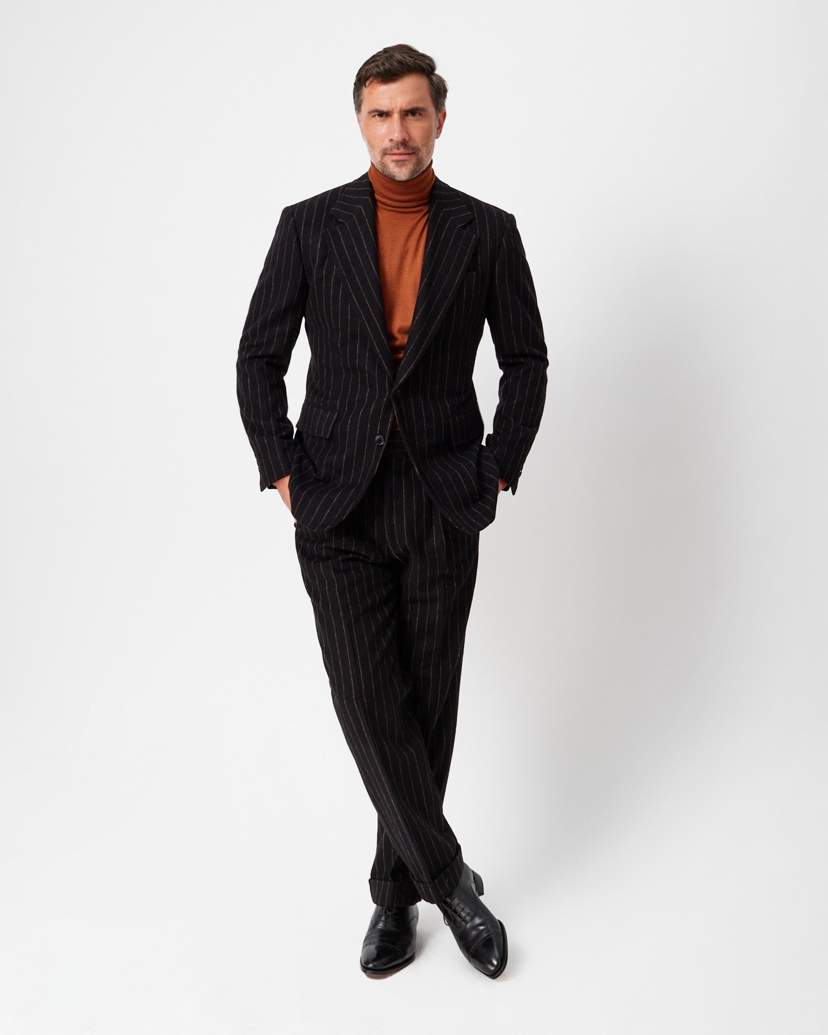 The Edward Sexton Heritage Trousers • a sartorial romance for those who appreciate timeless elegance with a touch of nostalgia. Our Heritage Trousers draw inspiration from the classic mid-century style, embodying the essence of an era known for its sophistication and grace. These trousers feature a high rise, generous legs, and two deep, forward-facing pleats on each side of the waist. This design creates a captivating illusion of a slim waist and hips while forming the bottom half of the coveted hourglass shape that begins with our jackets. To further enhance the elegance, we add signature pistol-shaped side straps and slant-jet pockets to our Heritage Trousers. These meticulously crafted details ensure a clean, fluid line through the leg, reflecting our commitment to impeccable tailoring. With Edward Sexton Heritage Trousers, you step into a world of classic charm and timeless style, where every detail is thoughtfully designed to create an effortlessly refined silhouette.