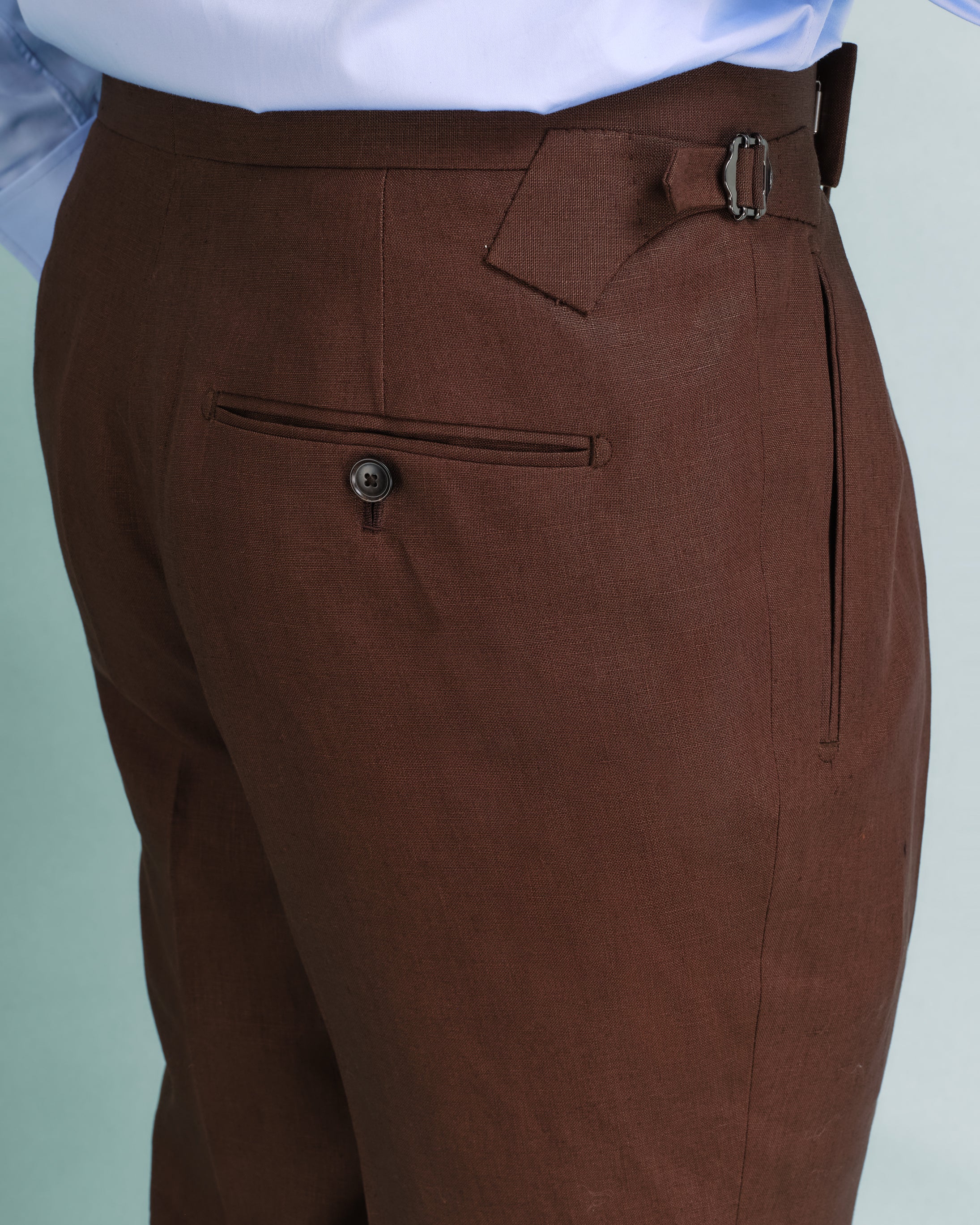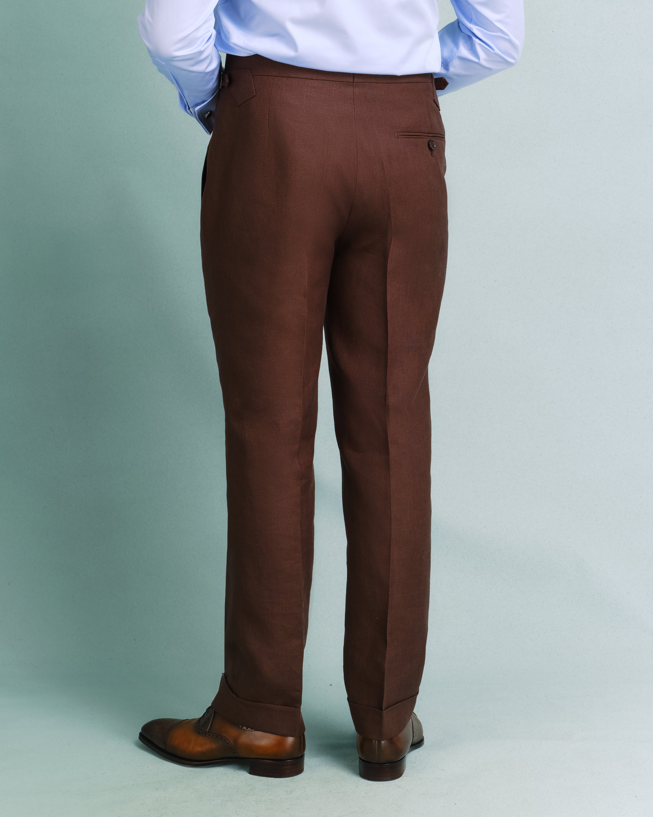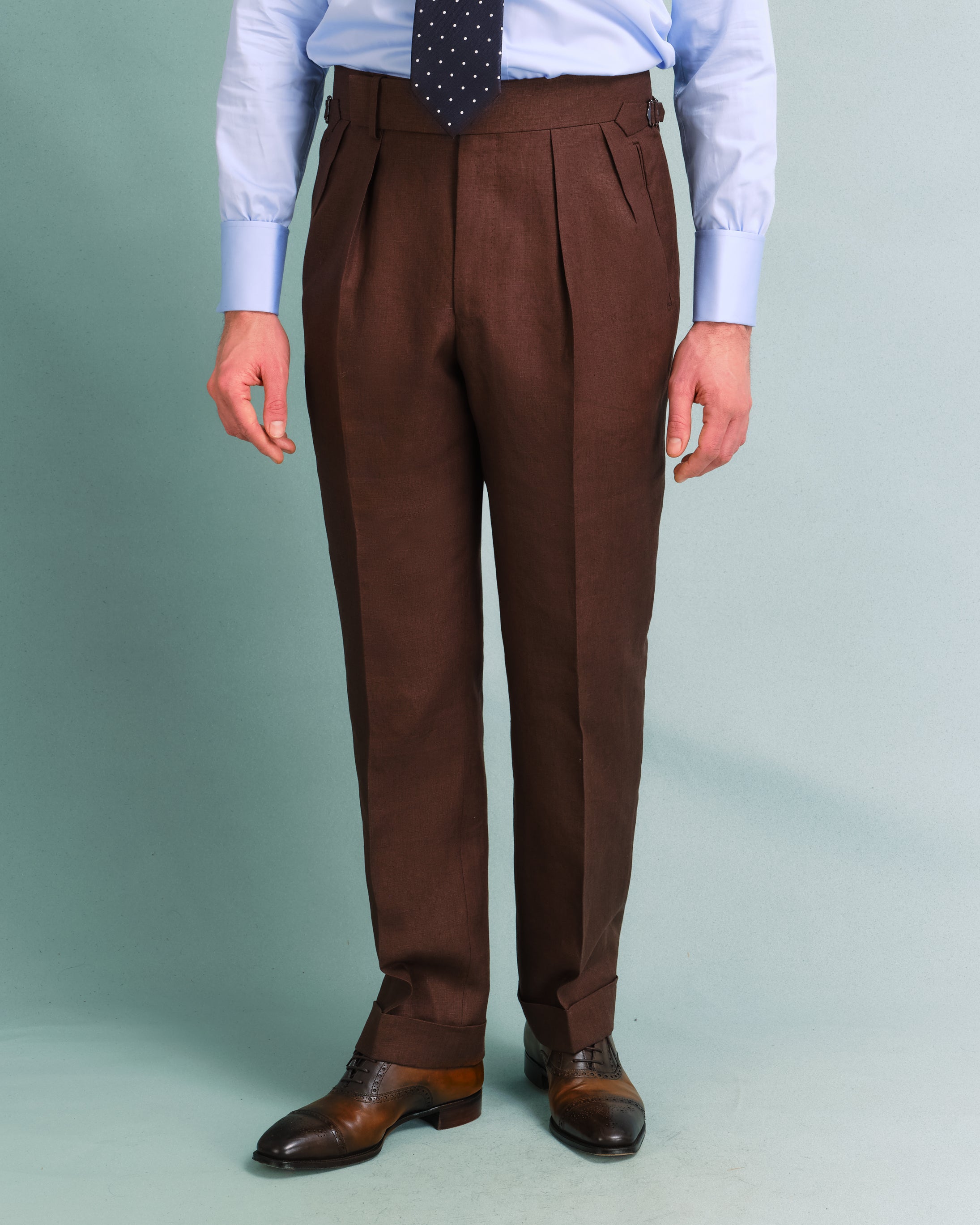 As a suit with the matching jacket or paired with a separate sports jacket, our chocolate brown Irish linen pleated trousers are a robust summer wardrobe staple.