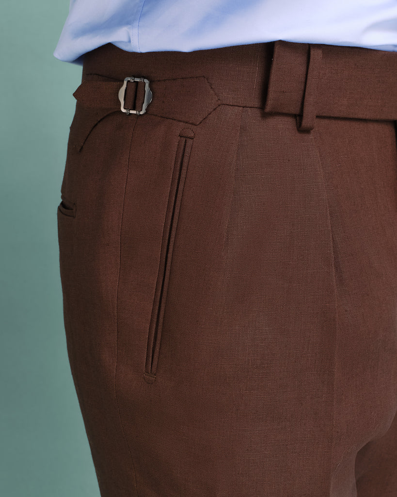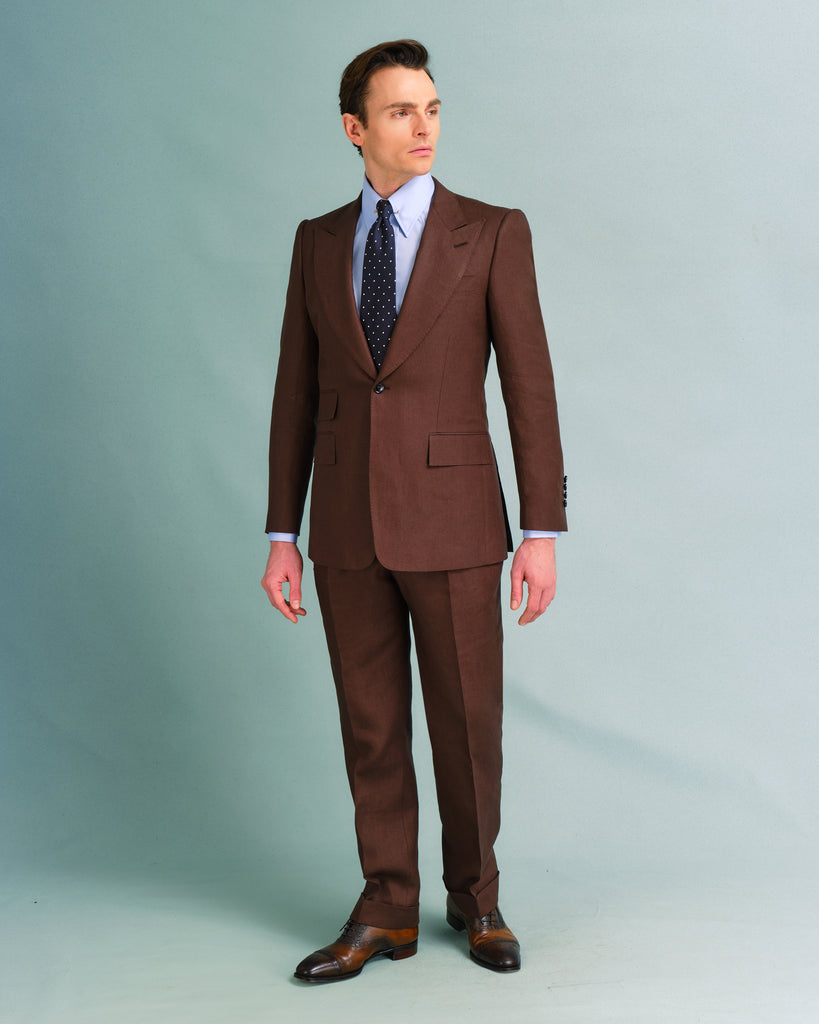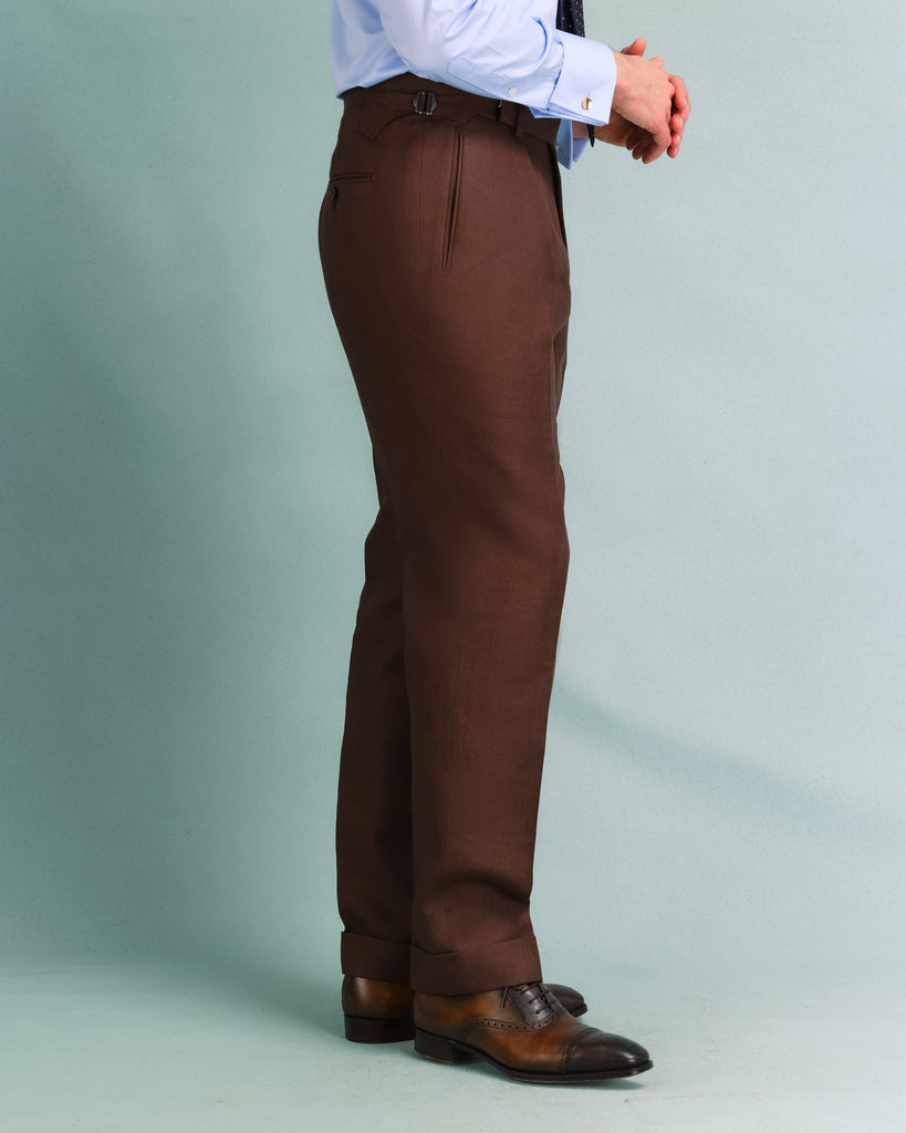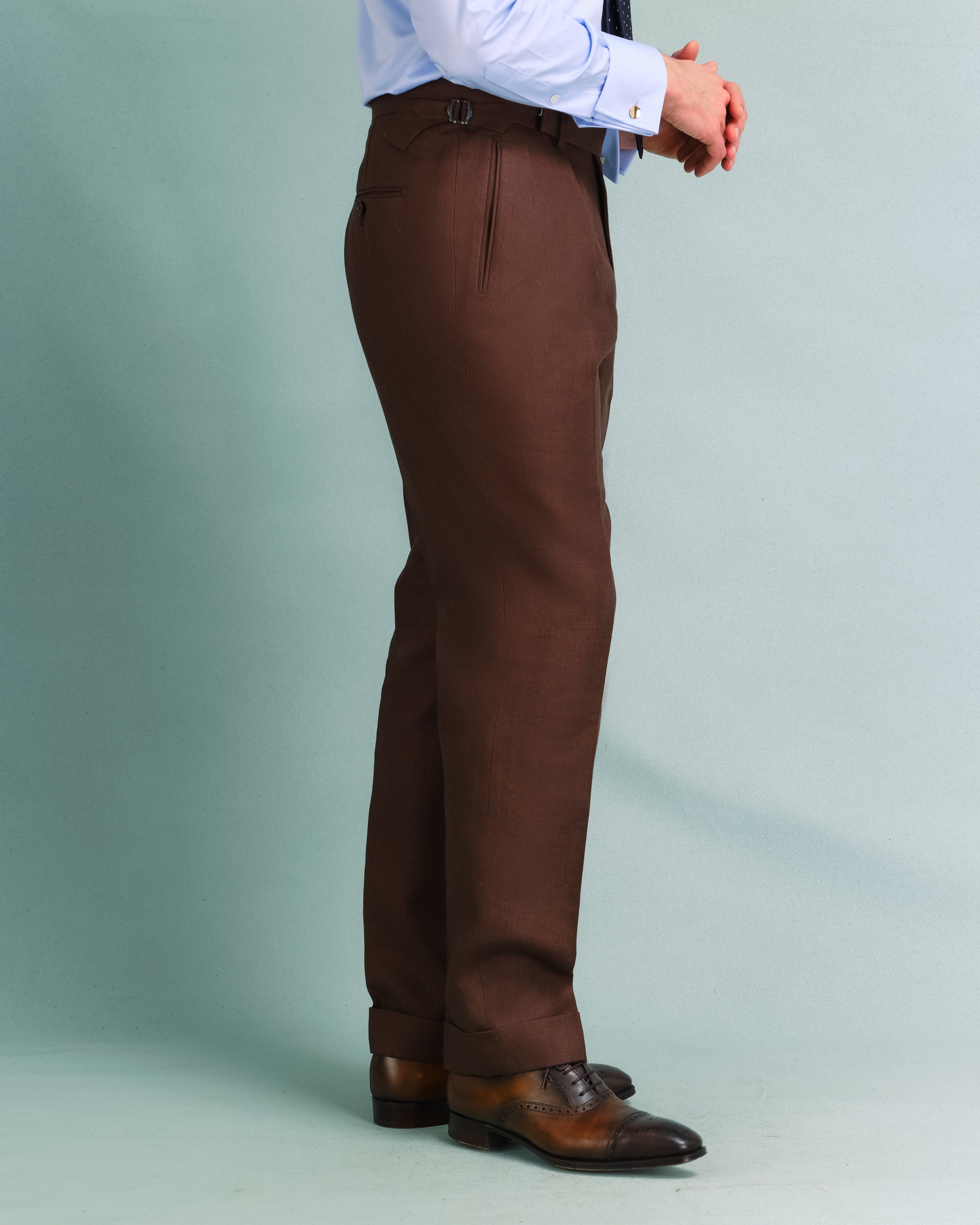 As a suit with the matching jacket or paired with a separate sports jacket, our chocolate brown Irish linen pleated trousers are a robust summer wardrobe staple.