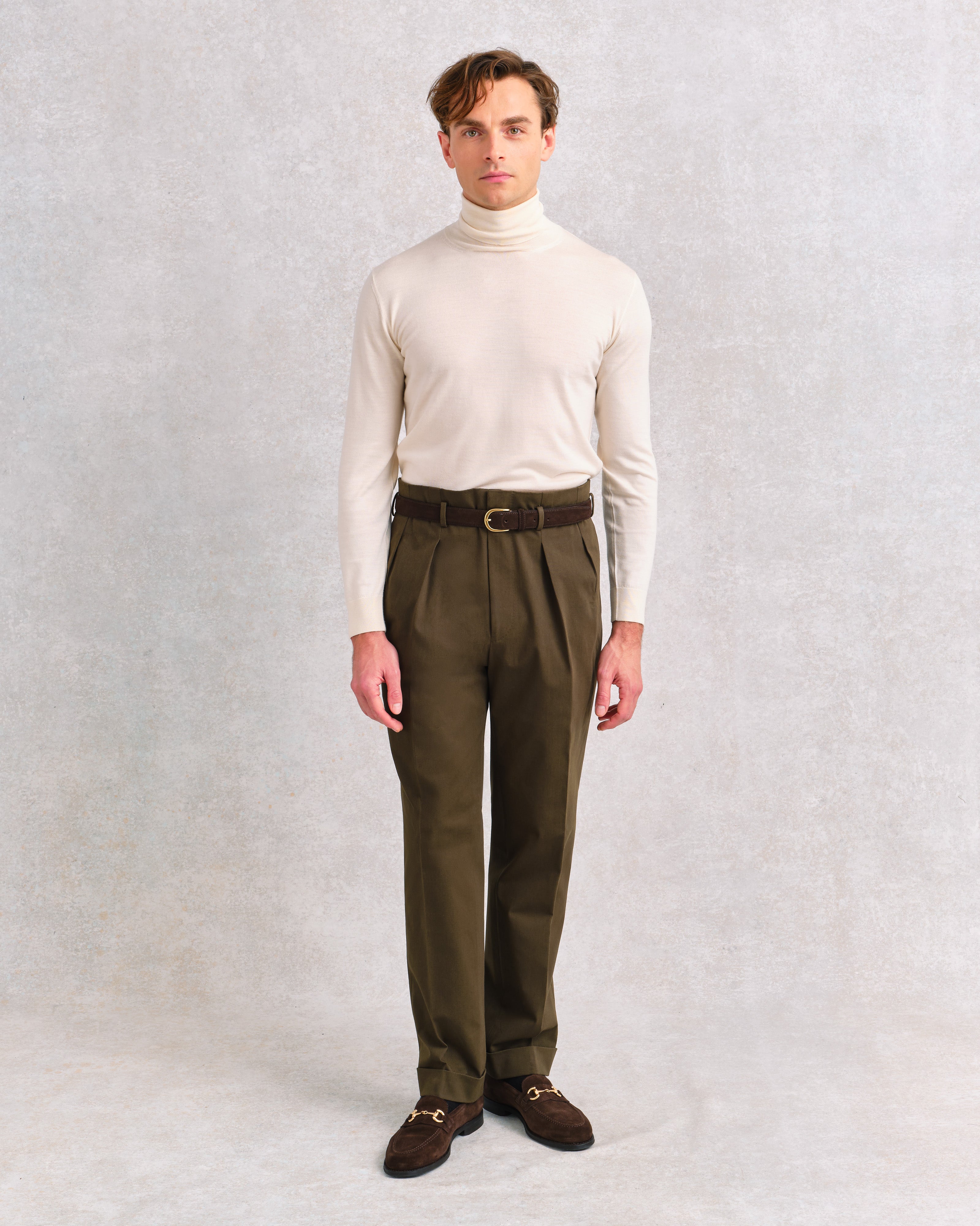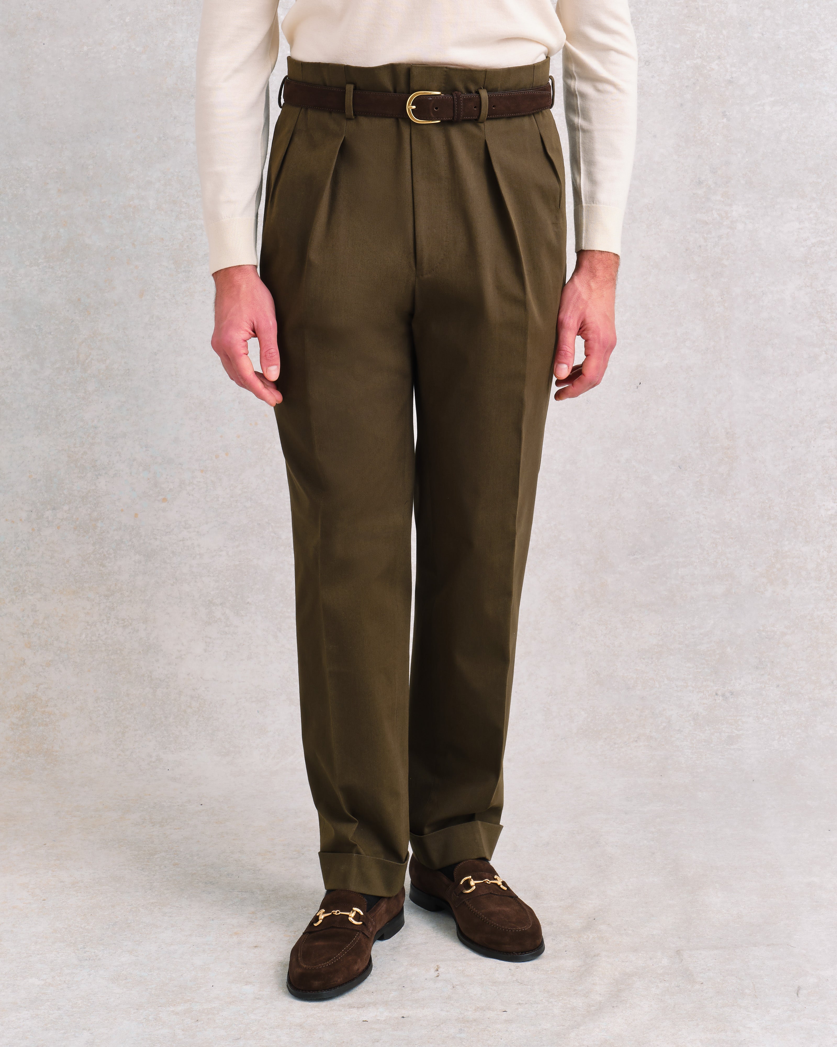 A relaxed take on Sexton tailoring with a nod to 1930s Hollywood. Cut in a dark moss green cotton twill with a smooth finish and reassuring weight, the trousers feature a soft Hollywood waistband with drop loops designed to be drawn in by a belt. A touch of stretch adds comfort without losing structure. Easy, versatile, and elegant, they work as refined casual trousers with knitwear, shirting, or a tailored jacket.