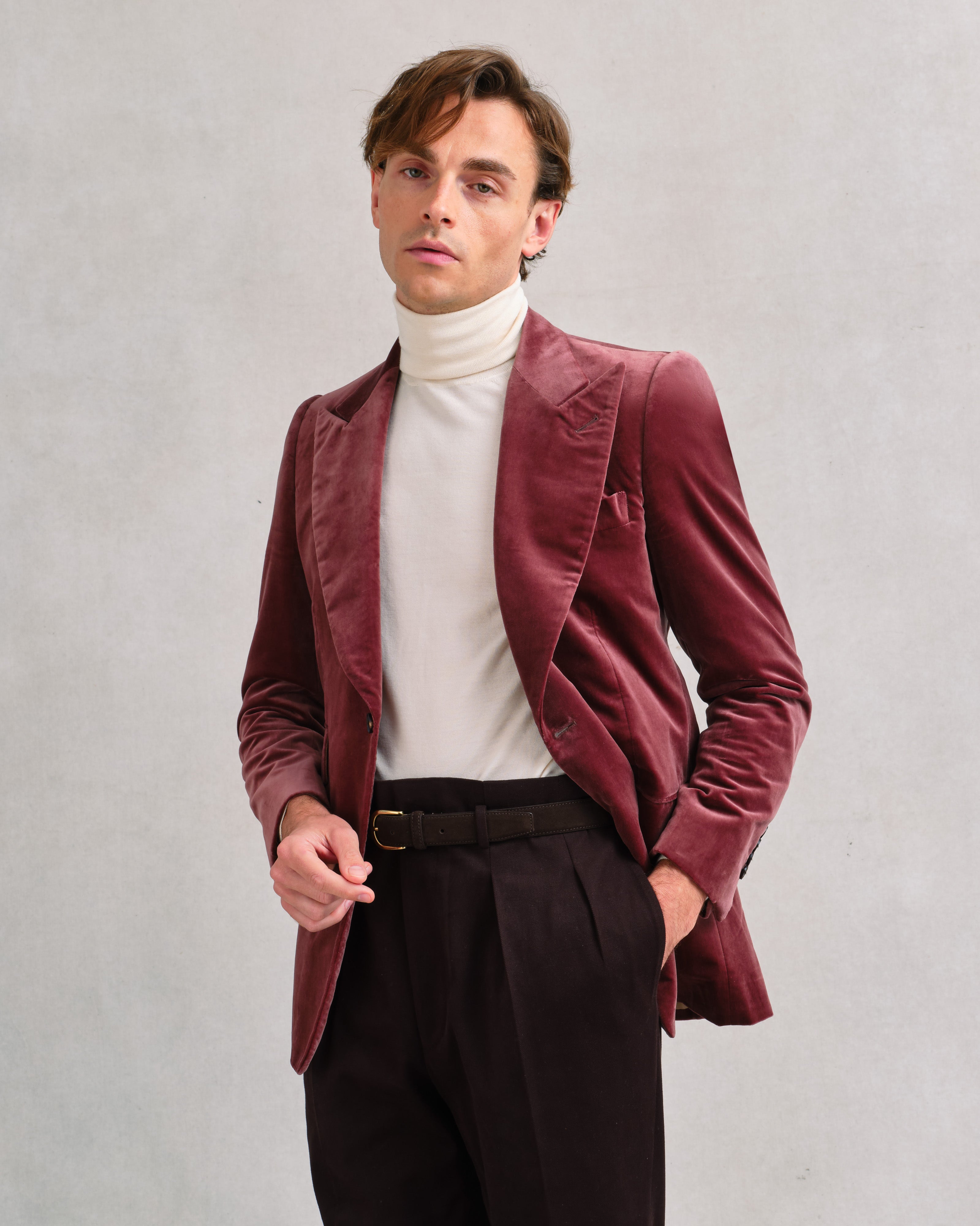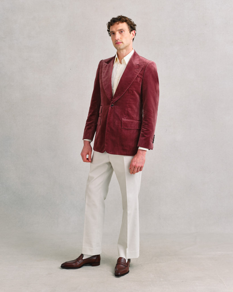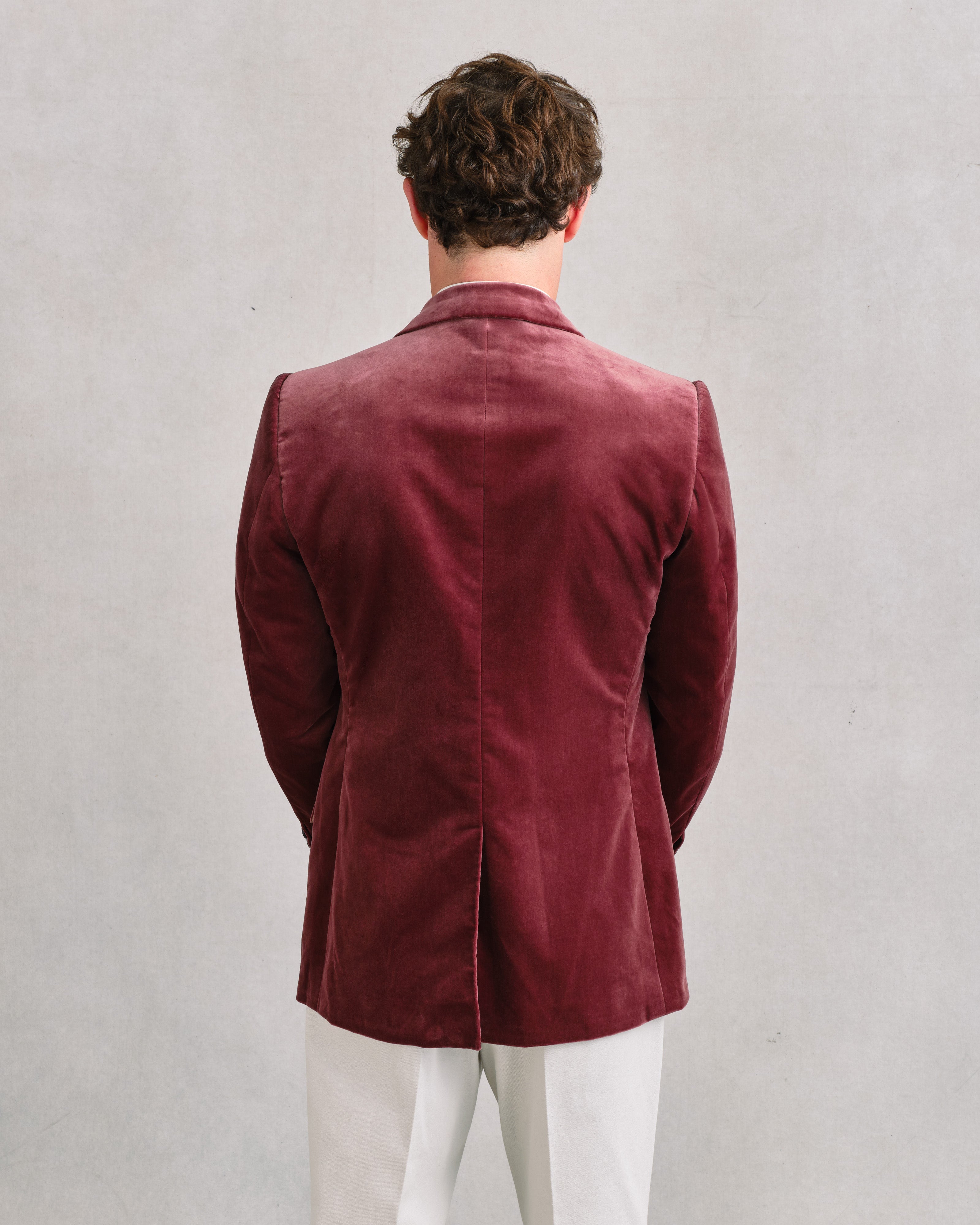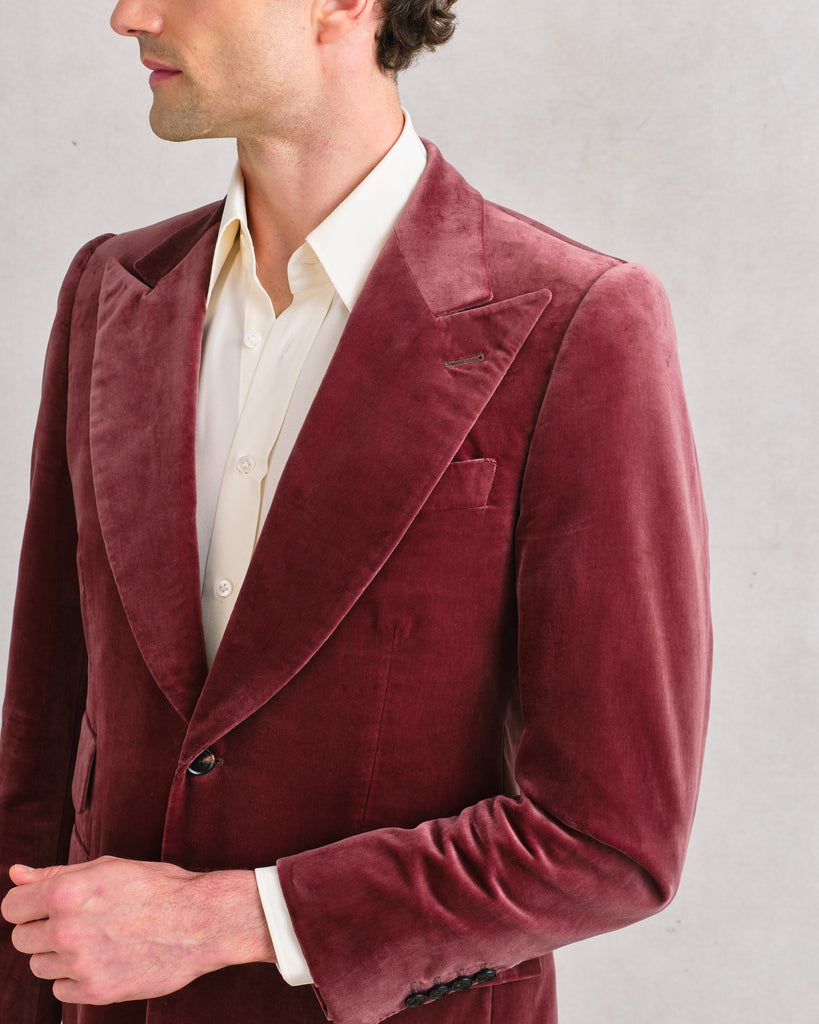 A refined Sexton jacket in soft cotton velvet with a pink-brown mauve tone and a subtle silvery sheen that catches the light beautifully. The earthy base keeps it grounded and versatile - elegant with darker colours like navy, black, or brown, yet easy with denim or white trousers by day. Cut on the heritage block for shape and presence, it’s a jacket that moves effortlessly between casual and evening wear, combining softness, lightness, and quiet glamour.