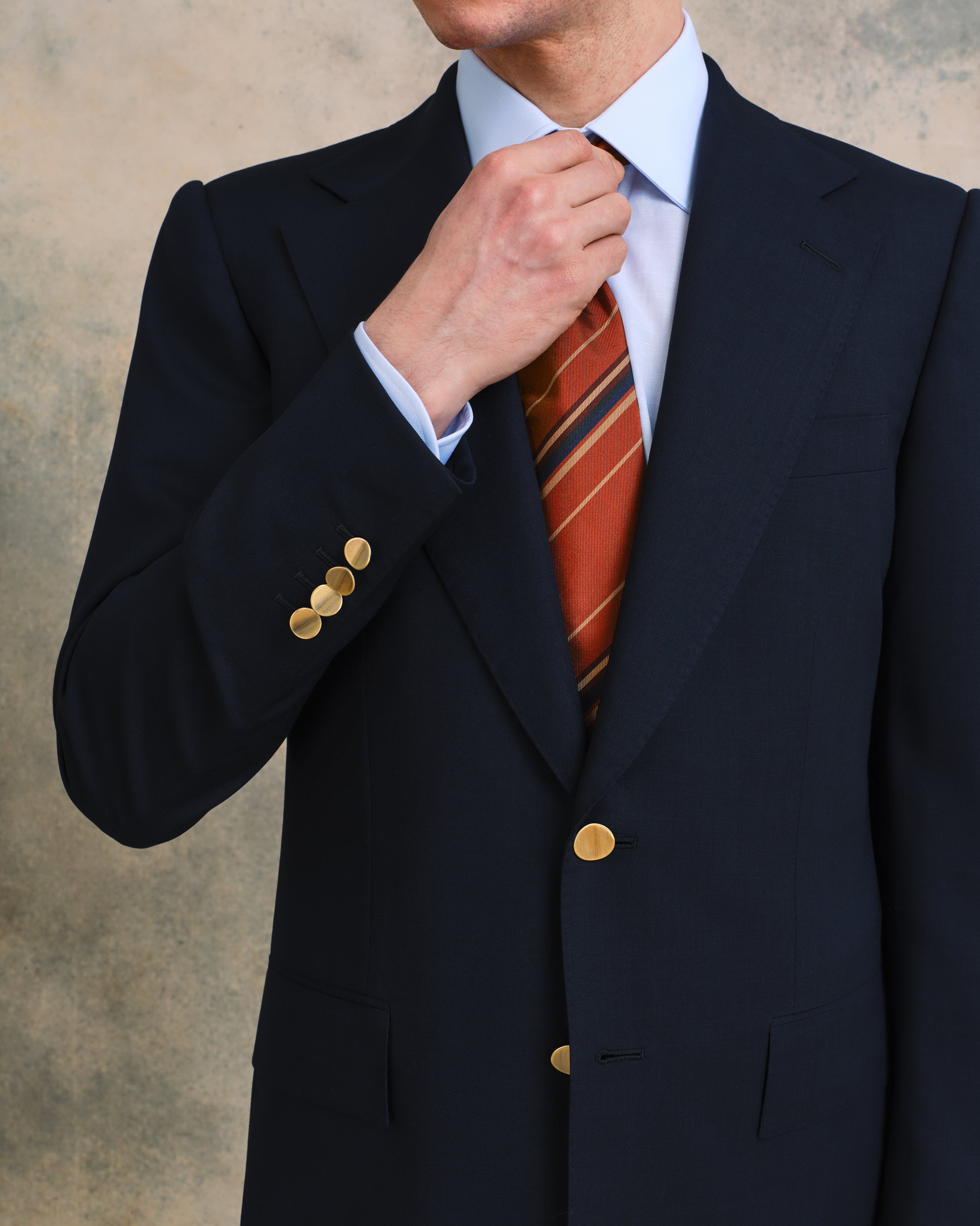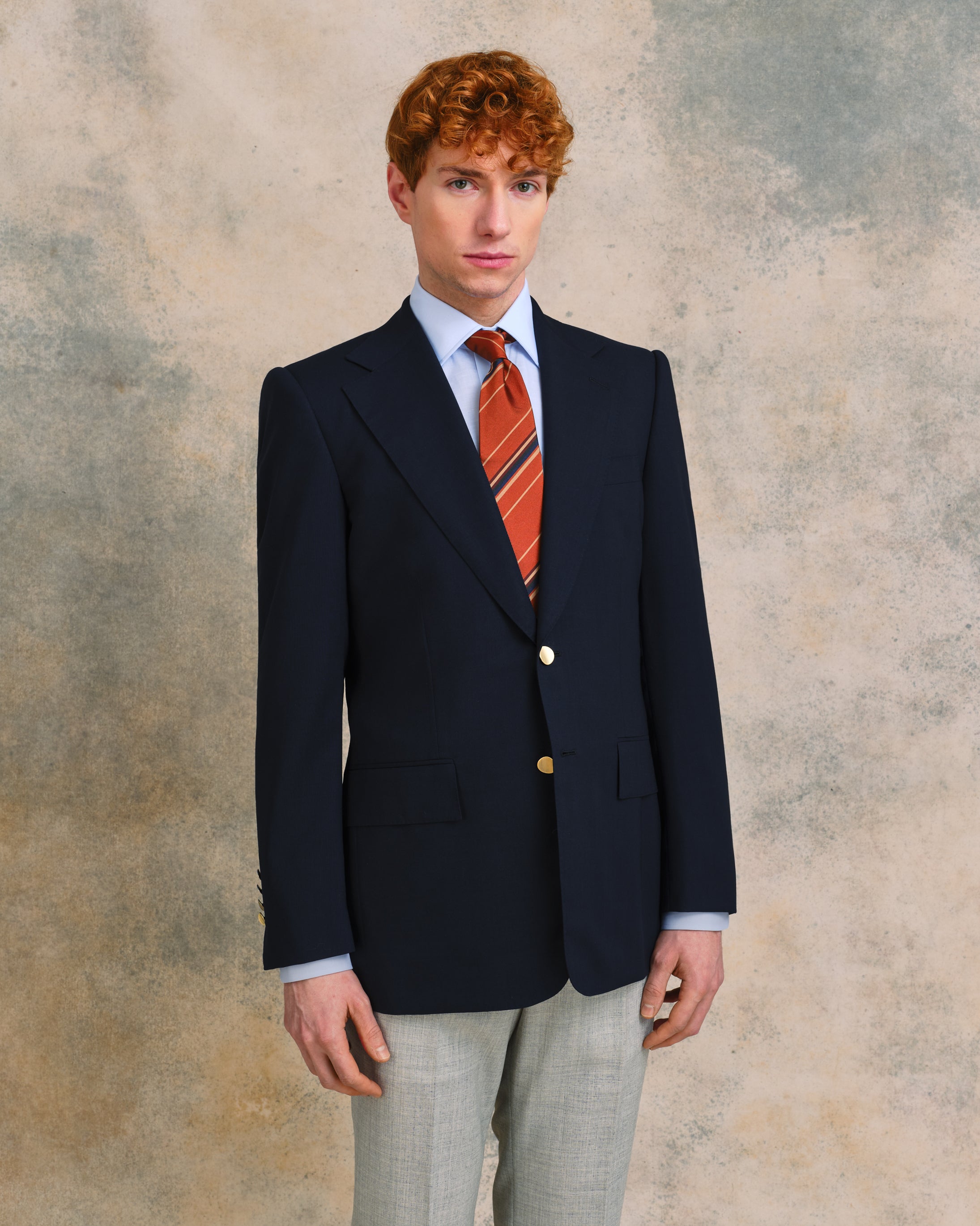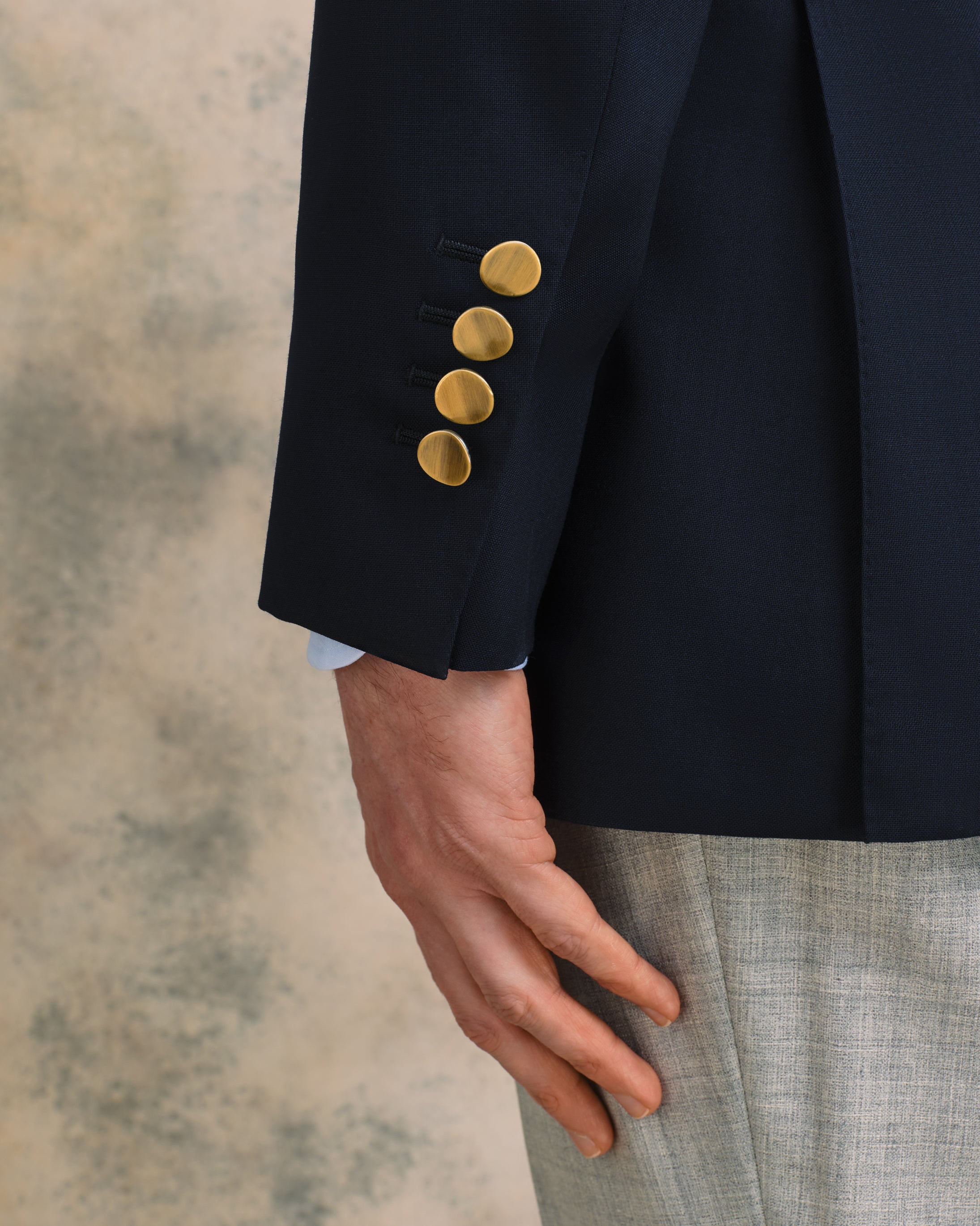 A Sexton summer staple, worn with easy confidence. The single-breasted version of our navy summer blazer is clean, contemporary, and completely versatile - a two-button notch lapel jacket in a breathable, high-twist open weave wool that travels well and resists creasing with ease. The signature concave brass buttons add the quiet Sexton flourish that sets it apart from any ordinary blazer. No ticket pocket, side vents. The kind of jacket you reach for without thinking and never want to take off.