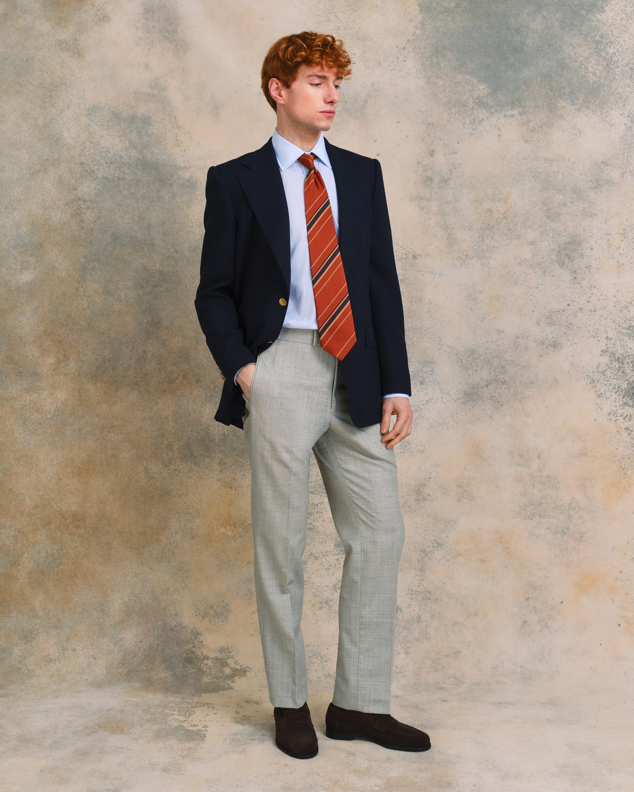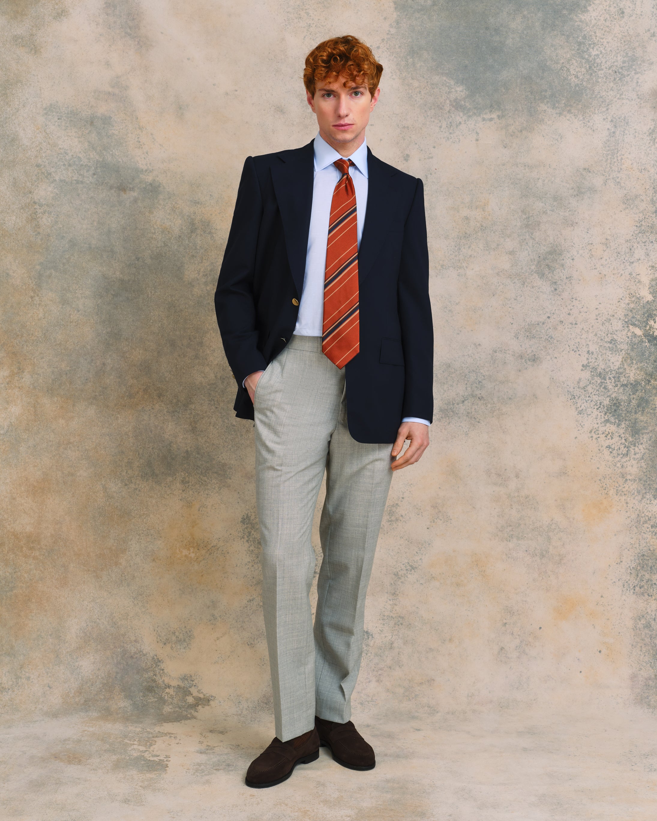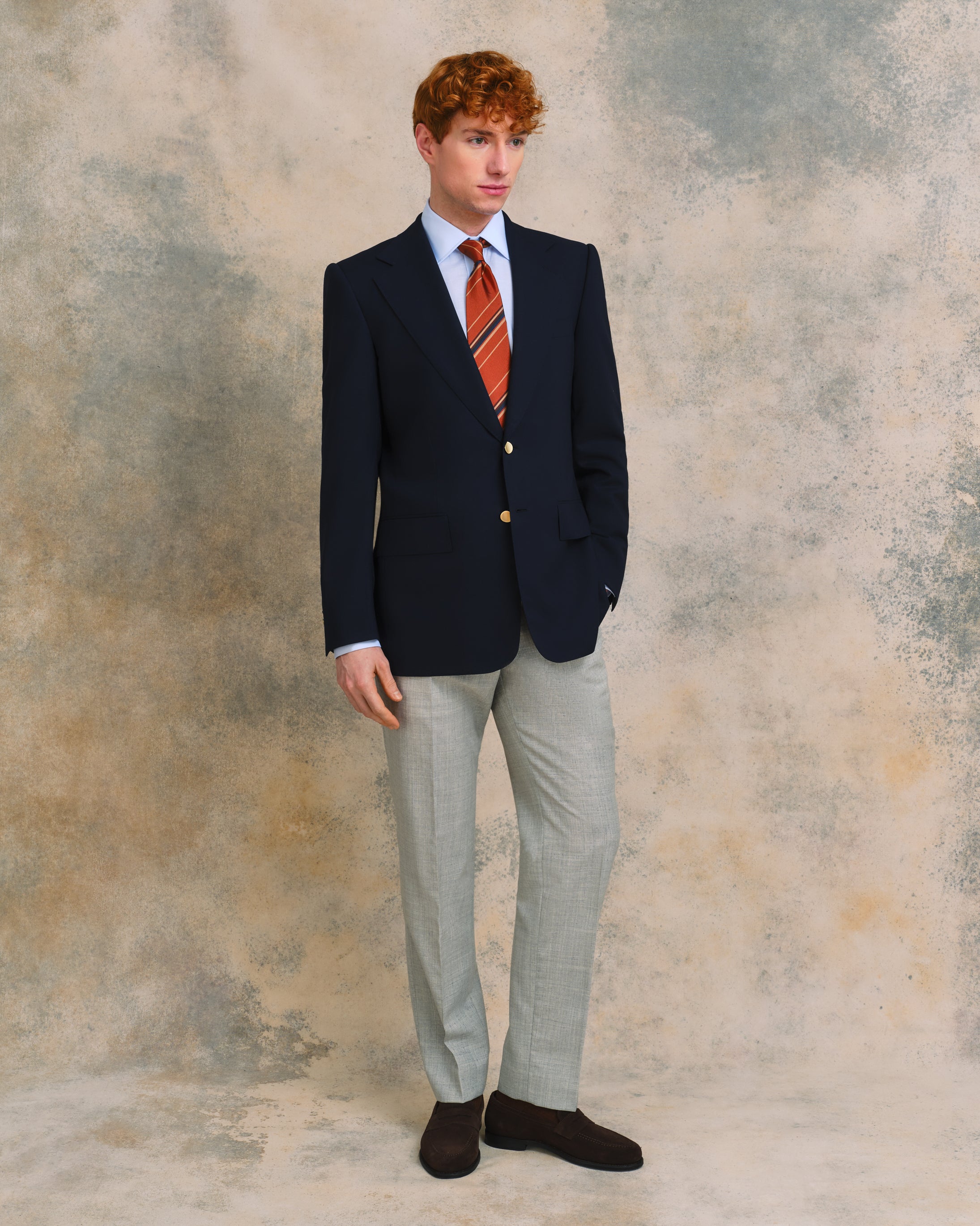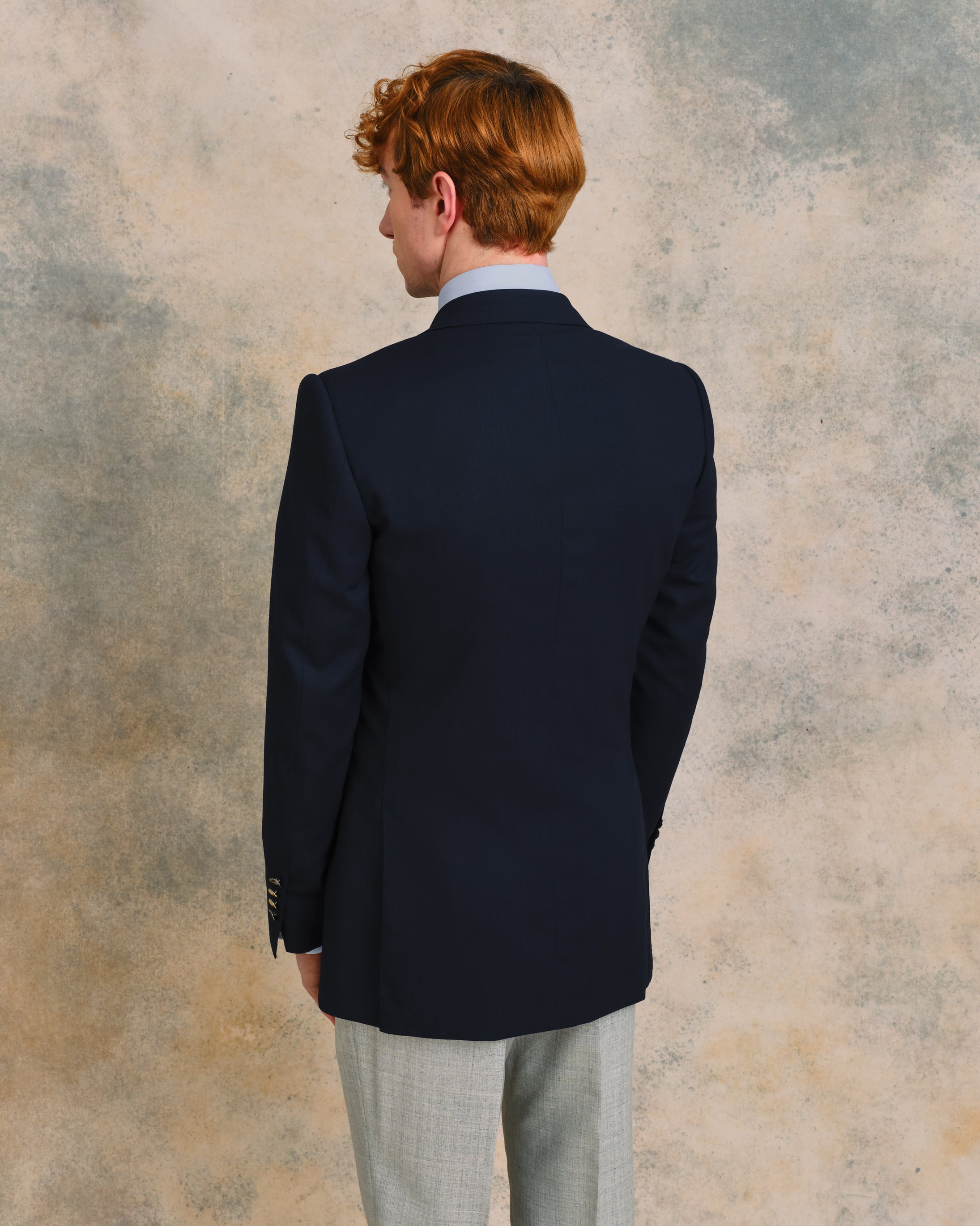 A classic deep navy in a high-twist open weave 100% wool - breathable, crease-resistant, and built to travel. The open weave construction keeps it cool through the warmer months without sacrificing the weight and composure that a good blazer demands. Woven in Italy. 100% Wool. 285g.