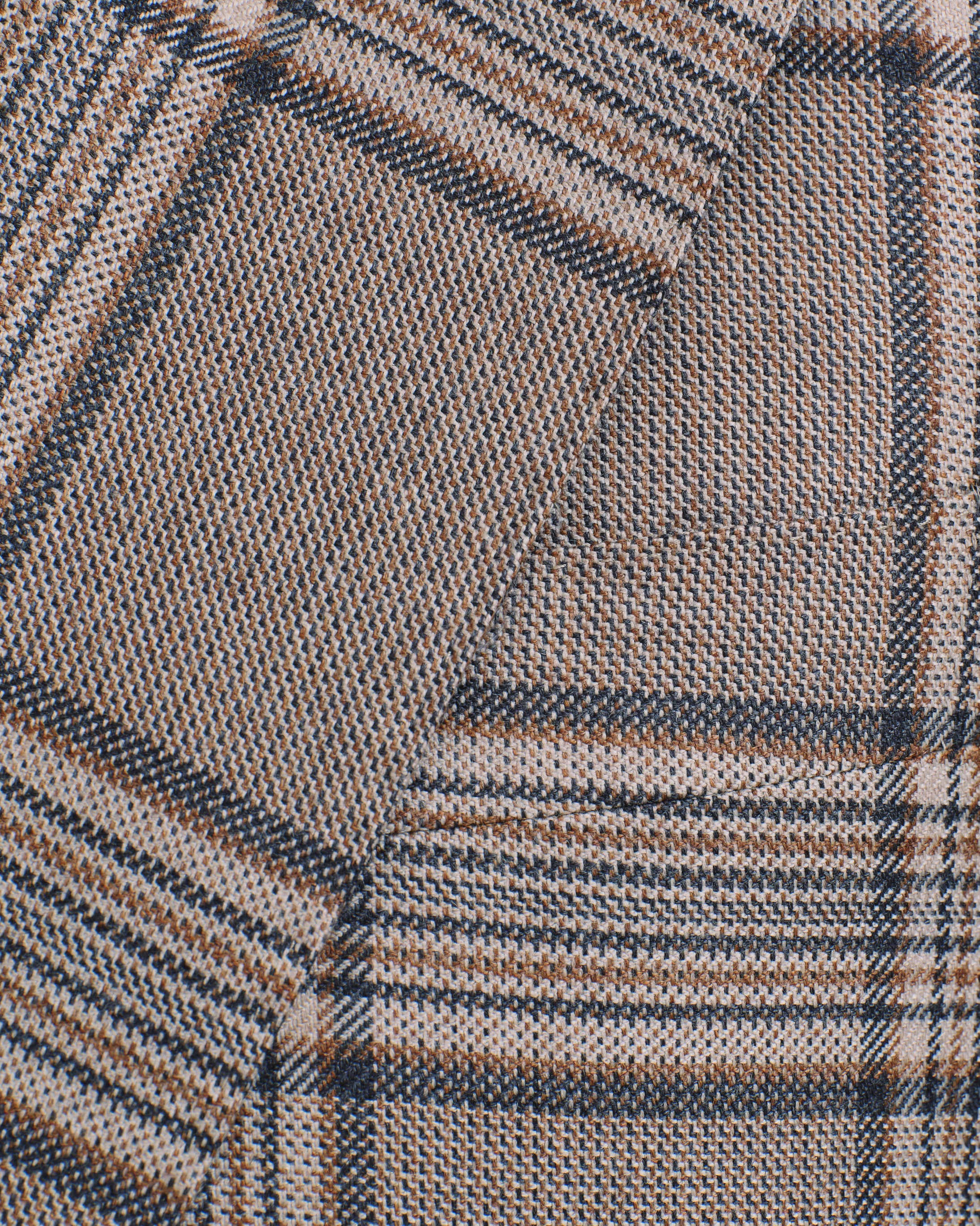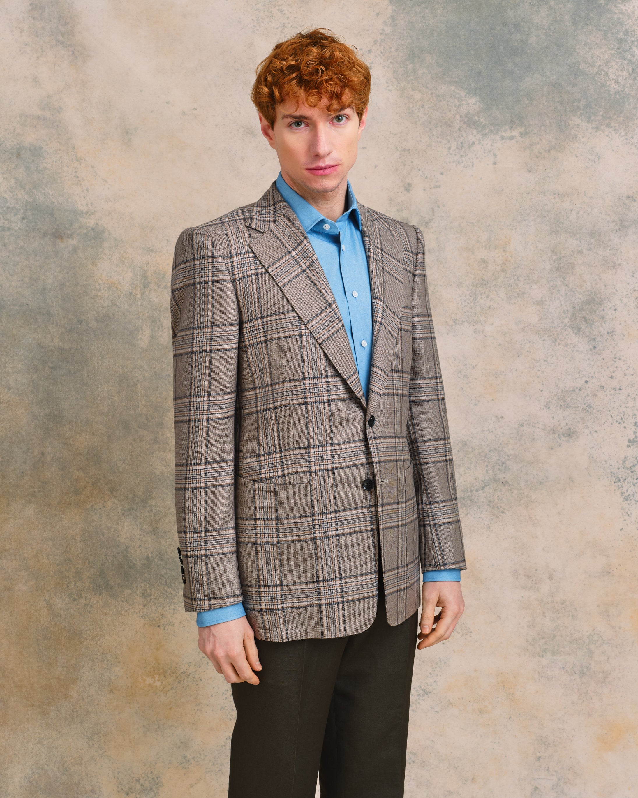 A classic Sexton sports jacket, and one that earns a second look. The cloth is the thing here - a large-scale check in warm shades of grey, soft brown, beige and taupe that has a quiet boldness to it: distinctive without being loud, elegant without being safe. The handle is soft and easy, the weight substantial enough to give the jacket real presence on the shoulder. Two-button fastening, patch pockets, and a centre vent.