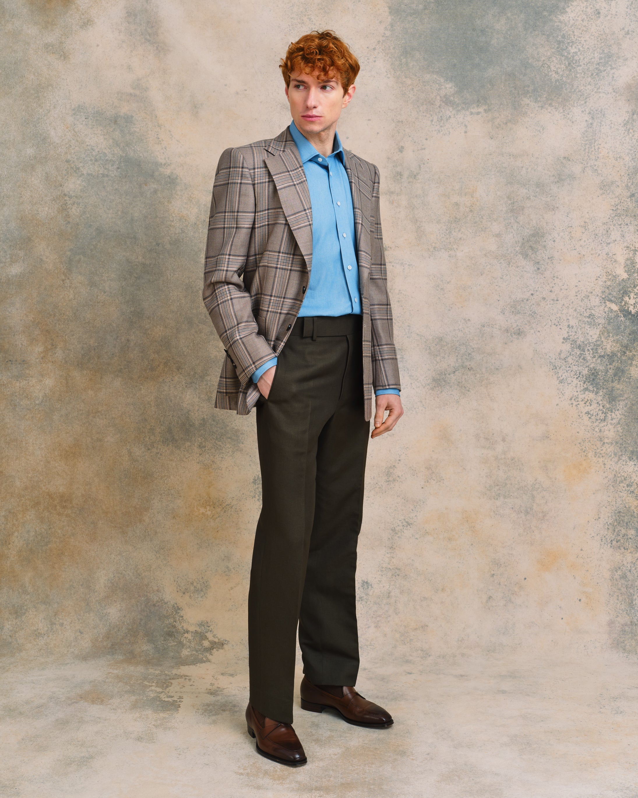 Large-scale heritage check in warm, subtle tones - grey, soft brown, beige and taupe woven together with a quiet elegance. The scale gives it real character; the palette keeps it thoroughly wearable. Soft in the hand with a handle that drapes easily. 100% Wool. 340g. Woven in Italy.