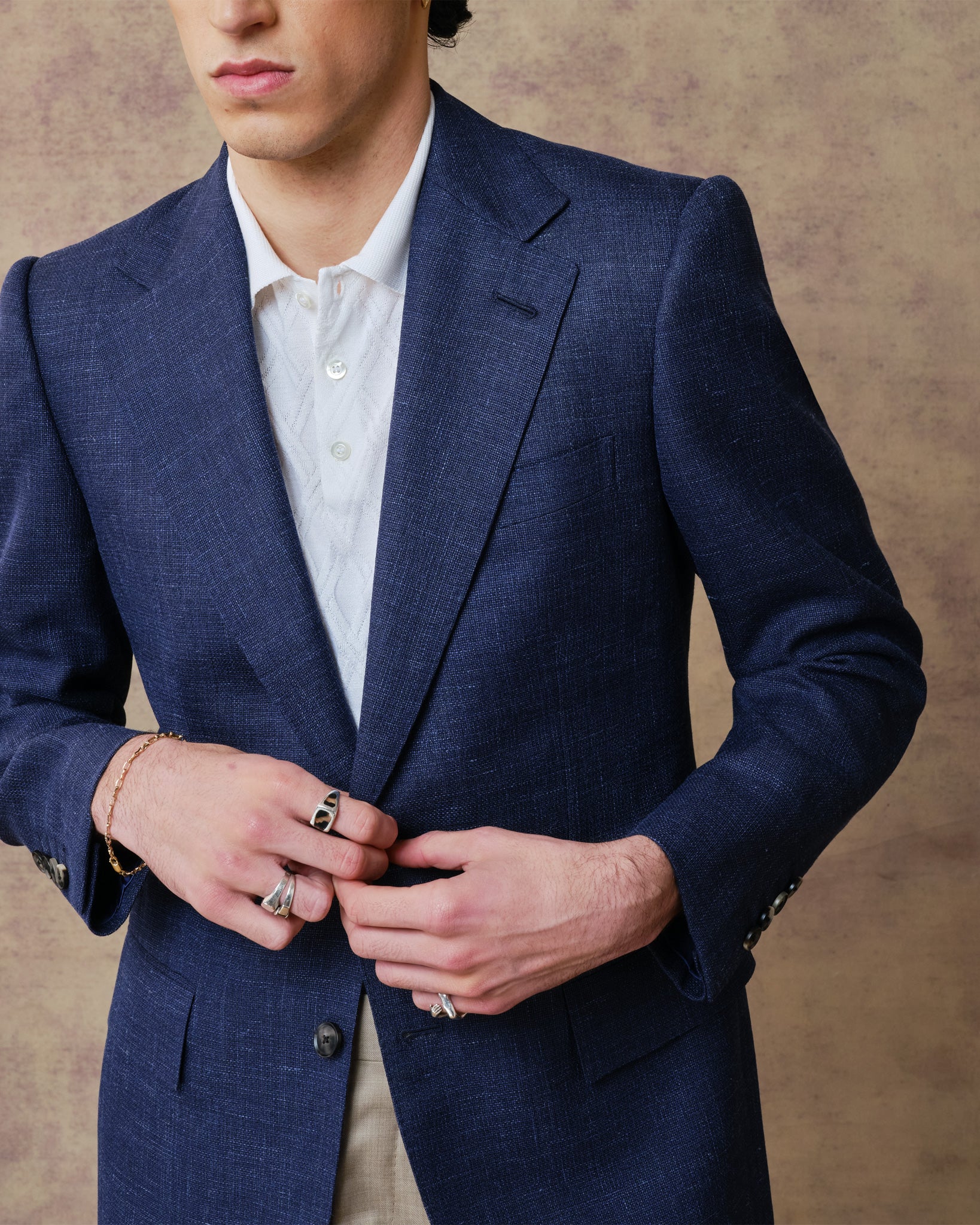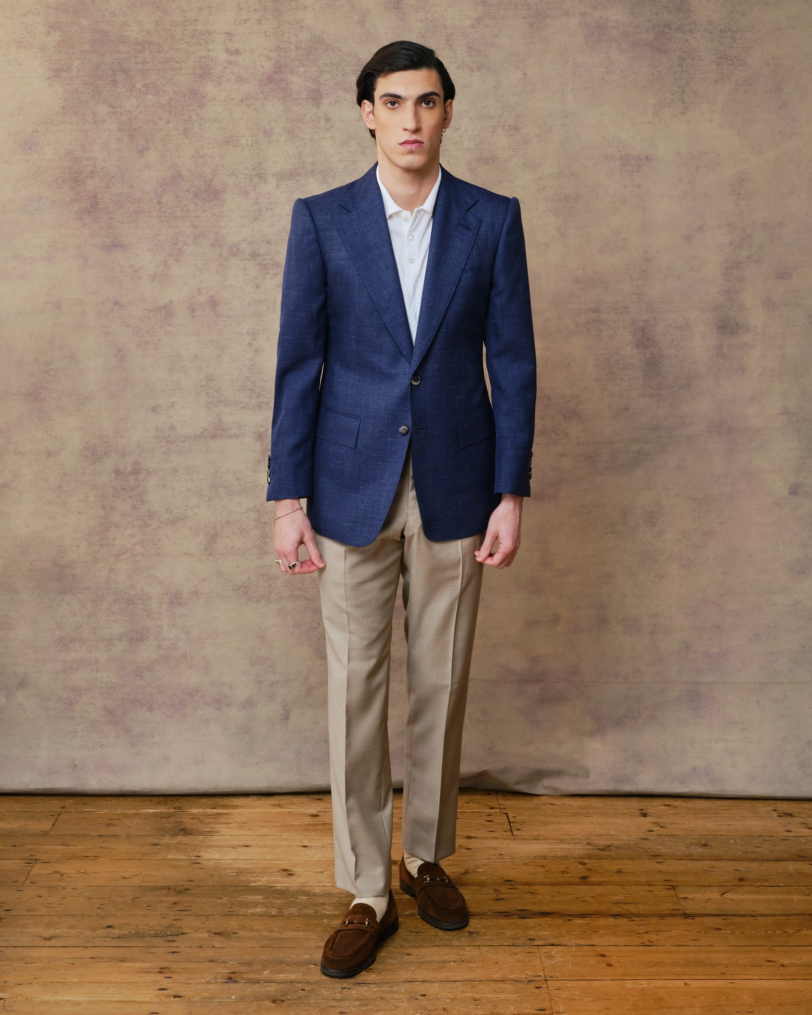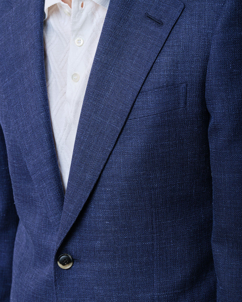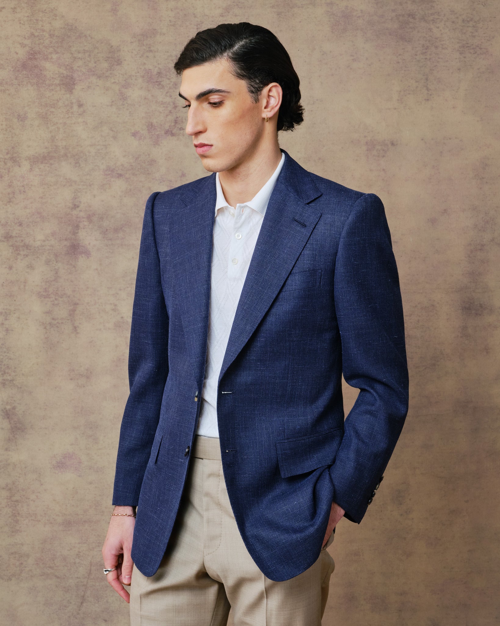 The perfect balance of wool, silk and linen from which this cloth is comprised, mean the jacket has a beautiful drape from the weight behind, whilst retaining all of the coolness and breathability from the clever blend of fibres.