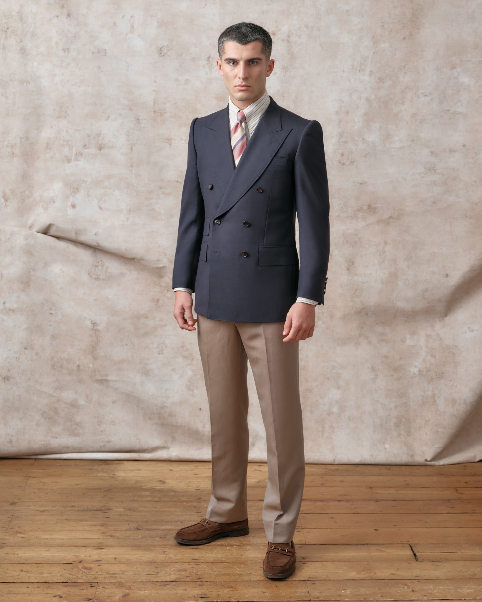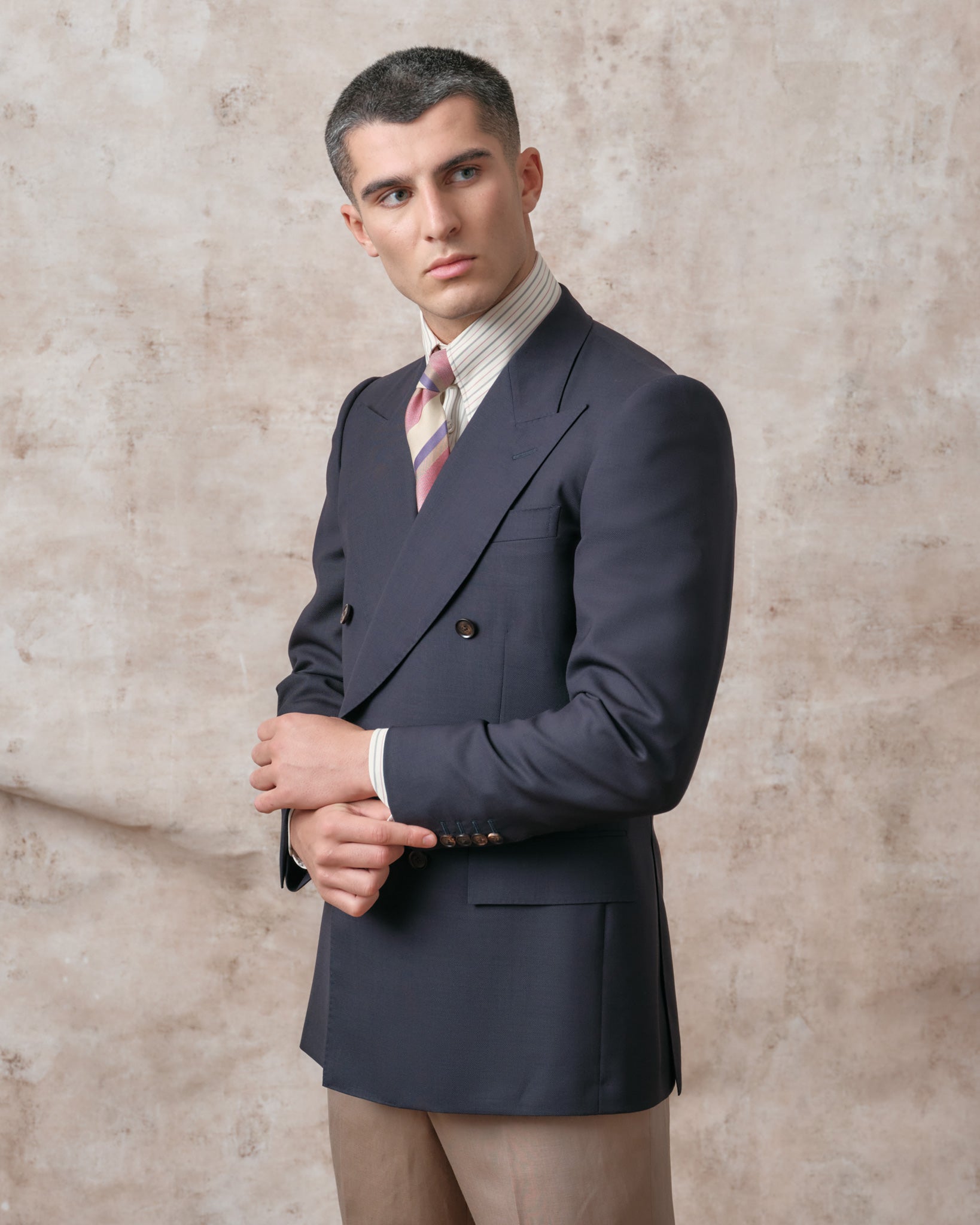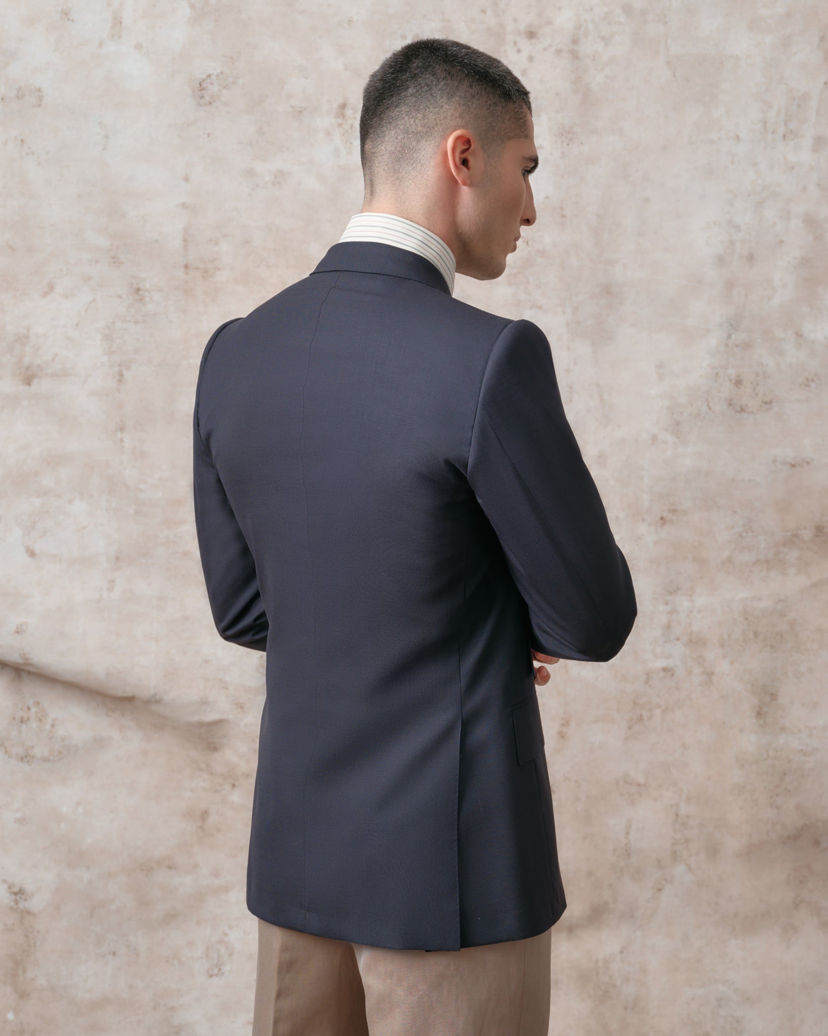This shapely approach to tailoring also filters through to our double-breasted models, which come in two complementary styles. Perhaps our best-known cut is the timeless Signature Double-Breasted jacket, which has four buttons to fasten and two ‘show buttons’ on the chest. A personal favourite of Edward’s, double-breasted jackets like this lend stature and a touch of authority to the wearer, but can nonetheless still create a playful impression in bold colours, soft textures.