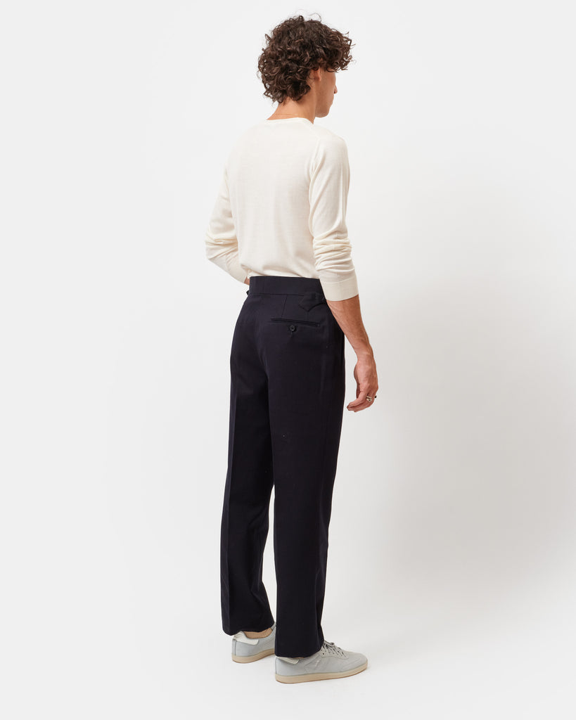 Our classic gentlemen’s trouser developed in 2023 is clean and close around the top but fuller through the knee and hem. This trouser is both comfortable and timelessly elegant, and with its 2” waistband with a long extension and side adjusters, it sits beautifully on an elegant show or rests naturally on a trainer.