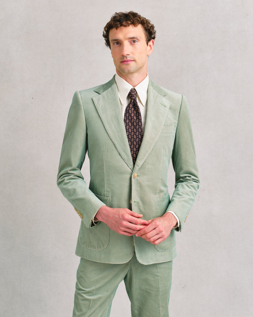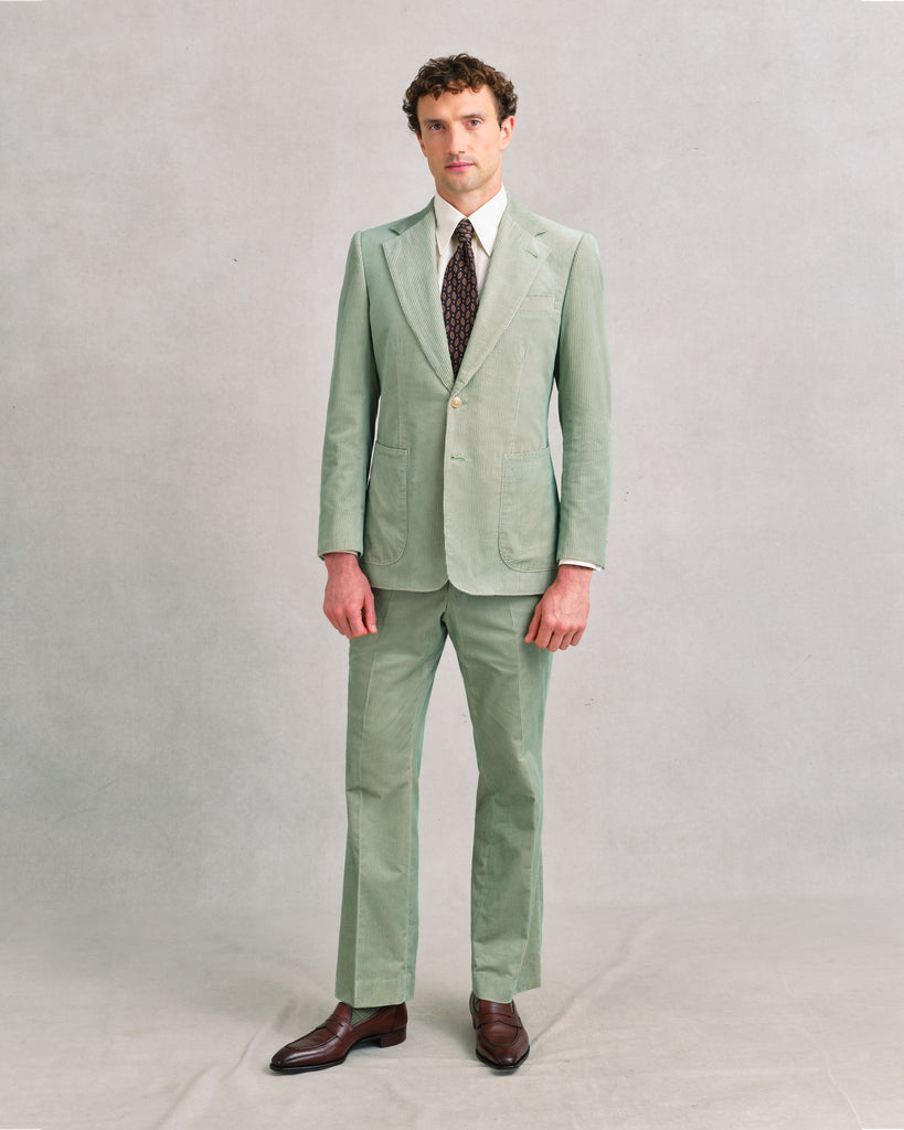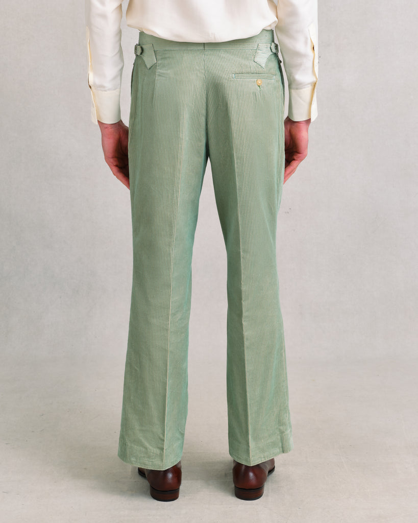 Subtly flared trousers in Italian cotton corduroy. The eau de Nil pile is woven over a beige ground, creating slender stripes with a playful retro character. The flare gives movement and shape without excess, making them a refined partner to the matching jacket or a standout separate with knitwear or casual tailoring.