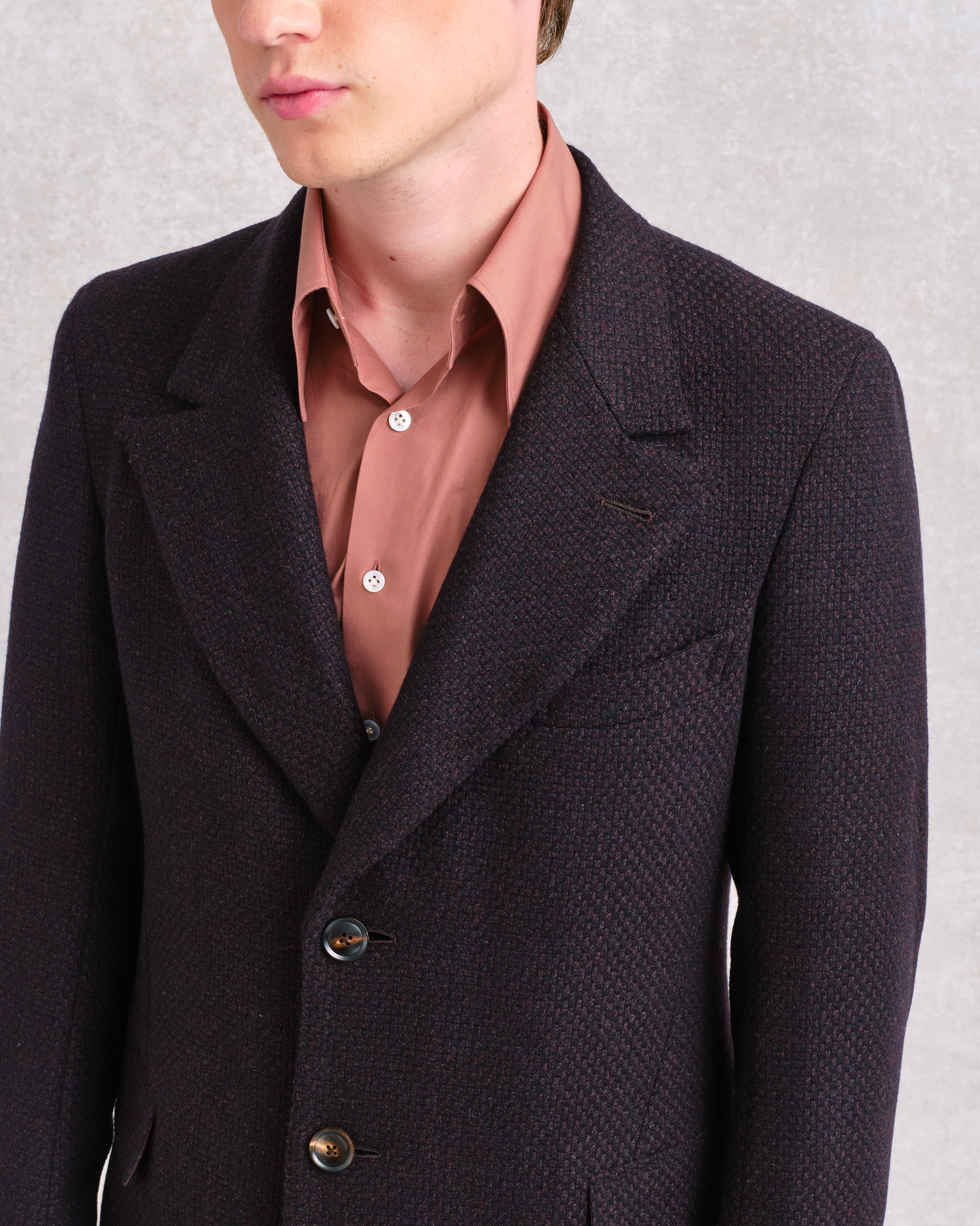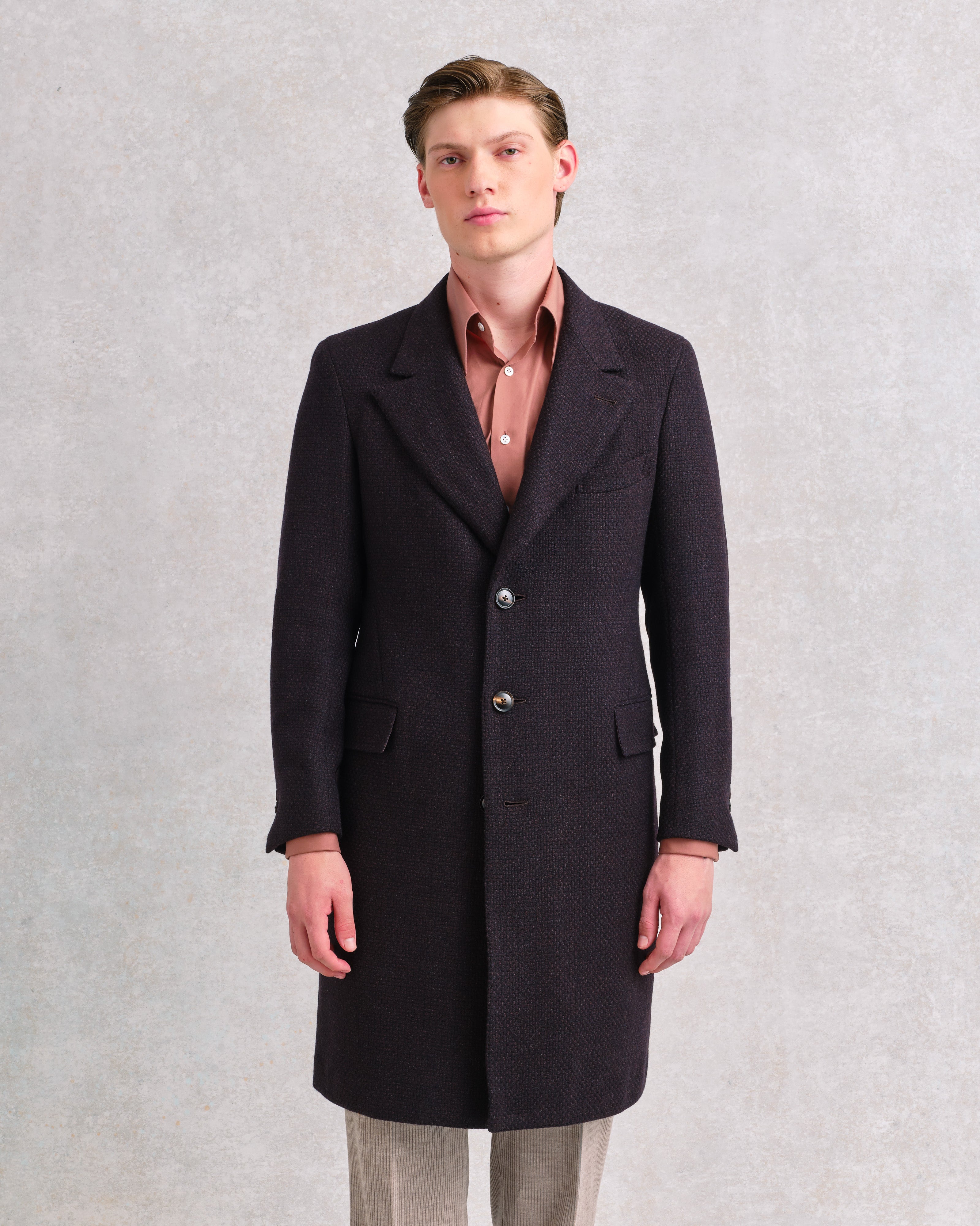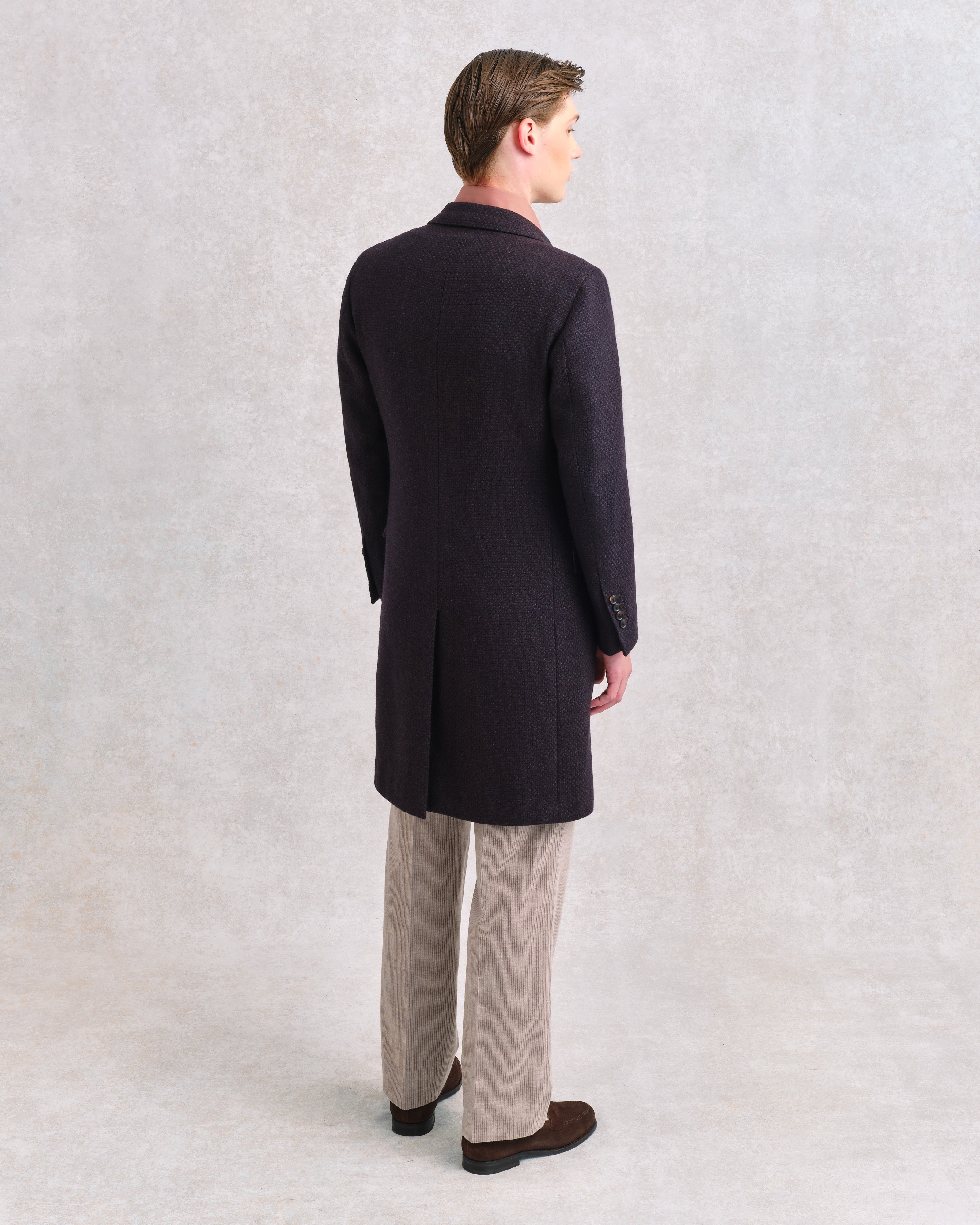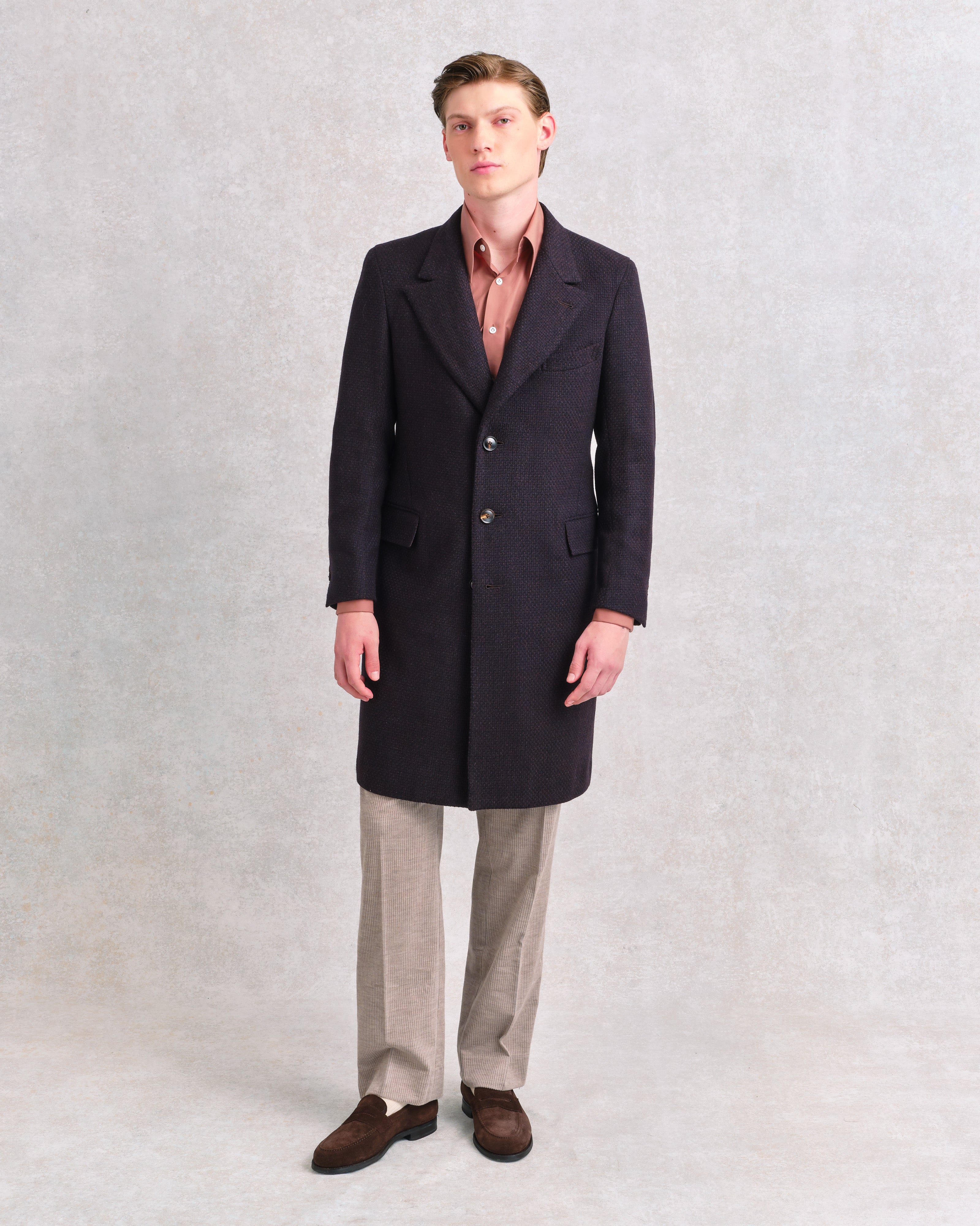 A soft, unstructured coat in a dark, smouldering blend of burgundy and black. The geometric box weave adds quiet texture and depth, while the deep tones keep it elegant and understated. Featuring Sexton’s signature sweeping lapel, the coat drapes naturally and feels relaxed yet refined. Warm, cosy, and effortlessly stylish, it’s a winter layer made for comfort, character, and ease.