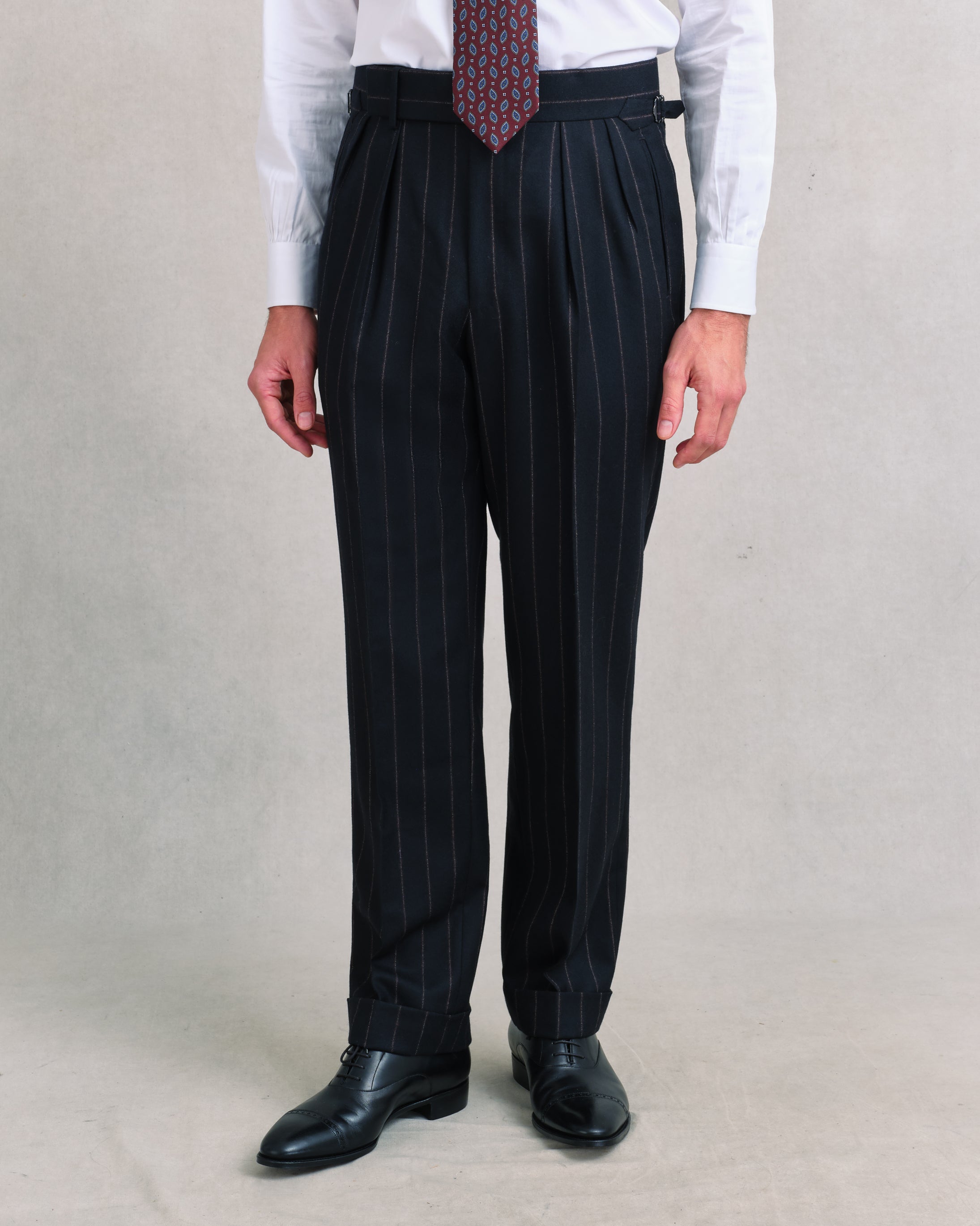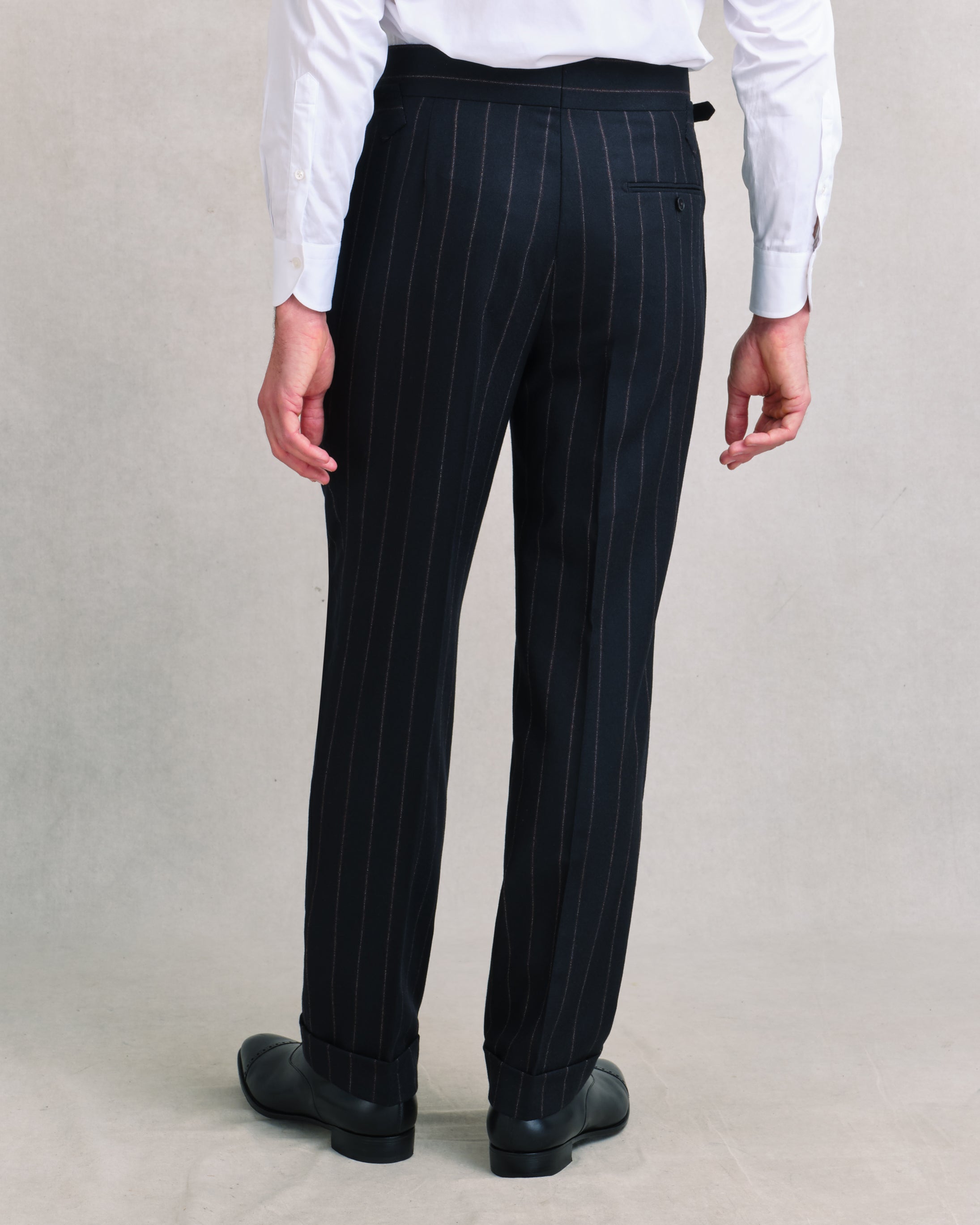 Those who, like us, enjoy a touch of romance in their dress may prefer trousers cut with pleats. Our Heritage Trousers are cut in the classic mid-century style with a high rise, generous legs and two deep, forward-facing pleats on each side of the waist. Trousers like these create the illusion of a slim waist and hips, and form the bottom half of the hourglass shape that starts with our jackets. We finish these with our signature pistol shaped side straps and slant-jet pockets; details which help our Heritage Trousers to retain a clean, fluid line through the leg.