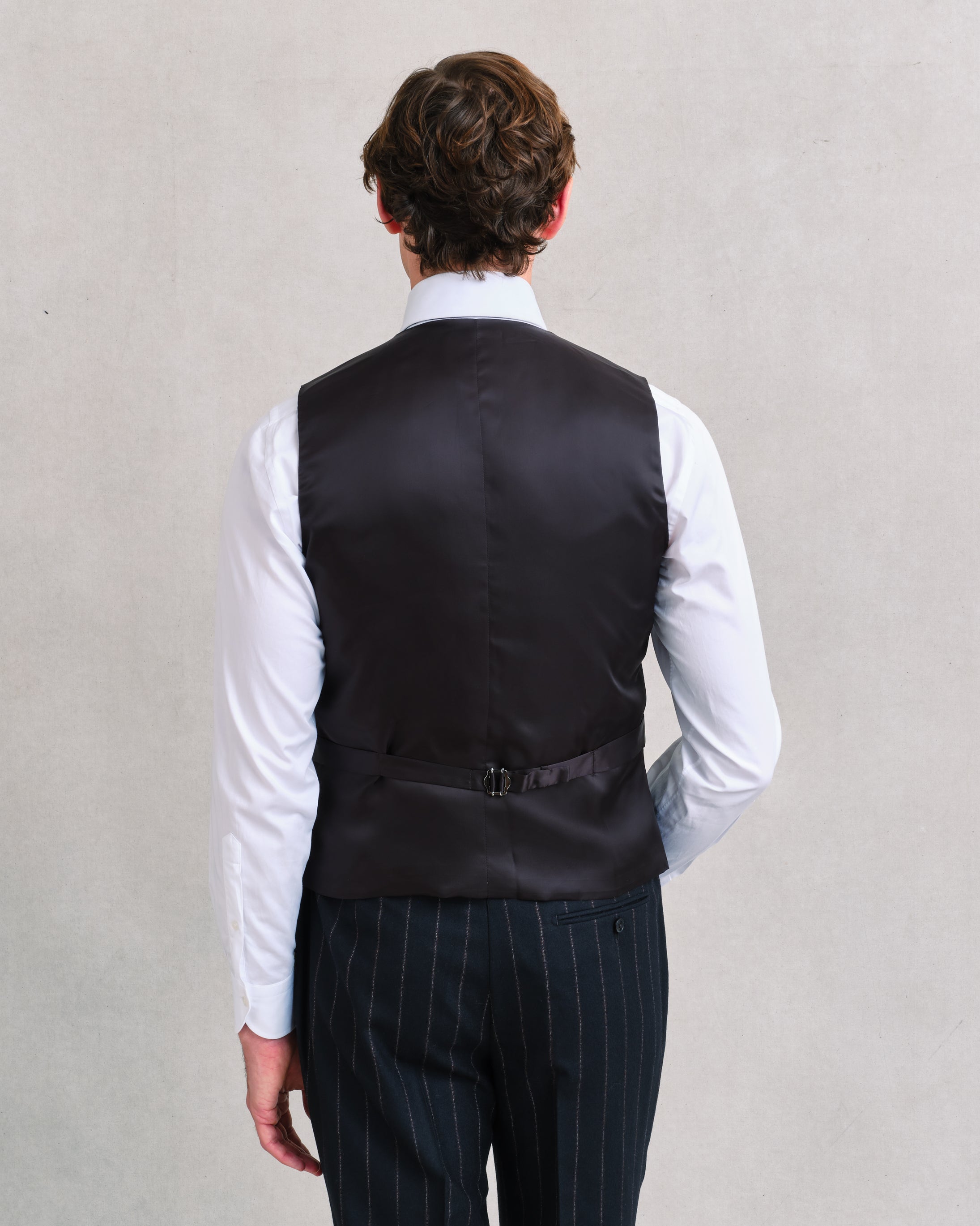 A Sexton power suit with a modern edge. The cloth is a lightweight milled flannel in pure wool, soft to the touch but bold in design. A slate-black ground carries stripes at inch-and-a-quarter intervals, each made up of fine broken grey lines flanked with red. The effect is sharp yet softened, giving the cloth presence without harshness. The heritage jacket and trouser define the line, while the single-breasted waistcoat with slant flap pockets completes the three-piece. Dark, graphic, and versatile, it recalls the bold tailoring of the 1980s while feeling fresh and current—commanding in the boardroom, confident in more playful settings.