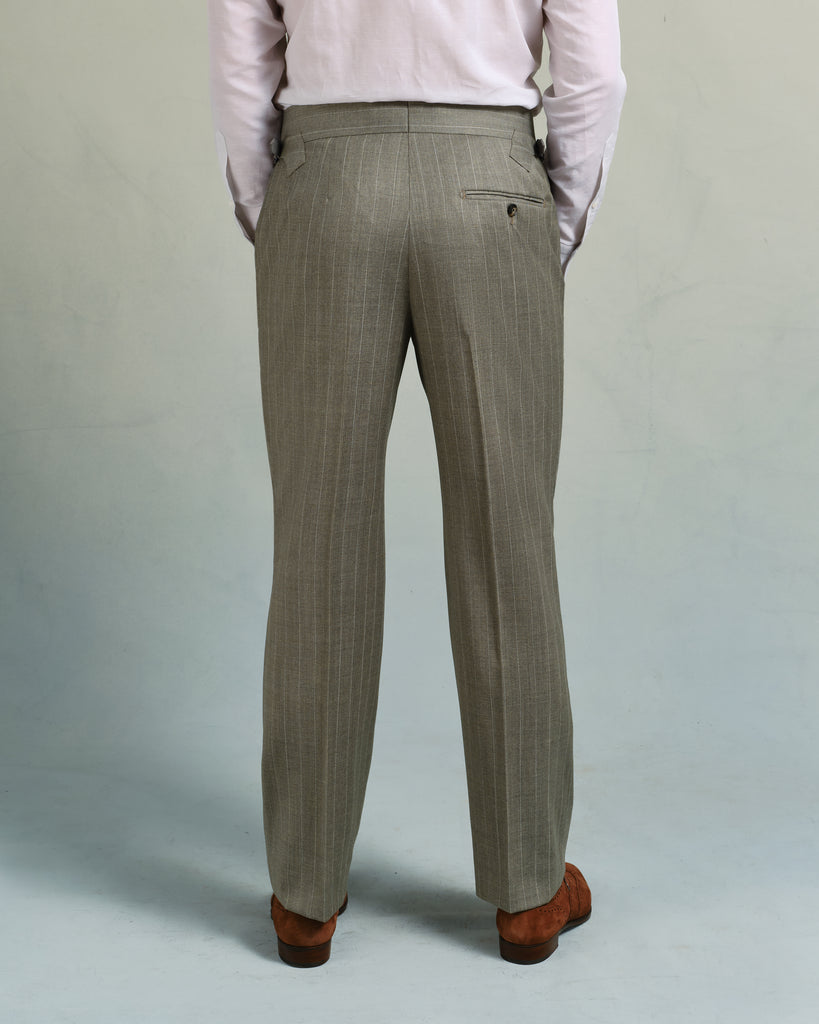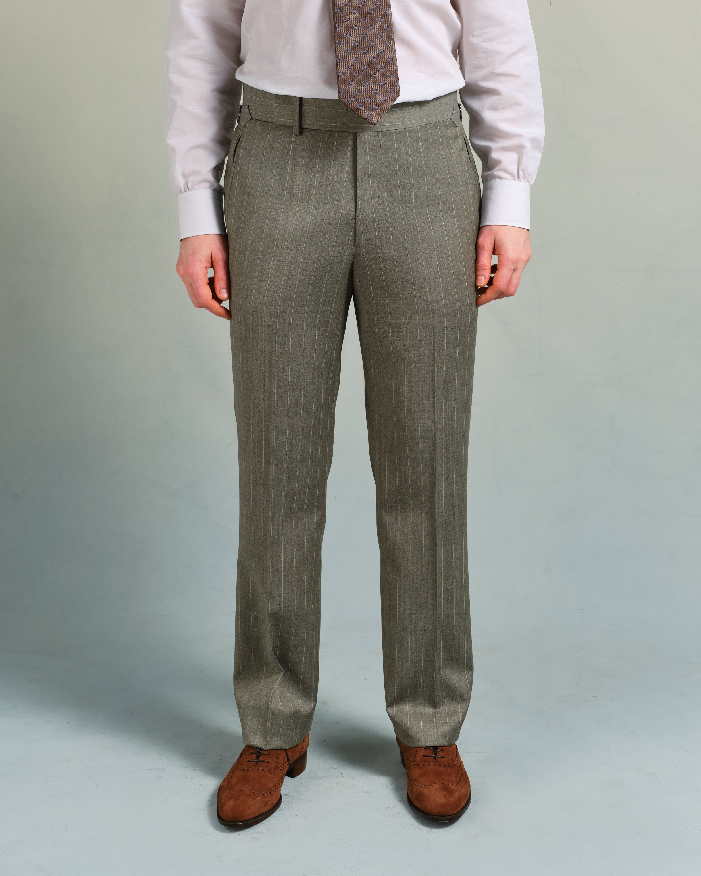 Our classic gentlemen's trouser developed in 2023 is clean and close around the top but fuller through the knee and hem. This trouser is both comfortable and timelessly elegant, and with its 2" waistband with a long extension and side adjusters, it sits beautifully on an elegant show or rests naturally on a trainer.
