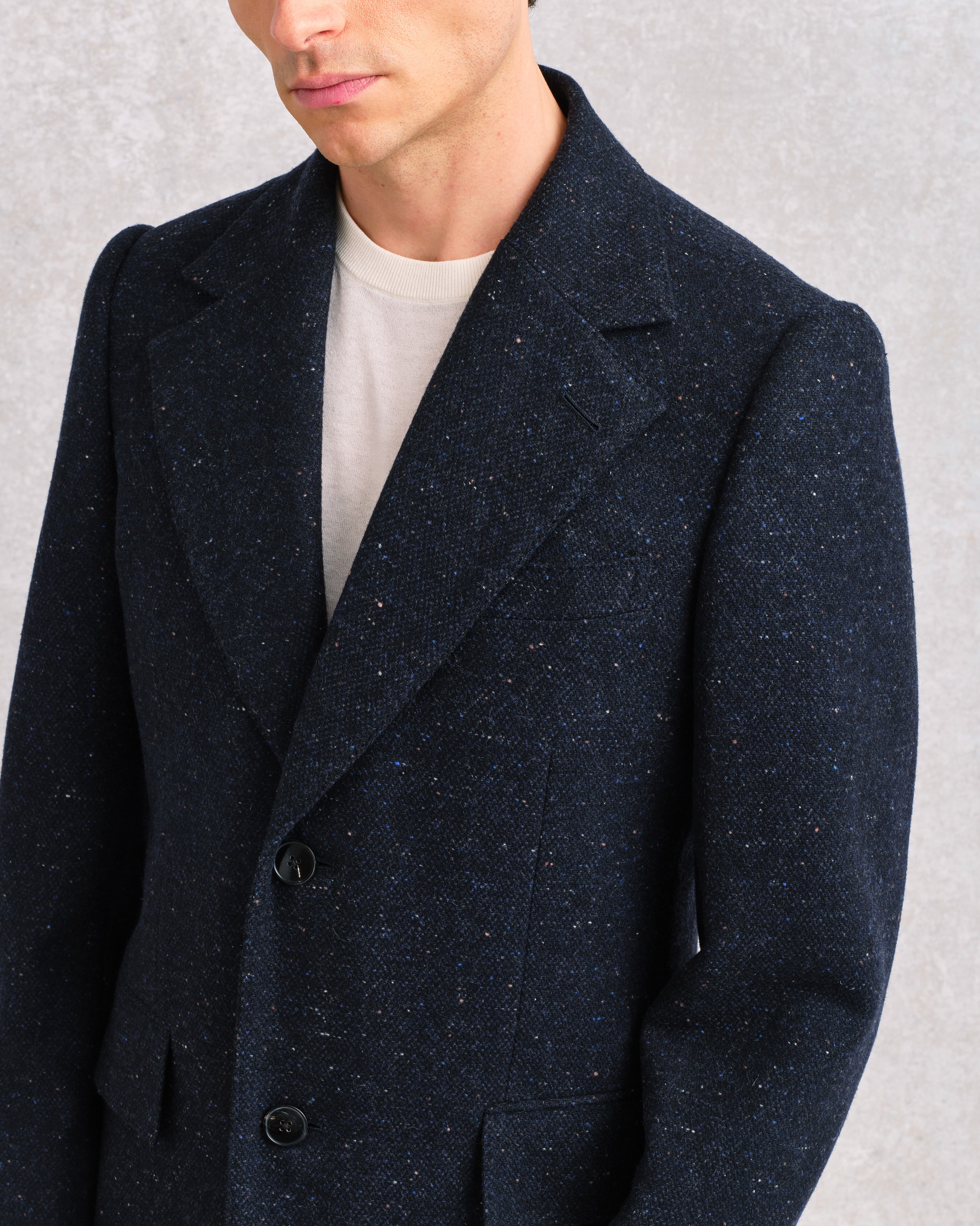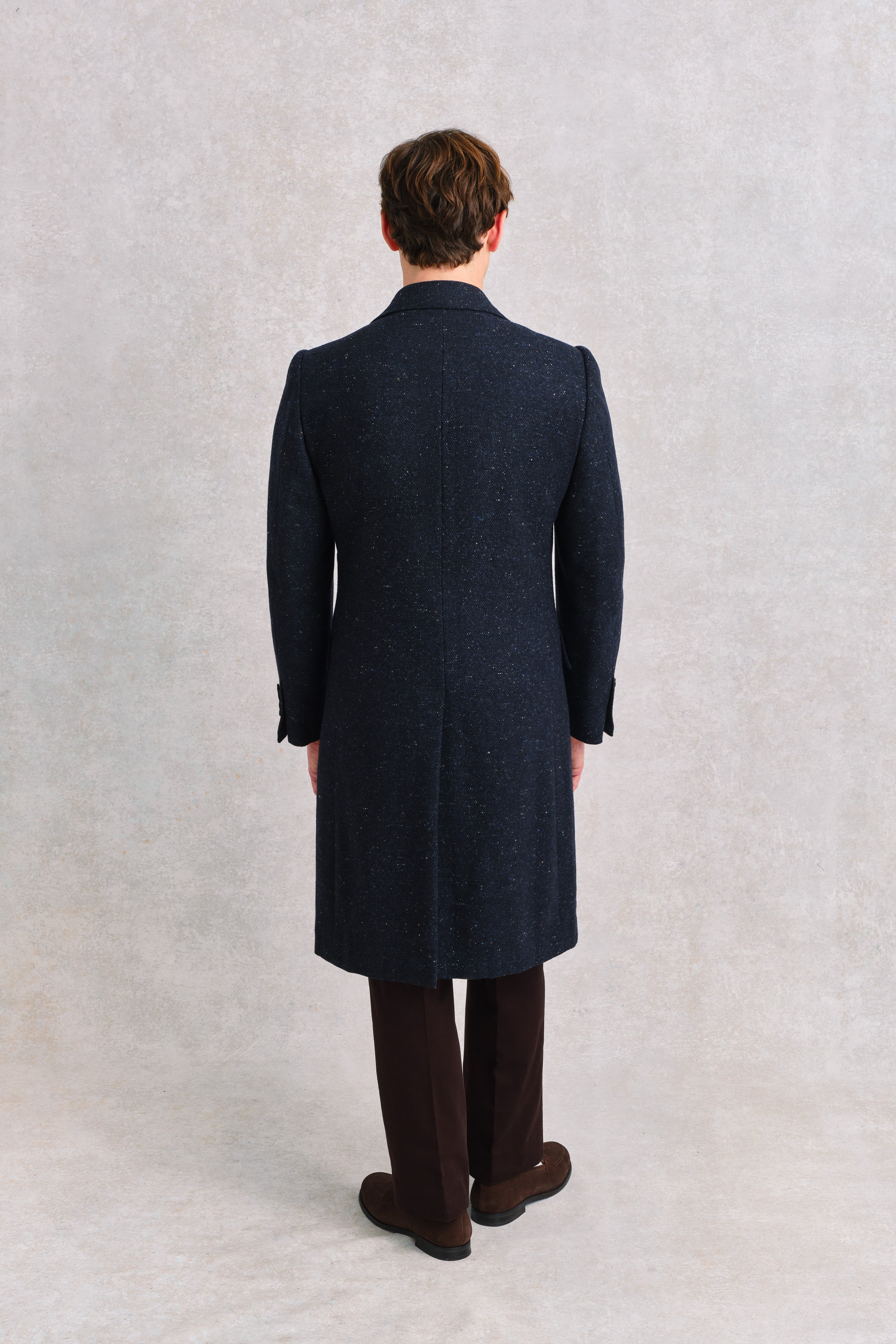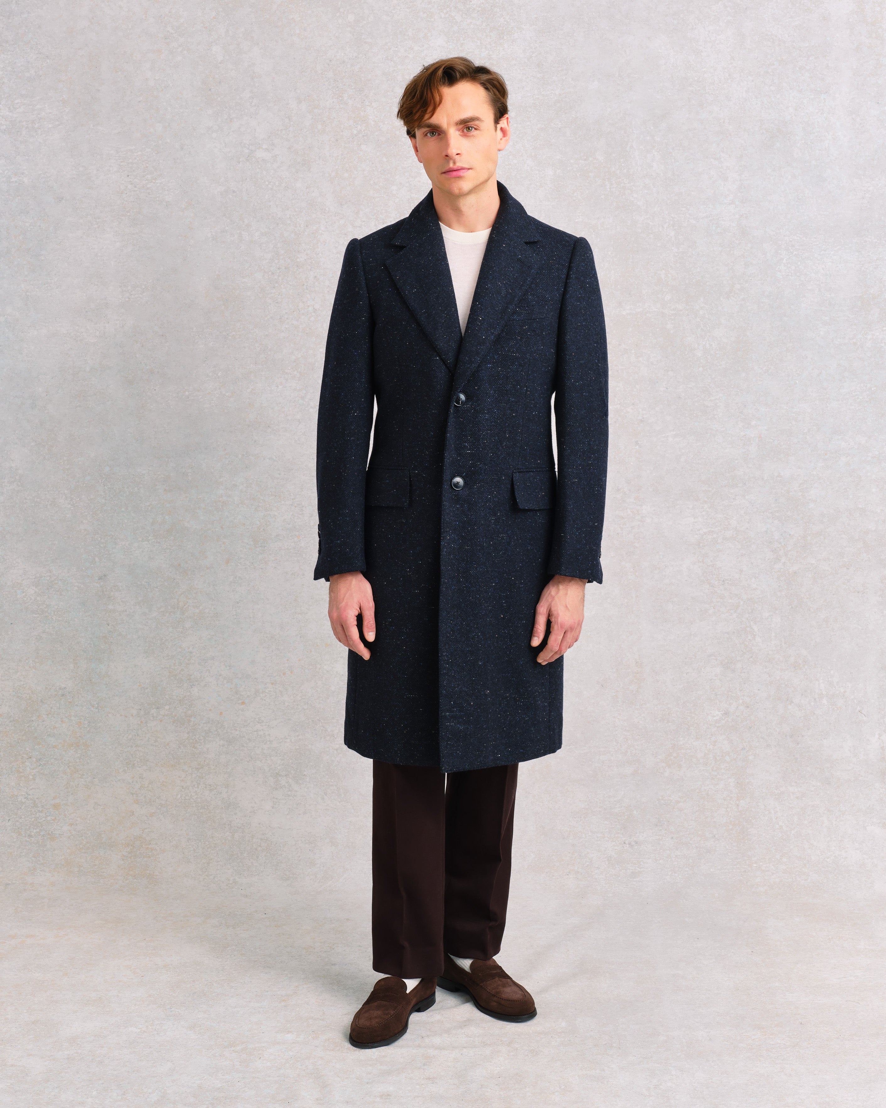 A classic Savile Row overcoat in a dark navy Donegal tweed flecked with blue and off-white. The 570g cloth has substance and warmth, giving texture and depth without heaviness. Cut on Sexton’s single-breasted block for a clean, elegant line, it’s understated yet rich in character - easy over tailoring or knitwear alike. A timeless, versatile coat with quiet Sexton refinement.