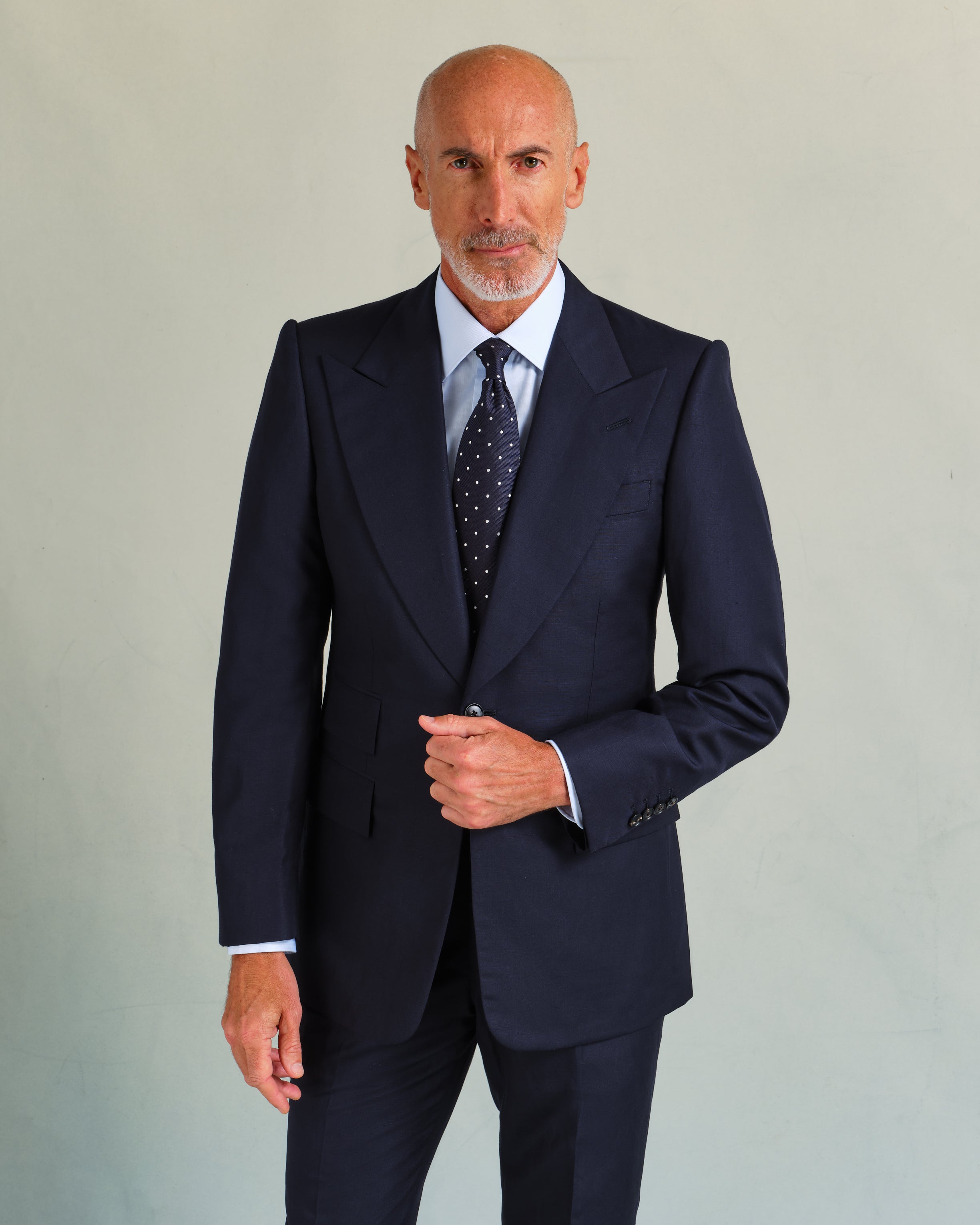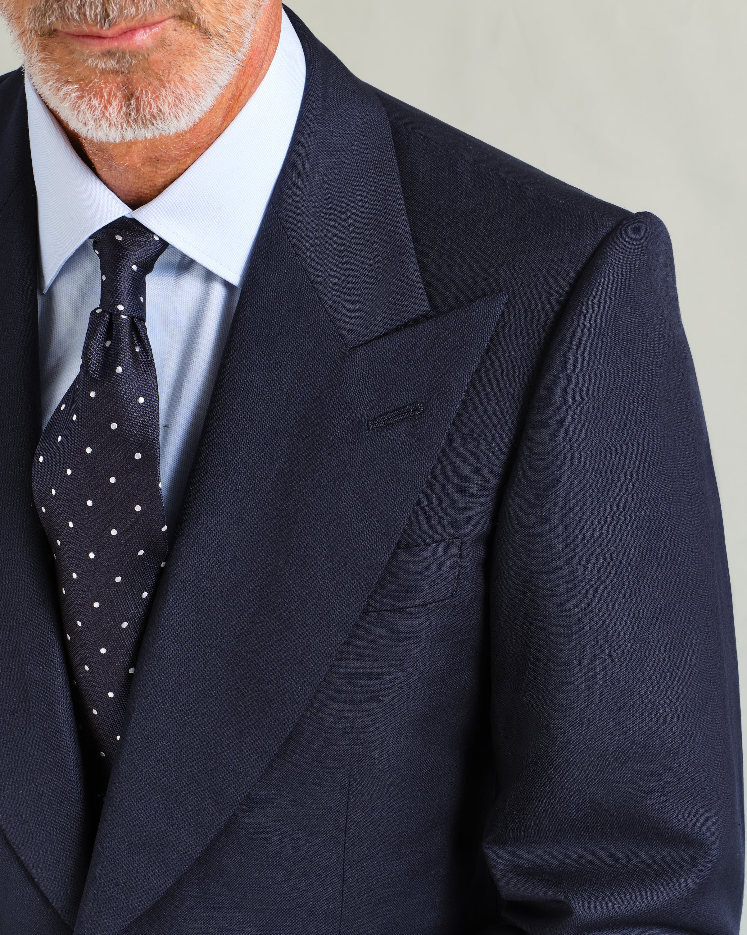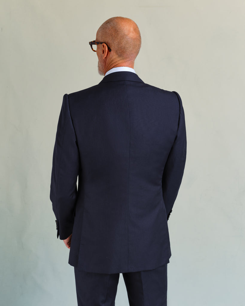 Woven in Italy, weighing 310g, this navy linen blend (60% wool, 40% linen) offers the perfect balance of comfort and style for warmer weather. The linen provides a dry, airy character, while the wool adds crease resistance. Its deep, dark navy colour is a versatile choice for a variety of settings.