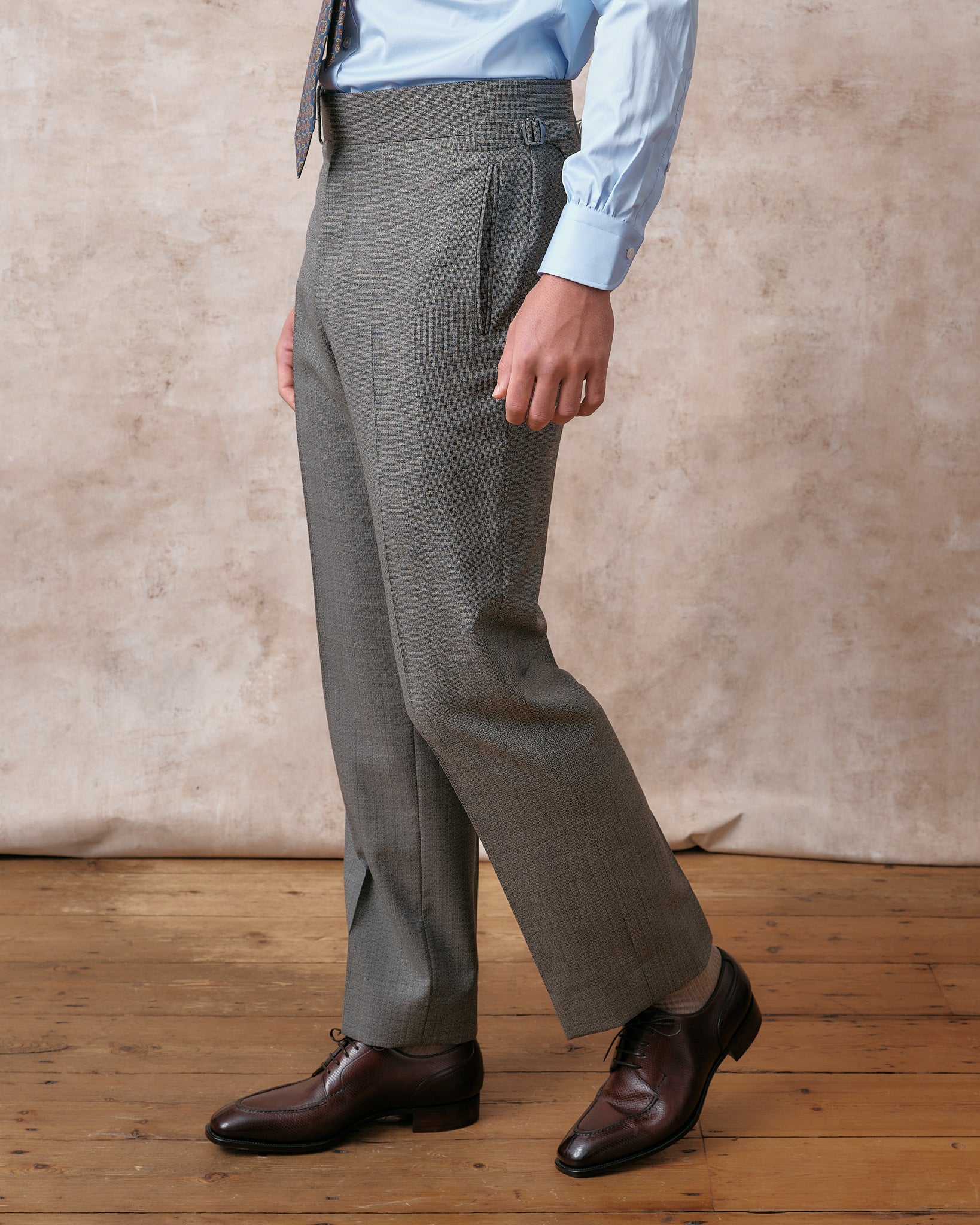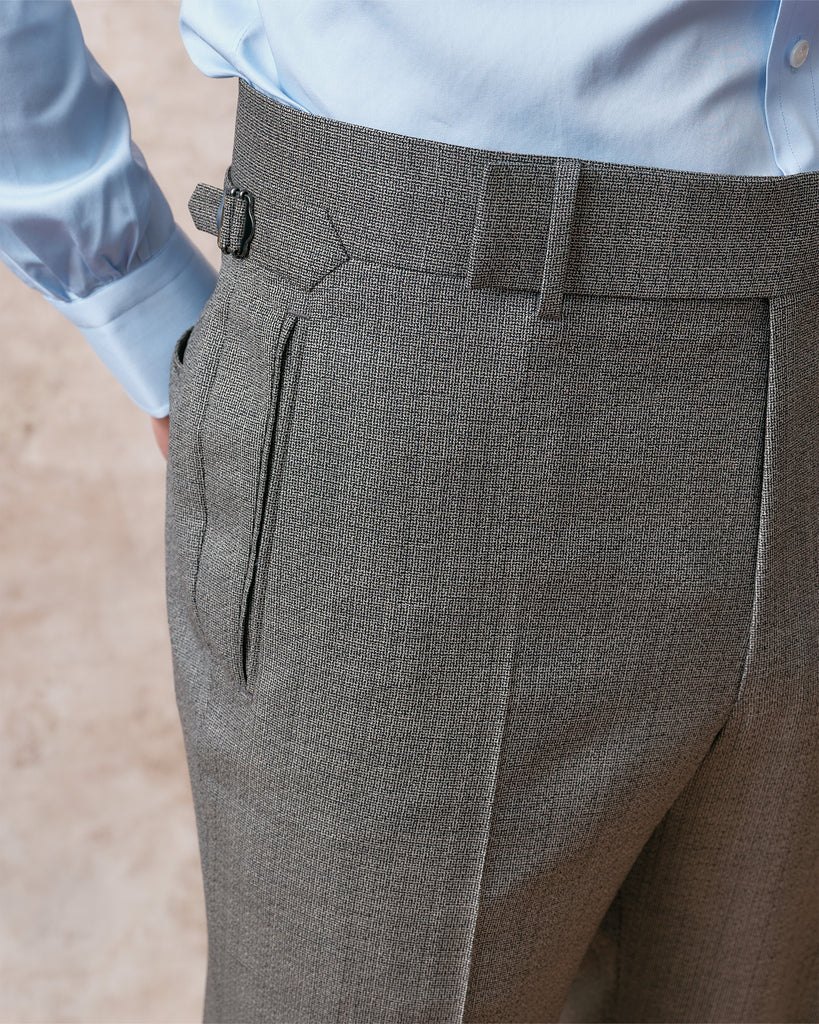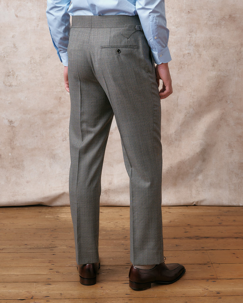 Our classic gentlemen's trouser new for 2024 is clean and close around the top but fuller through the knee and hem. This trouser is both comfortable and timelessly elegant, and with its 2" waistband with a long extension and side adjusters, it sits beautifully on an elegant show or rests naturally on a trainer.