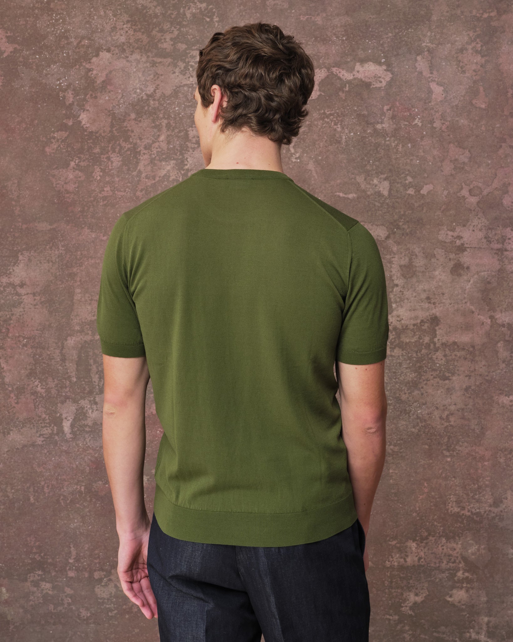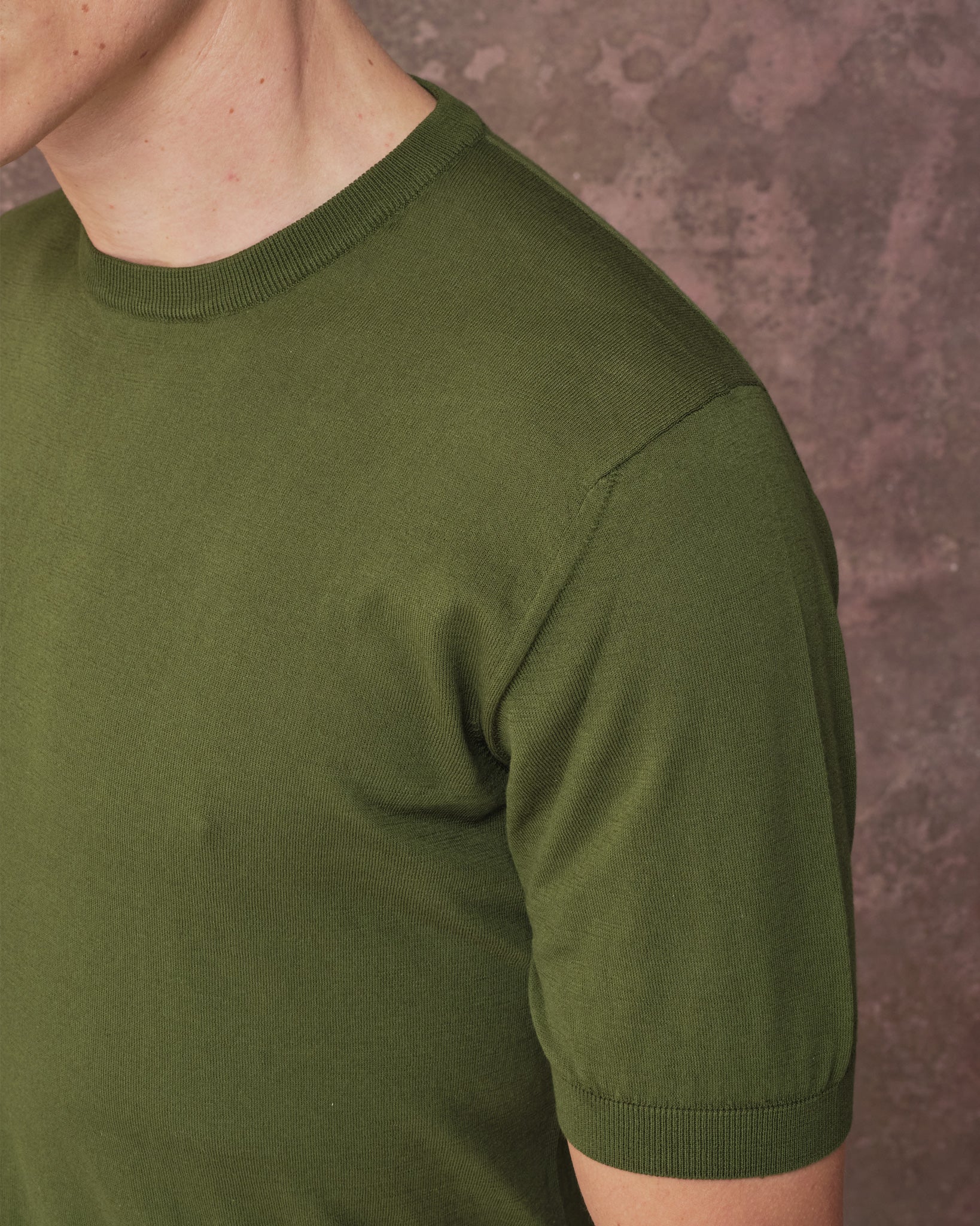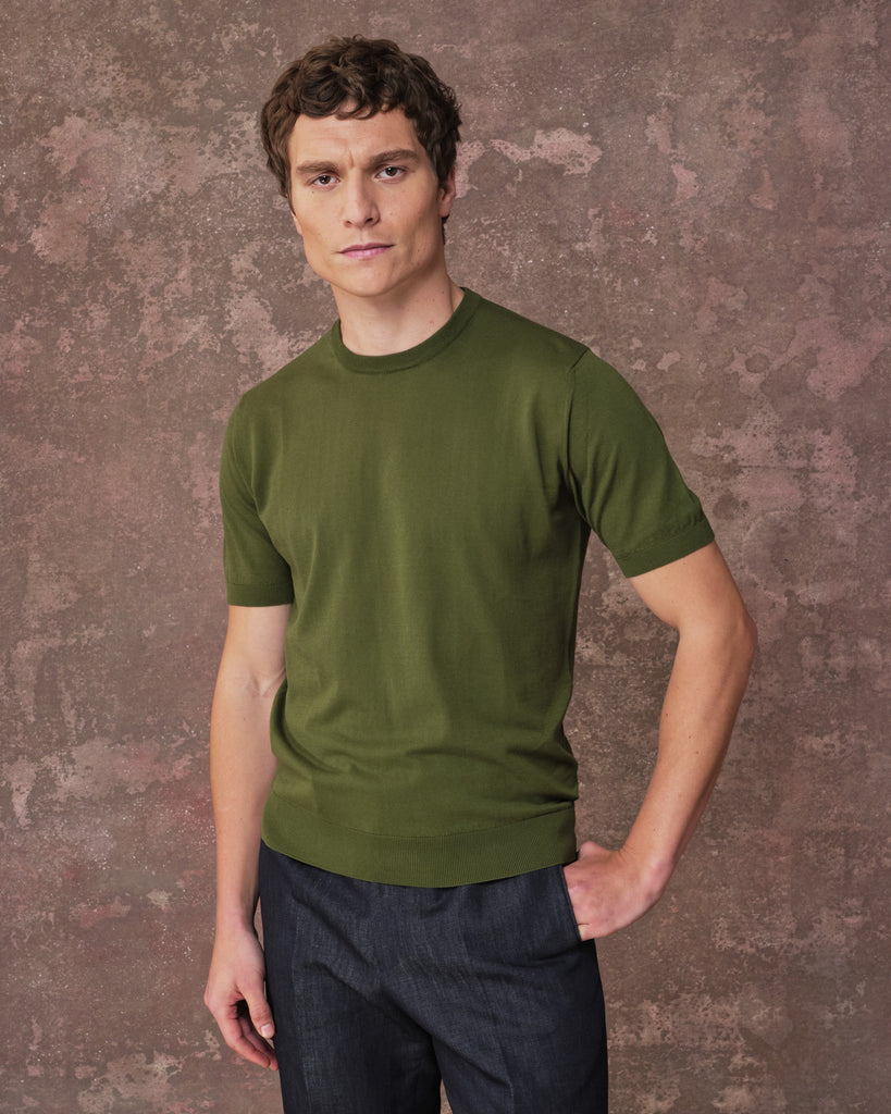 Sleek and elegant lightweight knitted t-shirt in 70% Cotton, 30% Silk, perfect to wear under your summer jacket or alone with a pair of our Hollywood or Classic Trousers.