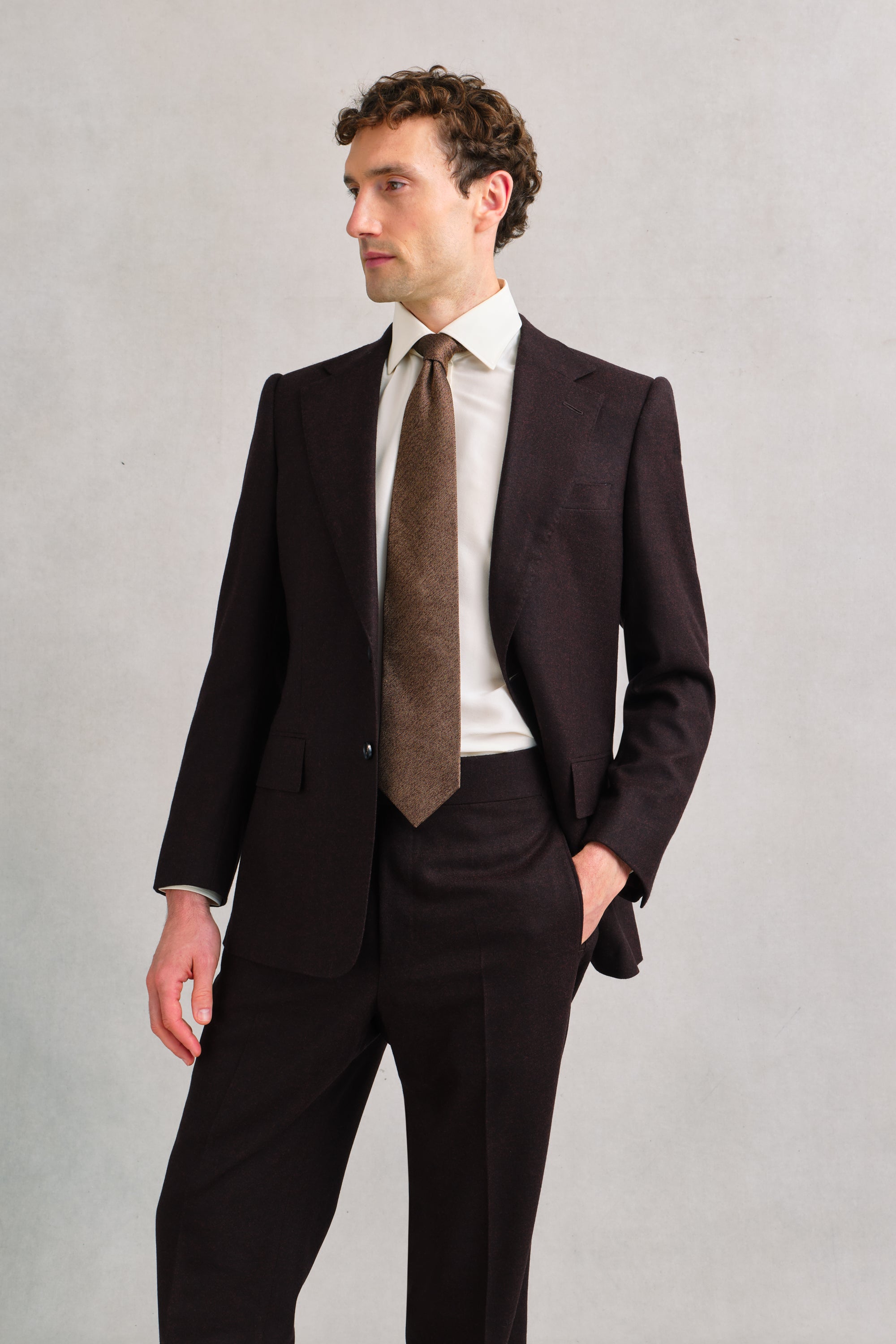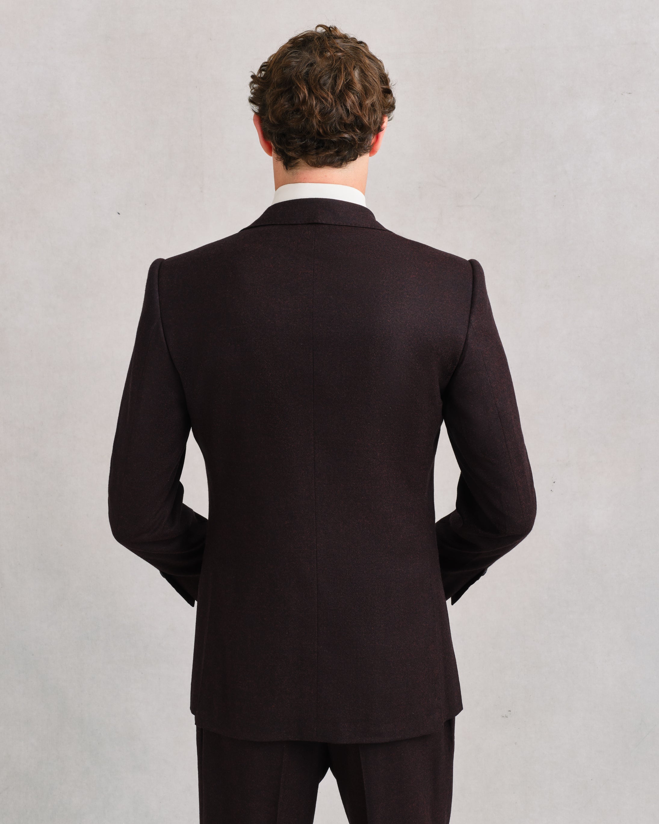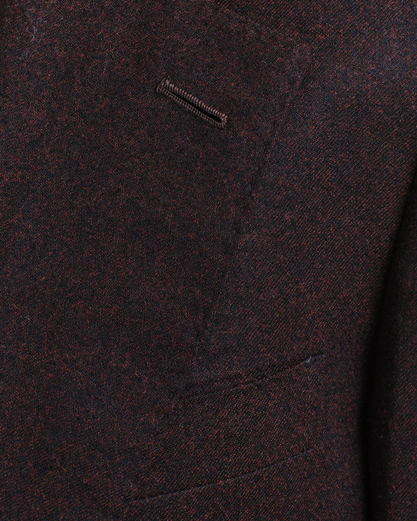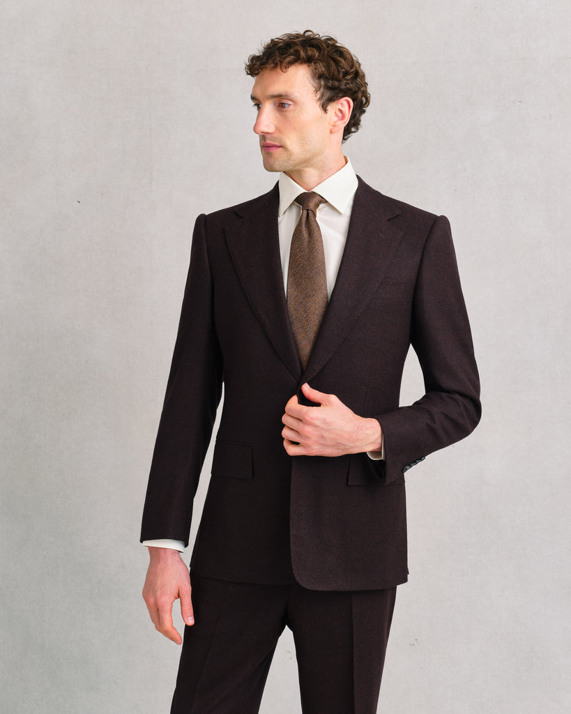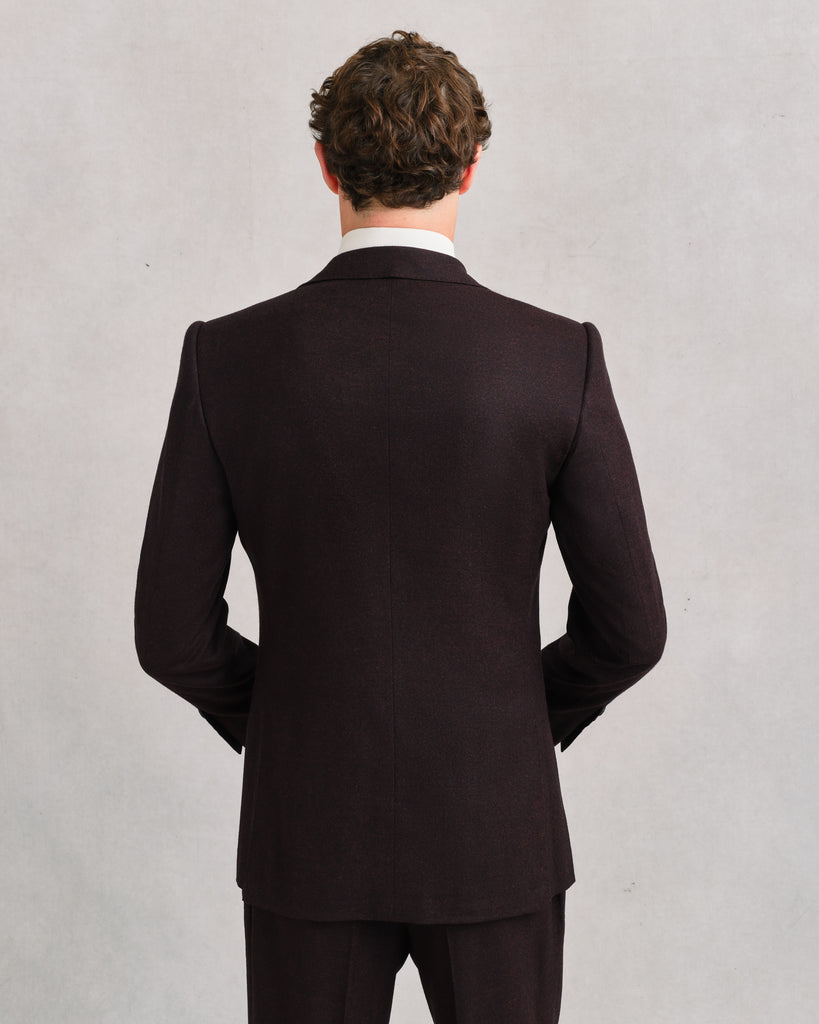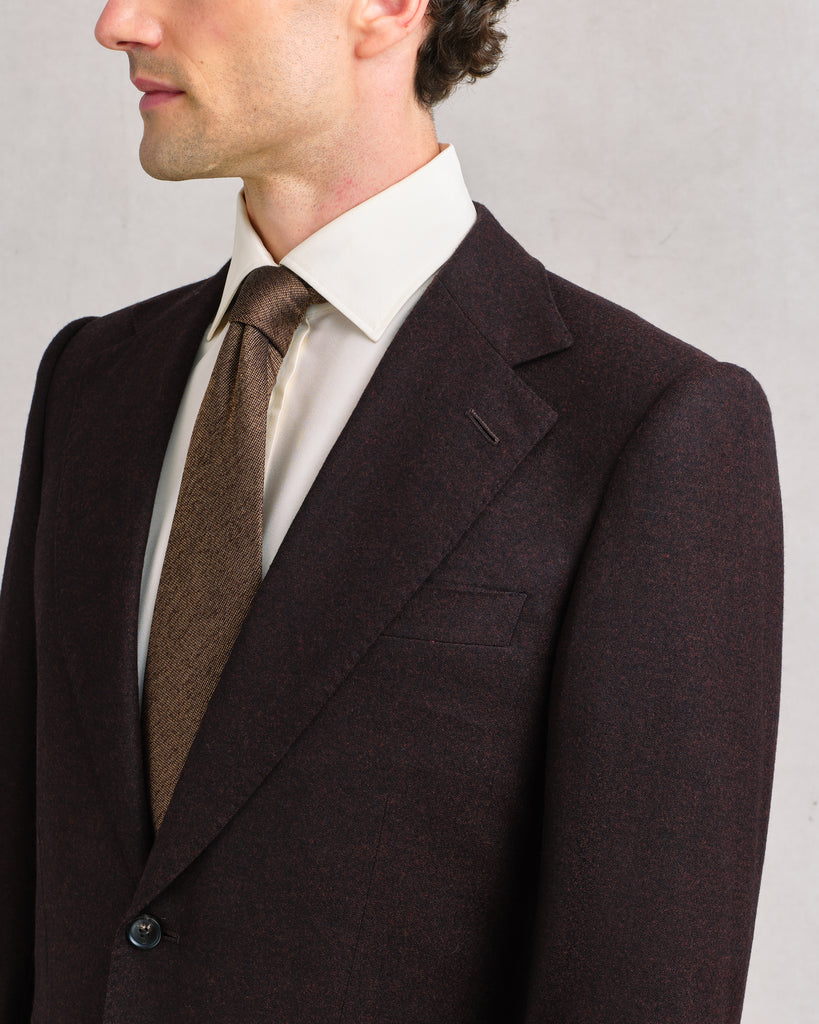 A sharp notch-lapel jacket cut in Sexton’s contemporary line. The Barolo flannel gives it presence, the melange of near-black and glowing reds making it versatile enough for day wear yet rich enough for evening. Elegant as part of the suit, striking on its own with black or earthy-toned trousers.