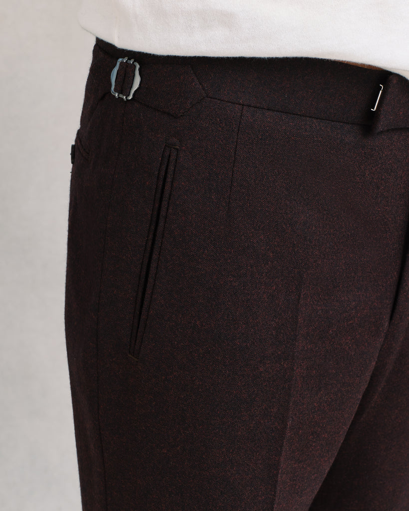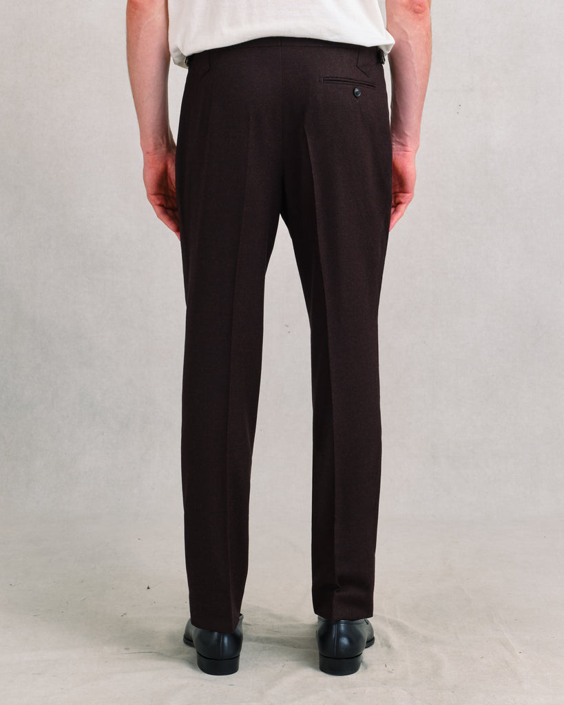 Slimmer through the leg, the contemporary trouser brings a sharper line to the Barolo cloth. Dark, versatile, and quietly glowing, it works within the suit or apart, paired with a sports jacket or knit. A refined option for those who want a modern profile without losing richness.
