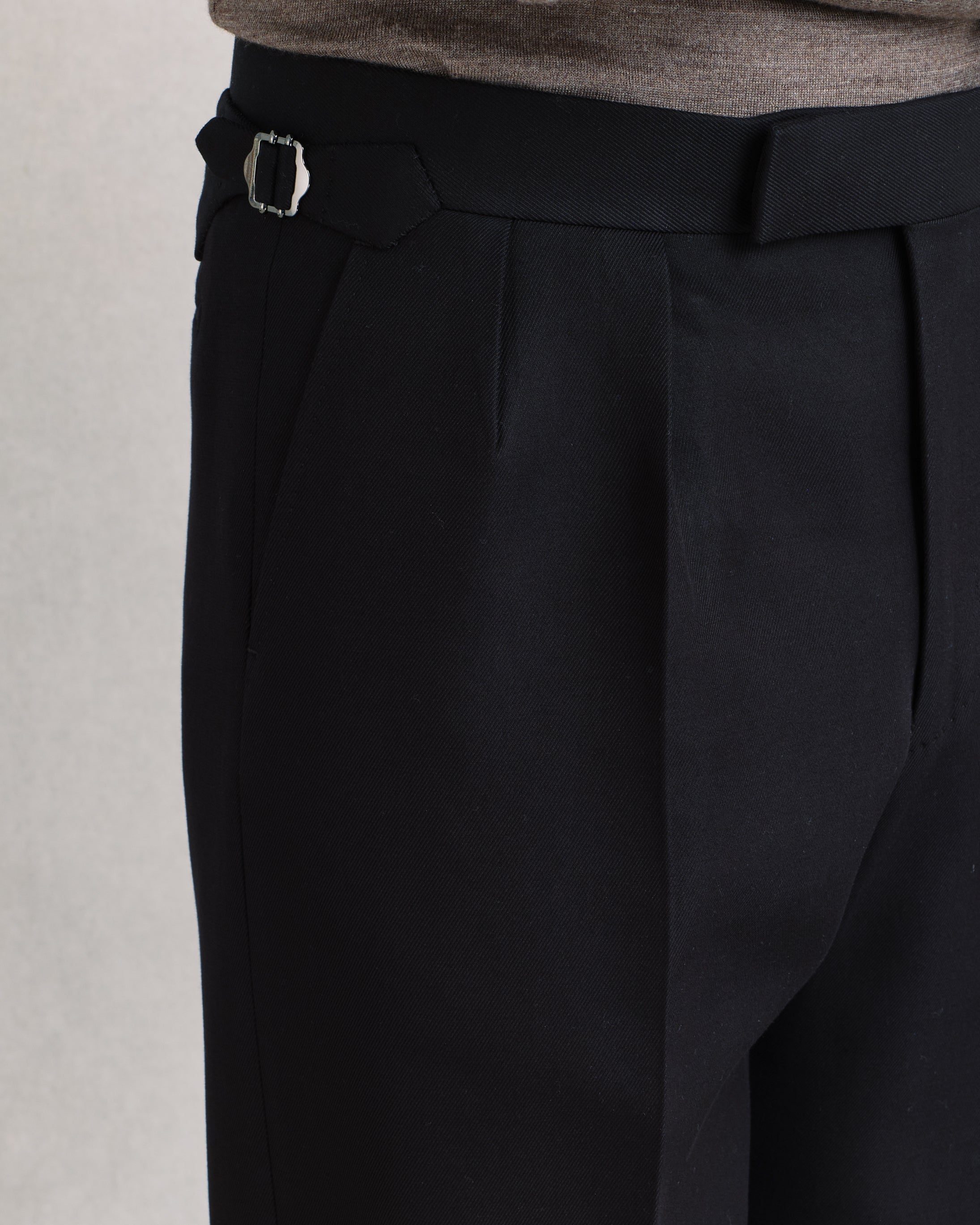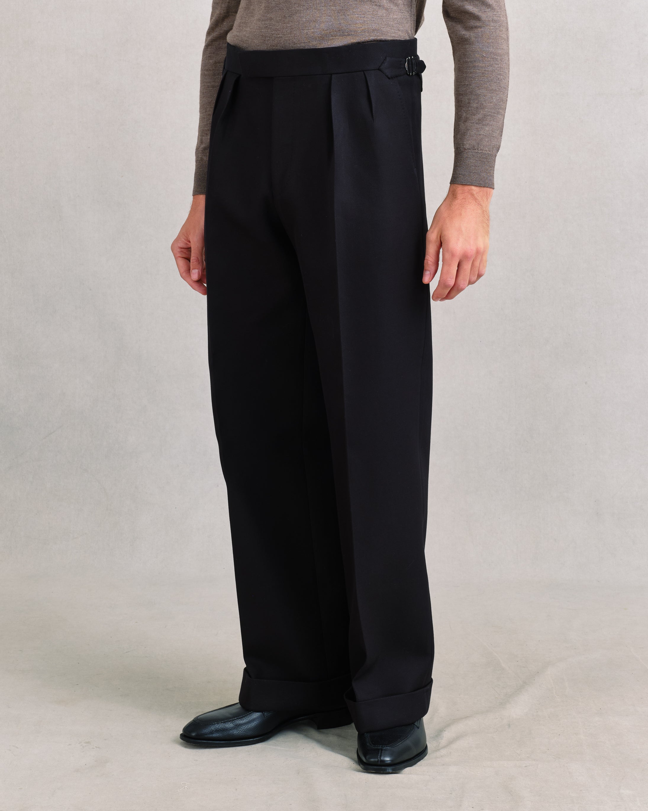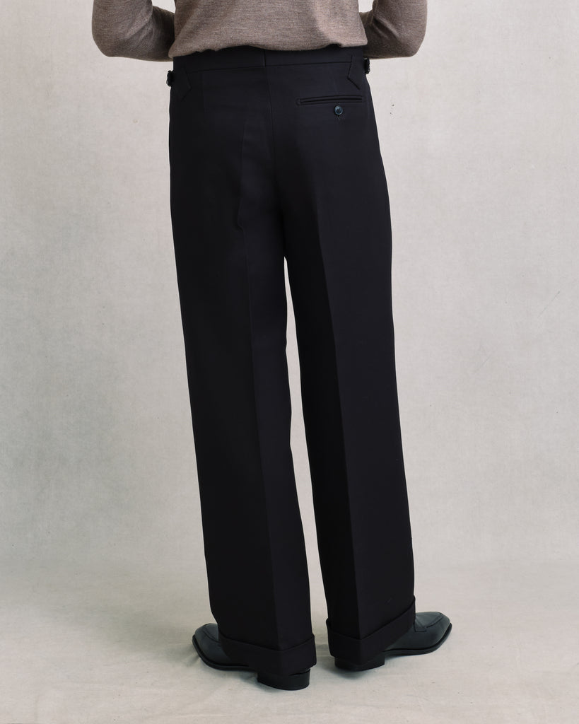 Wide, full, and dramatic. These Oxford bags are cut in a robust cotton twill with a clear diagonal weave that gives the cloth strength and clarity. The generous line and flowing shape bring presence, while the deep black keeps them simple and versatile. A statement of Sexton tailoring, where cut and quality do all the talking.