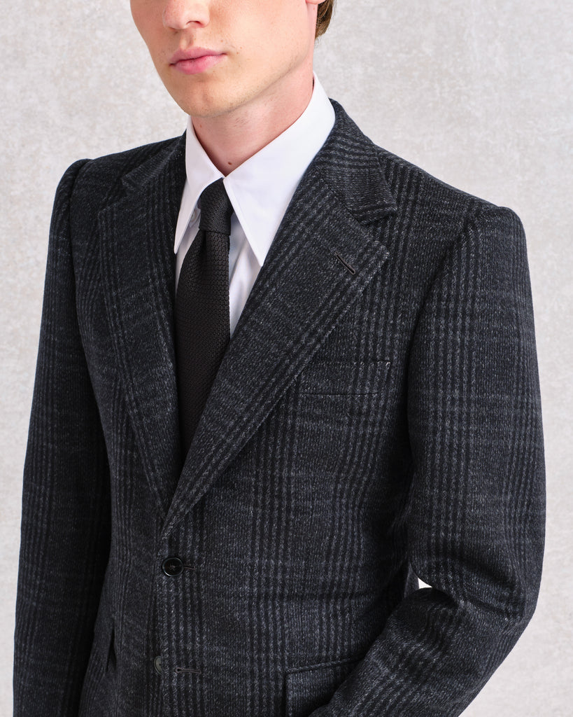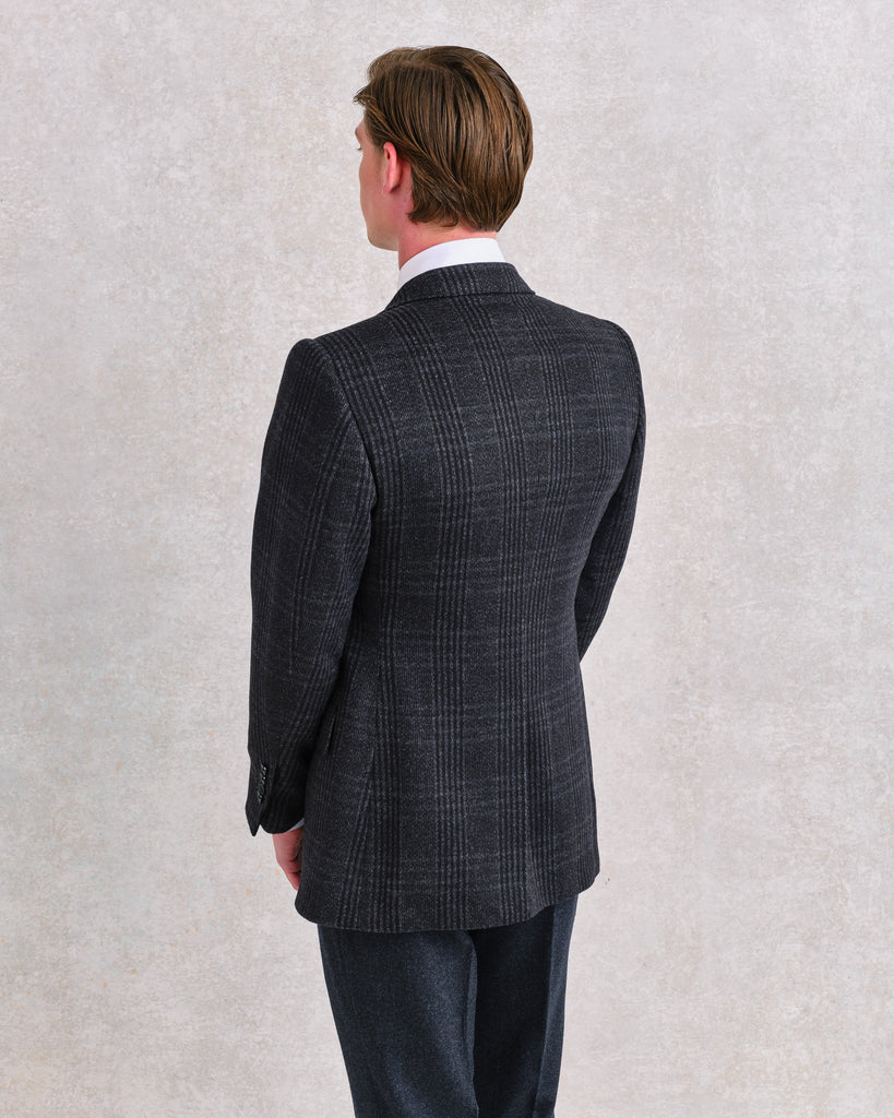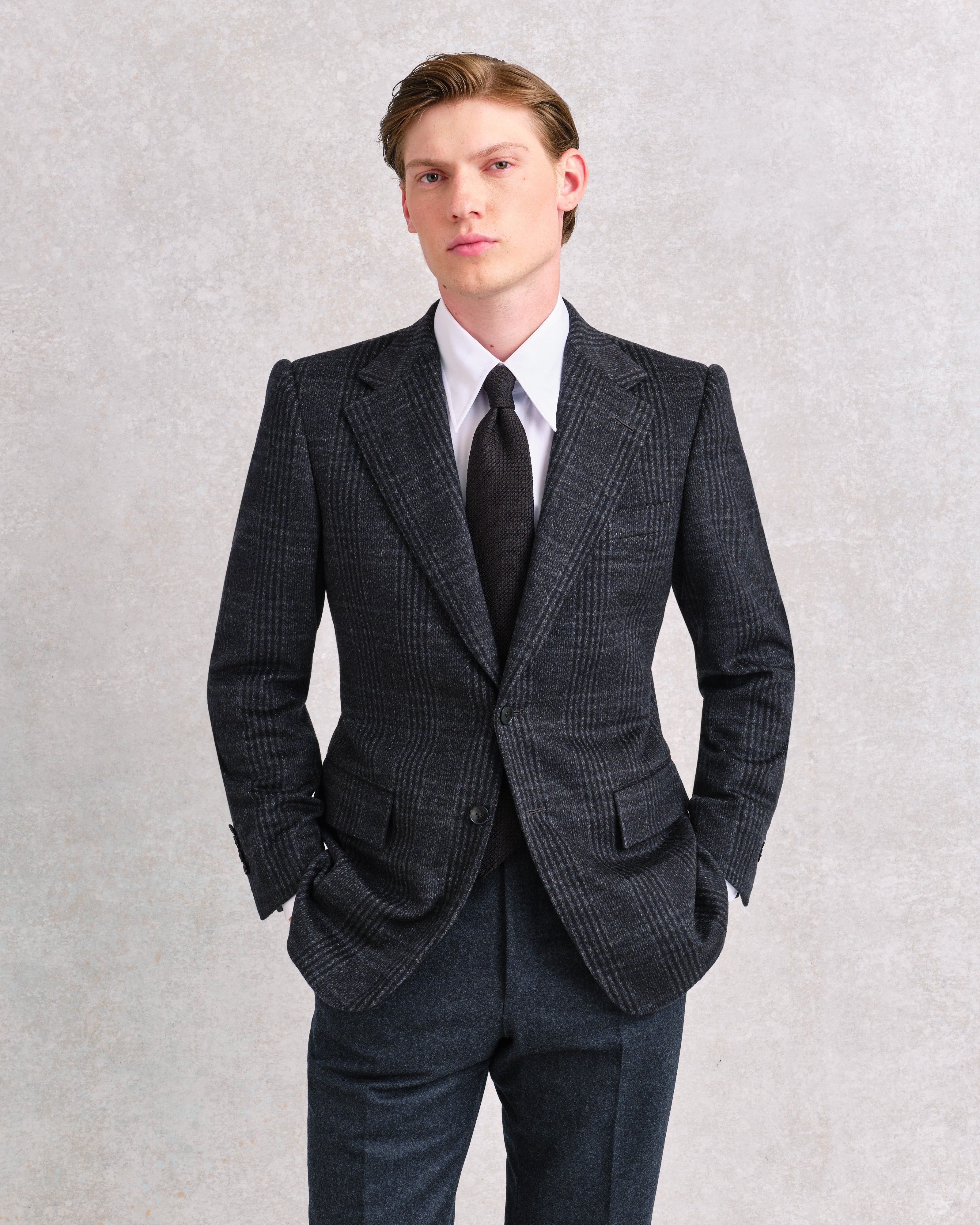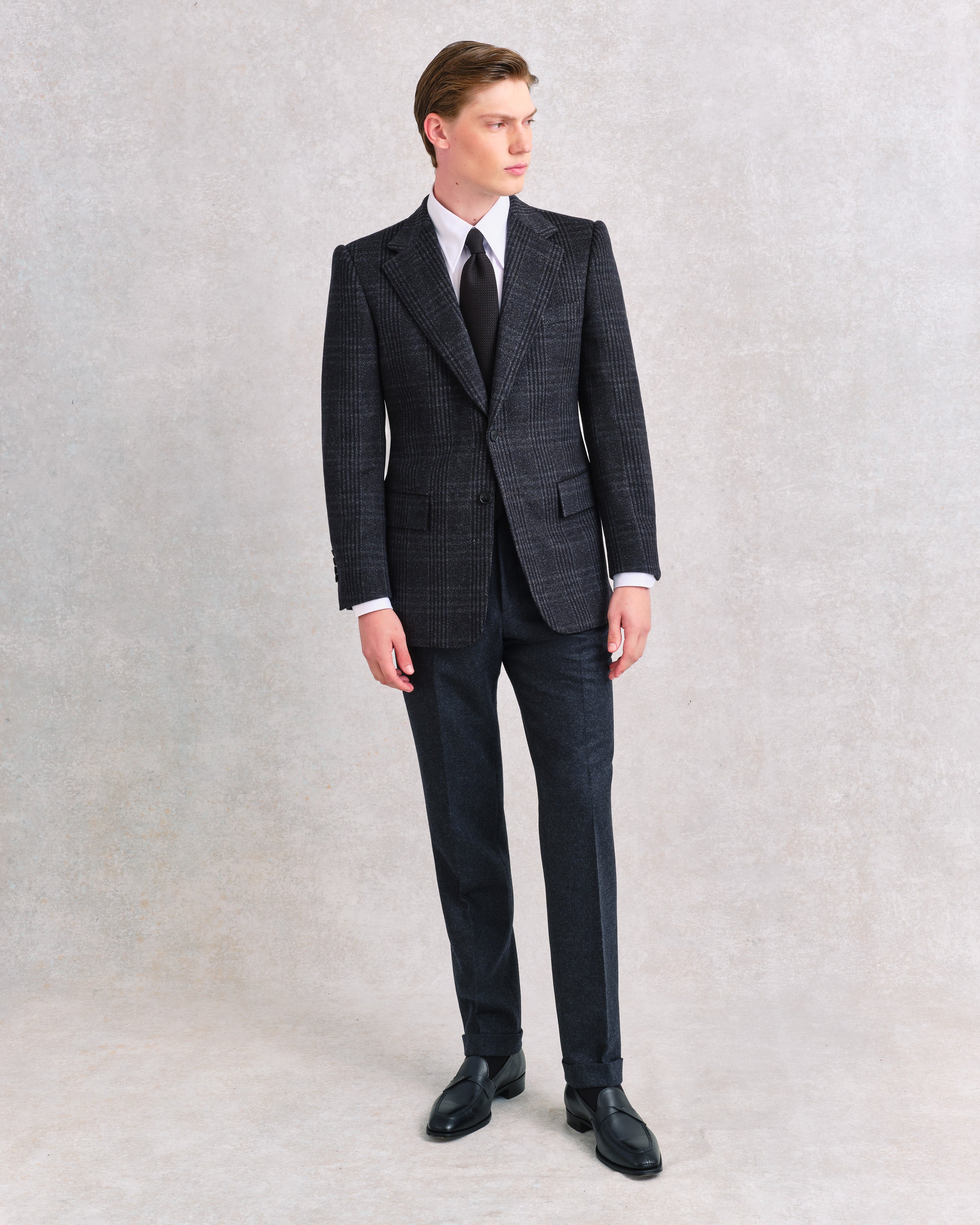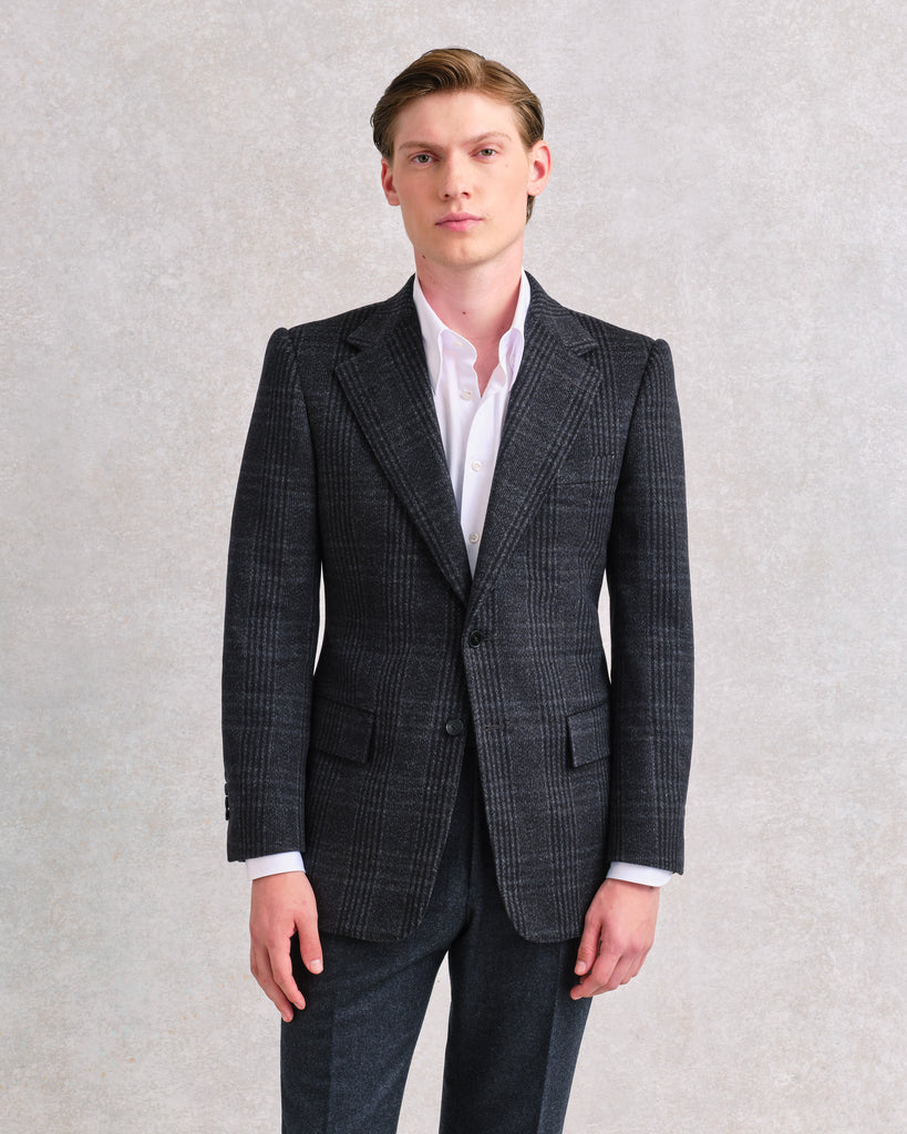 A refined single-breasted jacket in a dark, understated Glen check. Woven from 85% wool and 15% cashmere at 480g, the cloth has a soft brushed finish and reassuring winter weight. The large-scale pattern is muted and elegant, giving quiet depth to the dark charcoal tones. Cut with a contemporary notch lapel, it’s subtle, discreet, and beautifully proportioned—letting the cloth’s texture and scale speak through Sexton’s precise tailoring.