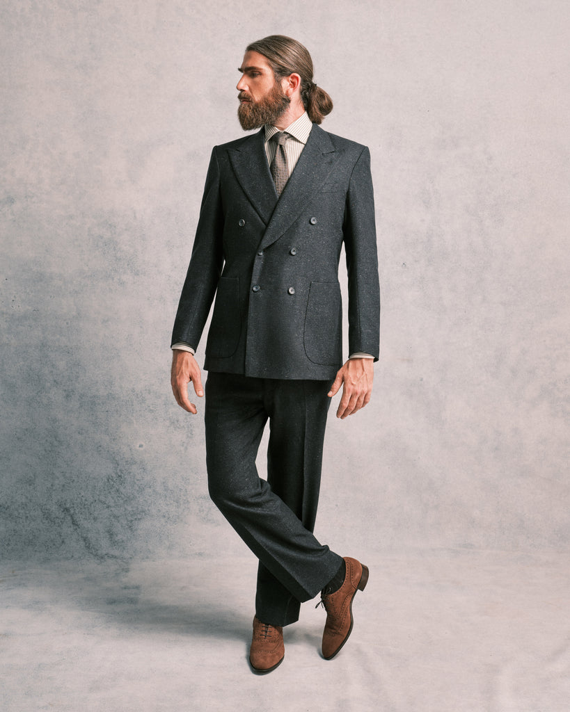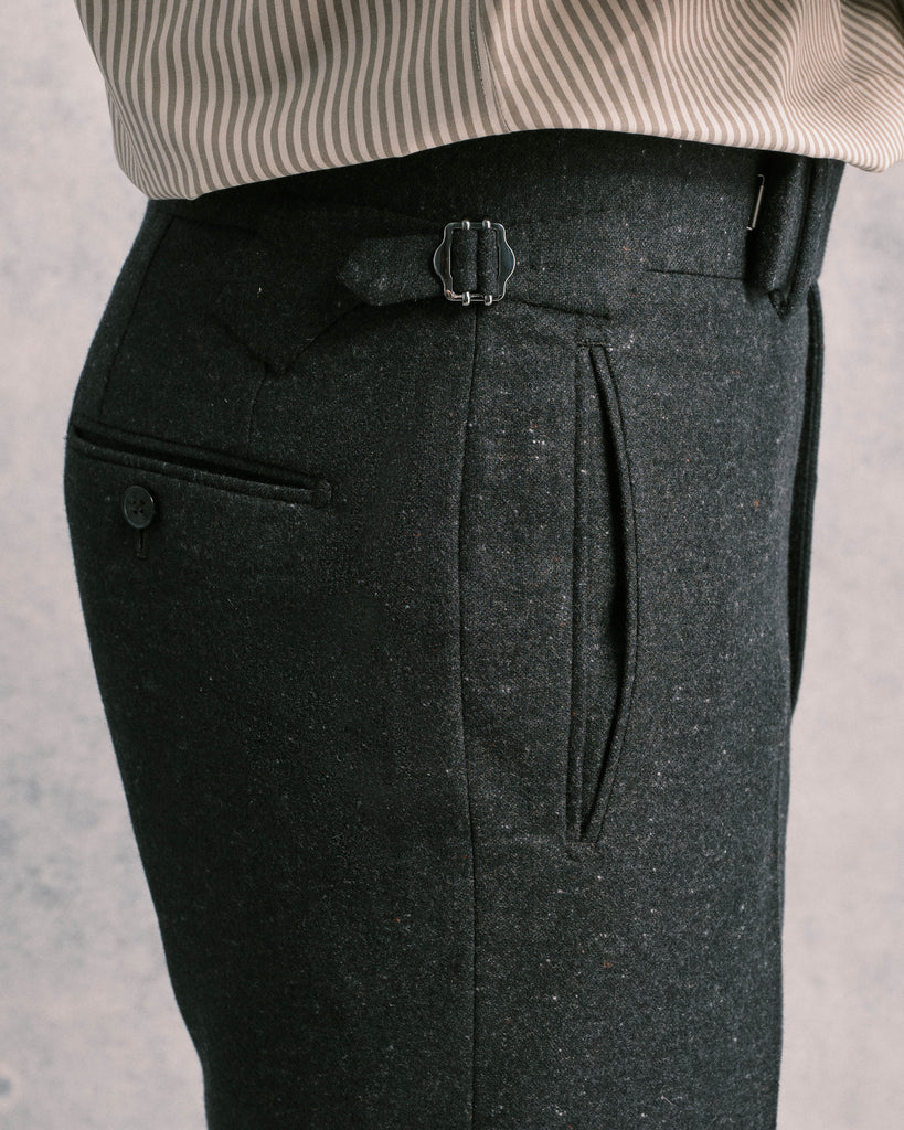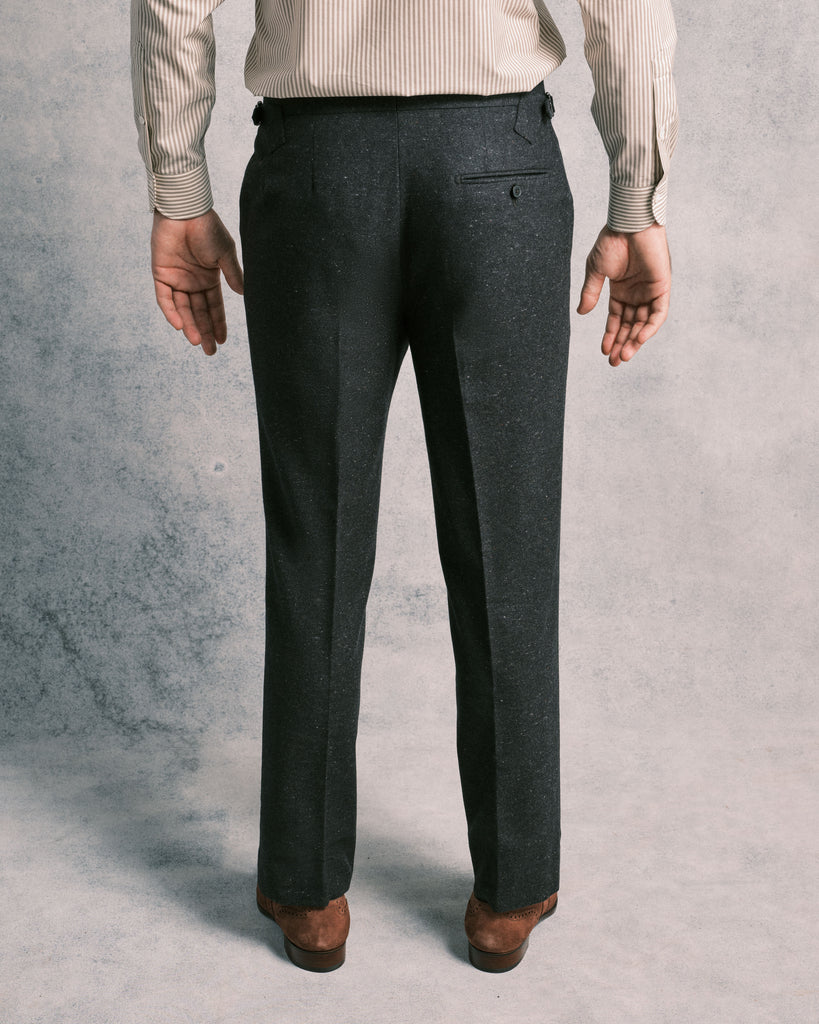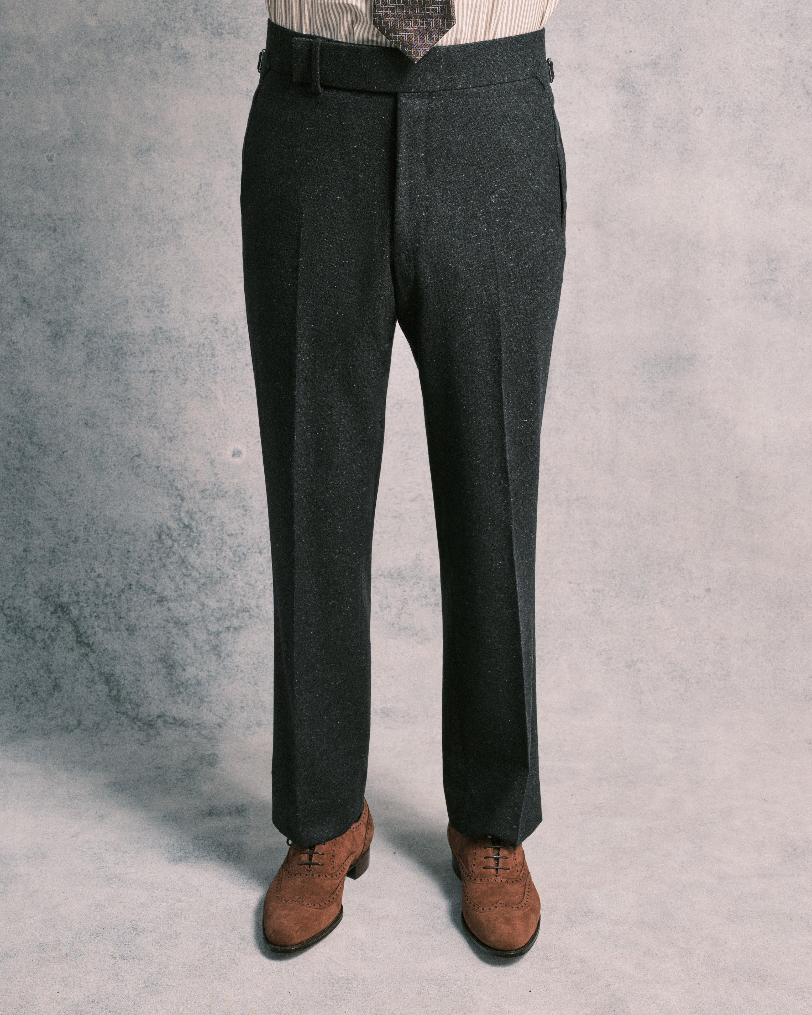 Cut on our classic trouser block, these beautifully soft and flowing charcoal donegal trousers are as comfortable as they are versatile.