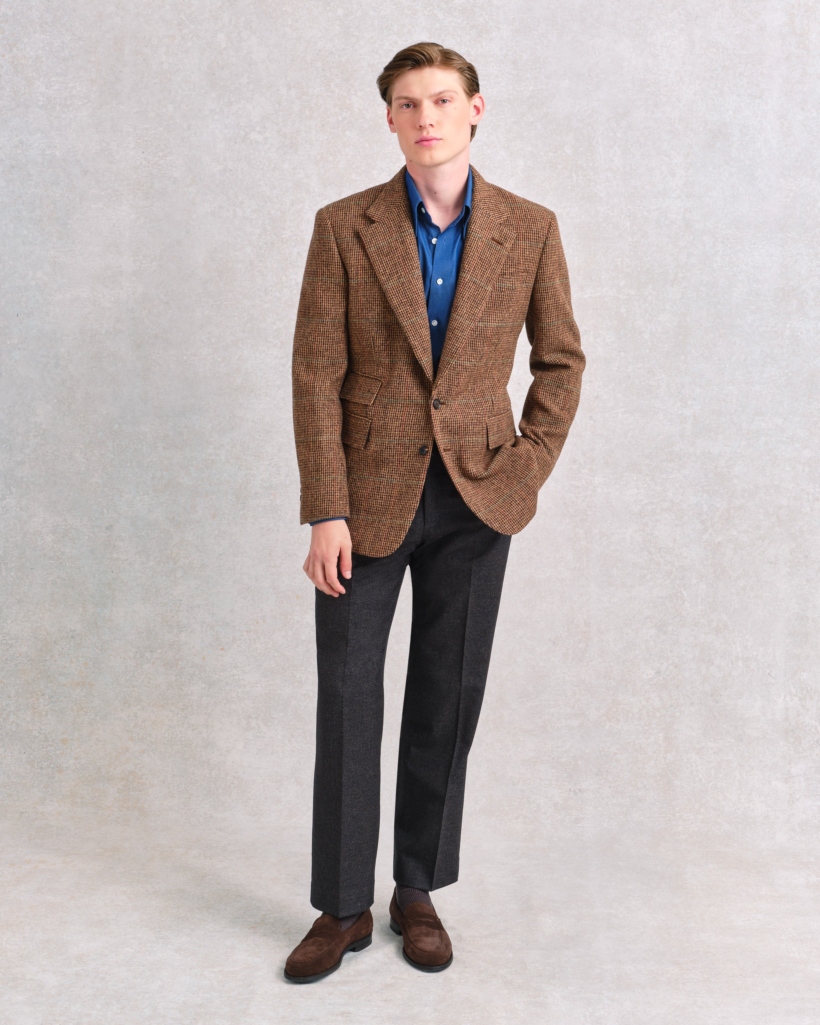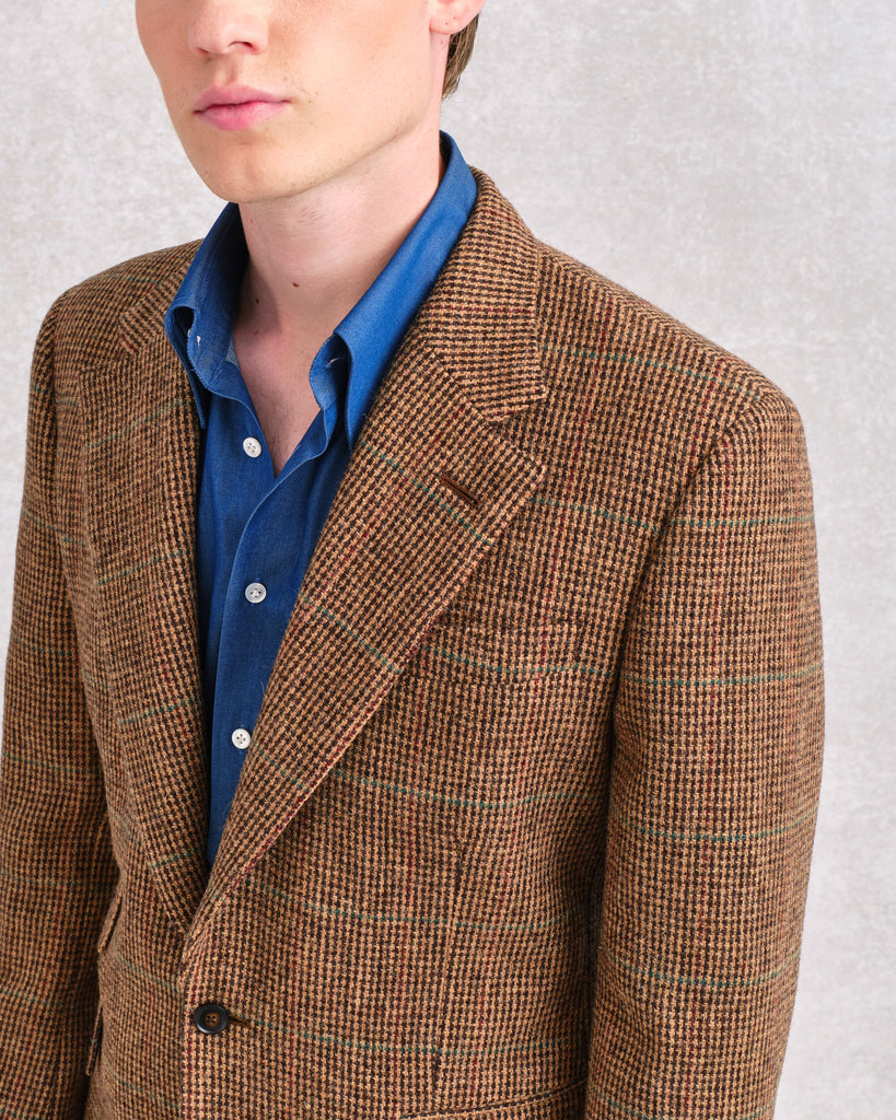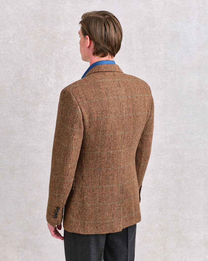 A rich, rugged Sexton sports jacket cut on the drape block for softness and natural movement. The 530g pure wool cloth has a Shetland-like feel - dense, warm, and full of character. Its dark chocolate and tobacco houndstooth is overlaid with a muted burgundy and green check, creating depth without noise. Bold in texture yet subtle in tone, it’s a timeless autumn–winter jacket with easy Sexton elegance.