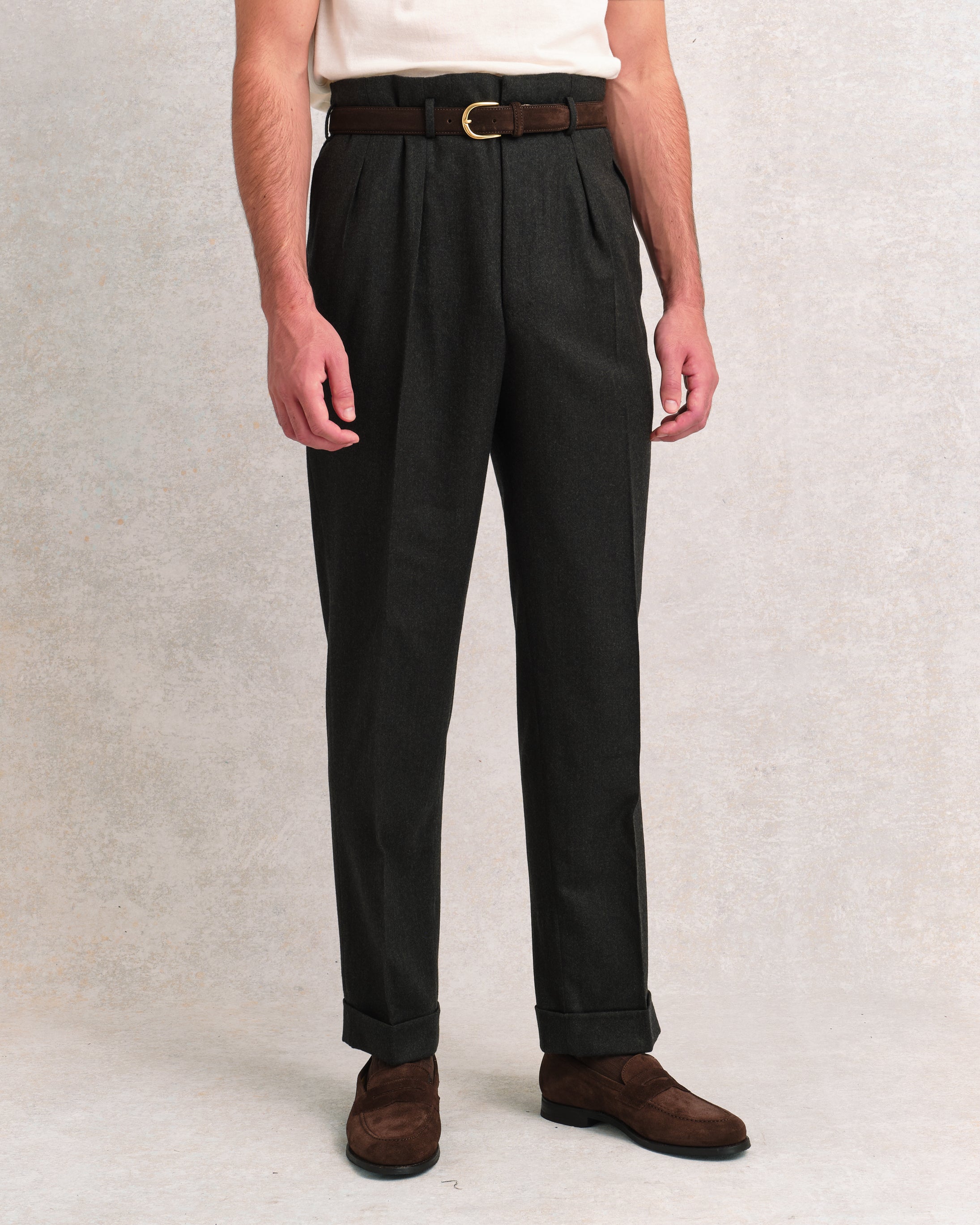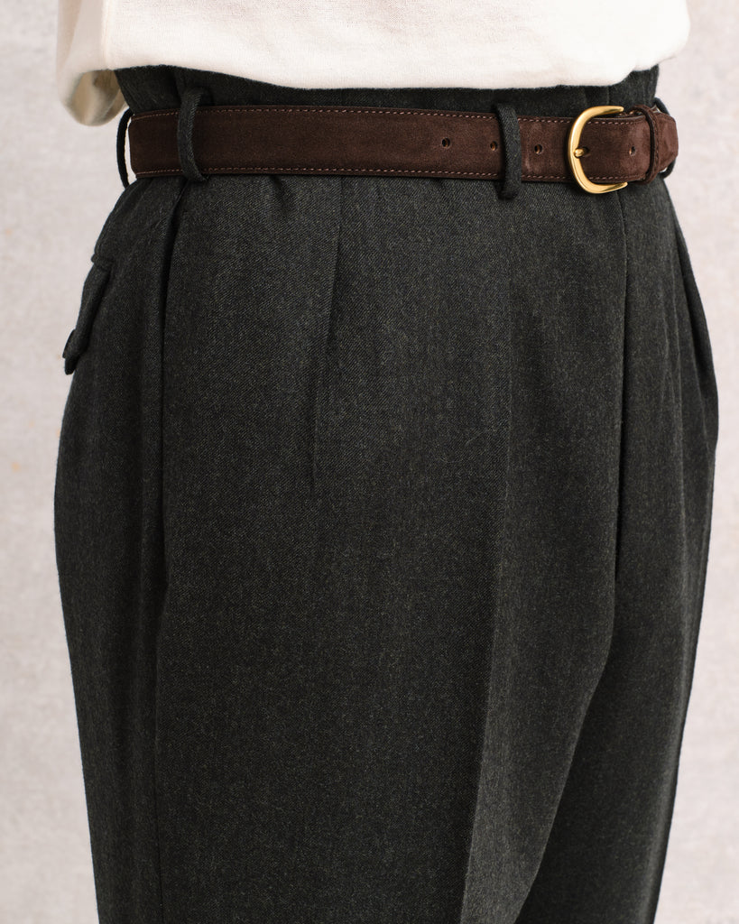 A nod to classic Hollywood elegance, these Edward Sexton trousers are crafted in rich green flannel for a heritage-inspired look with a contemporary edge. The “Hollywood” style is defined by a high waist, extended tab closure, and gently pleated front, creating a flattering, elongated silhouette. Perfect for pairing with a coordinating jacket or styled alone for effortless, smart-casual polish.