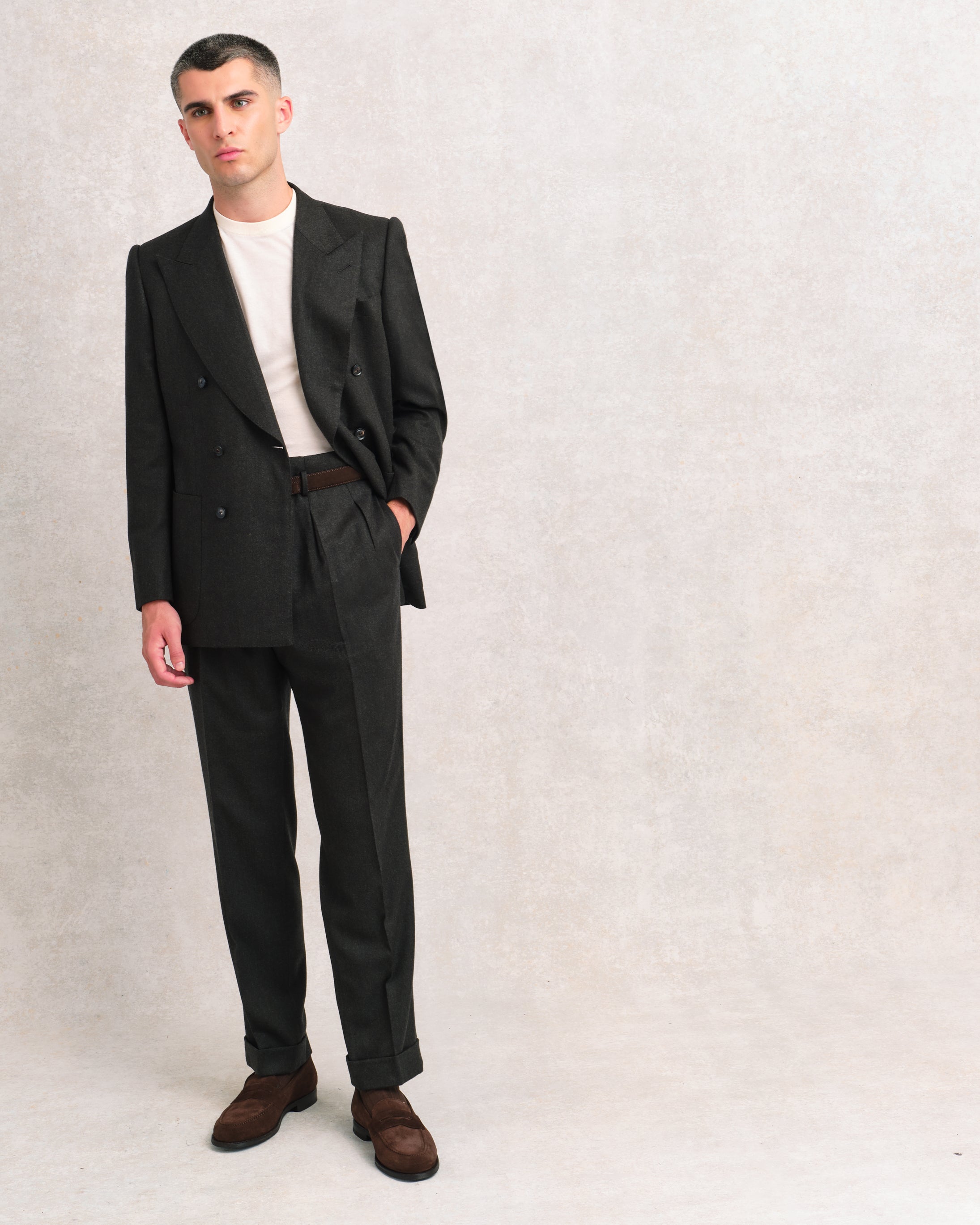 Our pièces de résistance; our Hollywood Trousers. Cut with an unstructured, soft waistband and belt loops. These are inspired by a particular kind of ‘leisure trouser’ that was popular in the 1940s and ‘50s, designed to be wonderfully comfortable and free-flowing. In flannel, corduroy or smooth gabardine, they’re as sophisticated as trousers can be, and well-suited to creative dressers or clients in search of something chic to wear on the weekends.