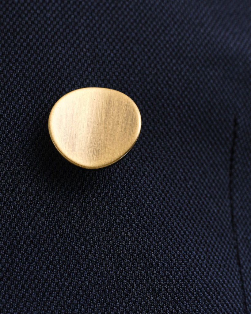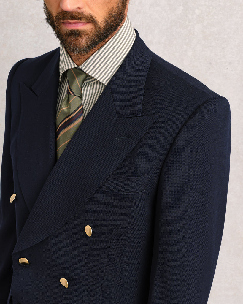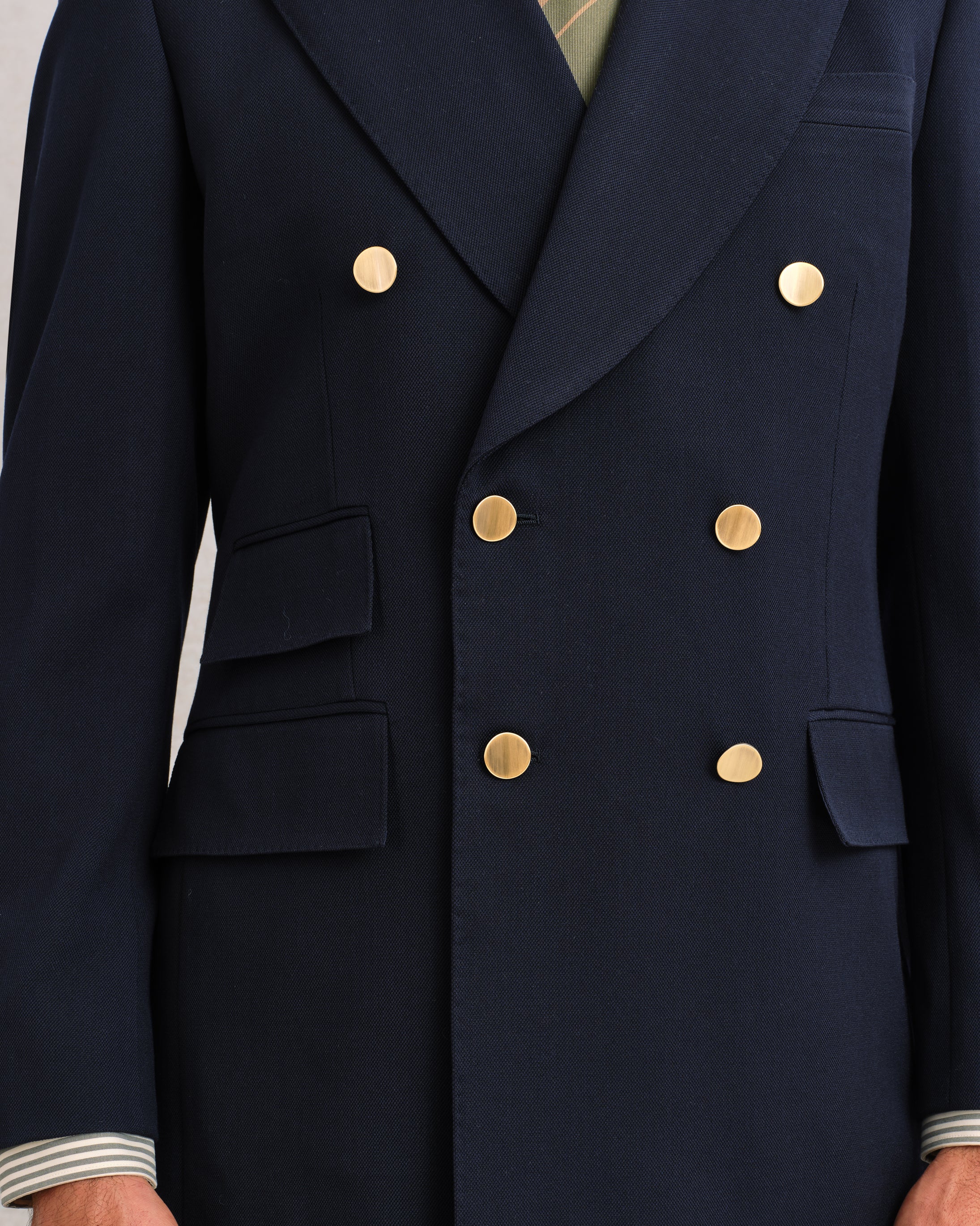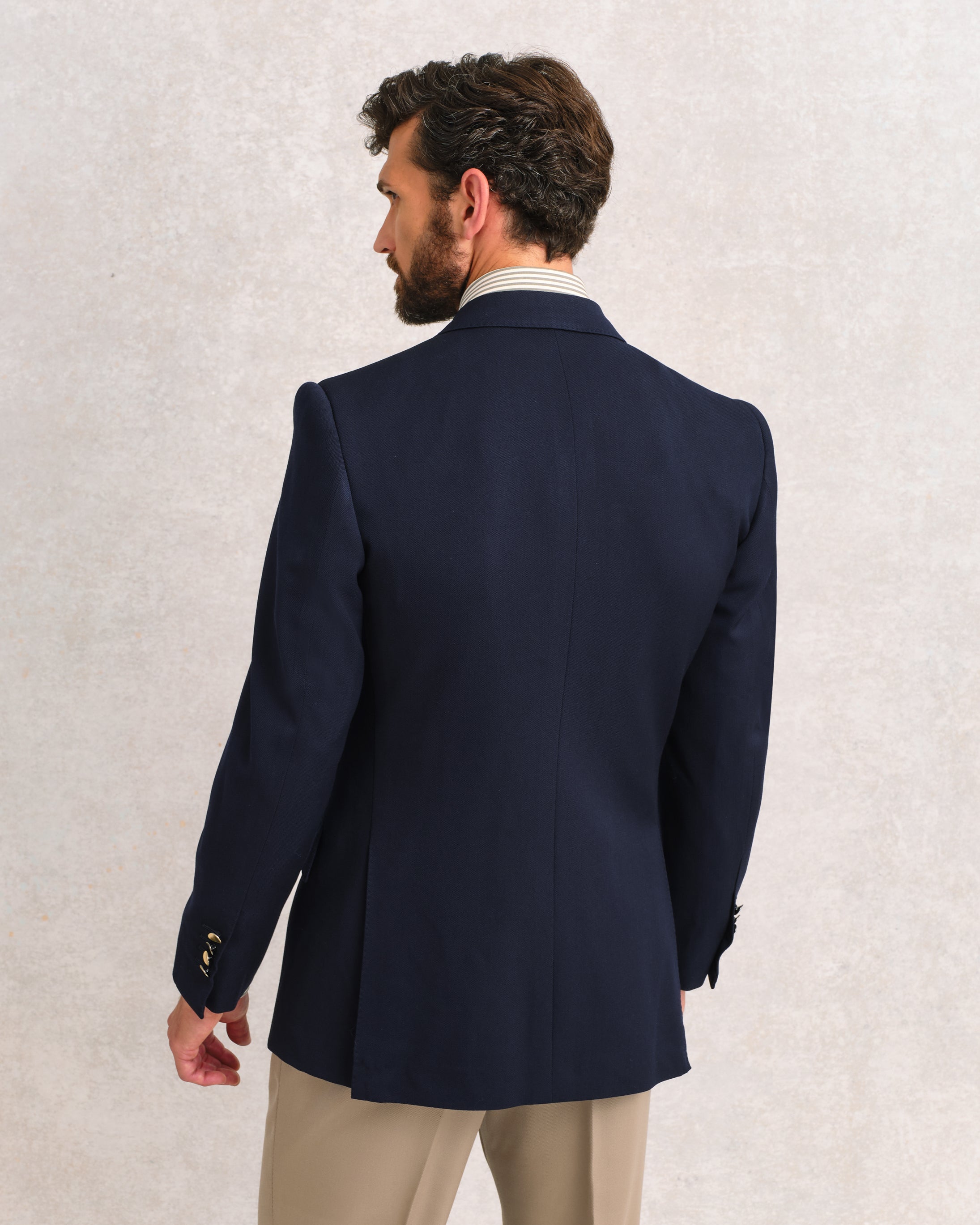 Rich and elegant while firm and rugged, this navy wool blazer has a firm and reassuring handle while being comfortable and elegant. In a robust open weave dark navy wool, and statement Sexton brass buttons. It is a quintessentially Sexton blazer, and a Savile Row staple.