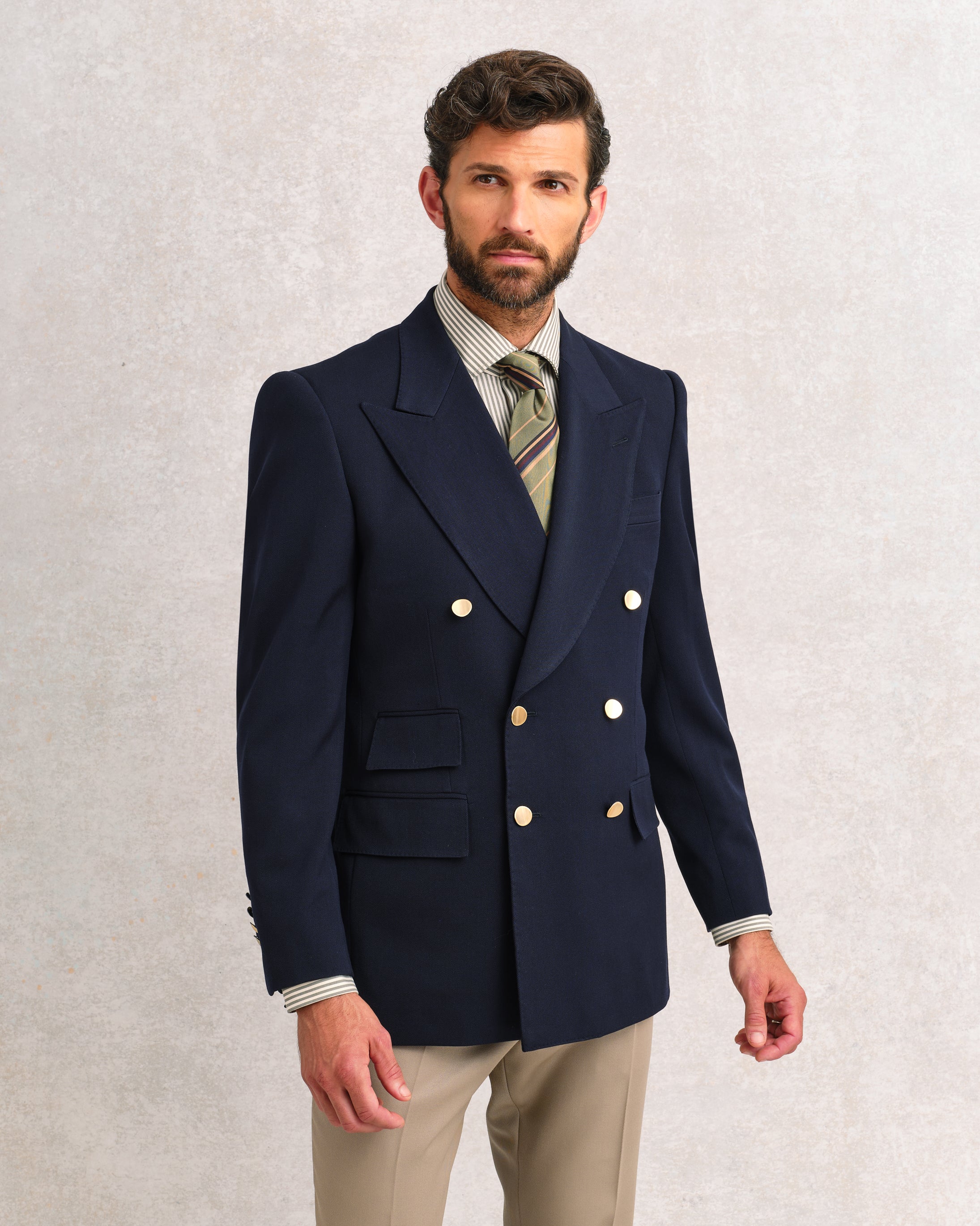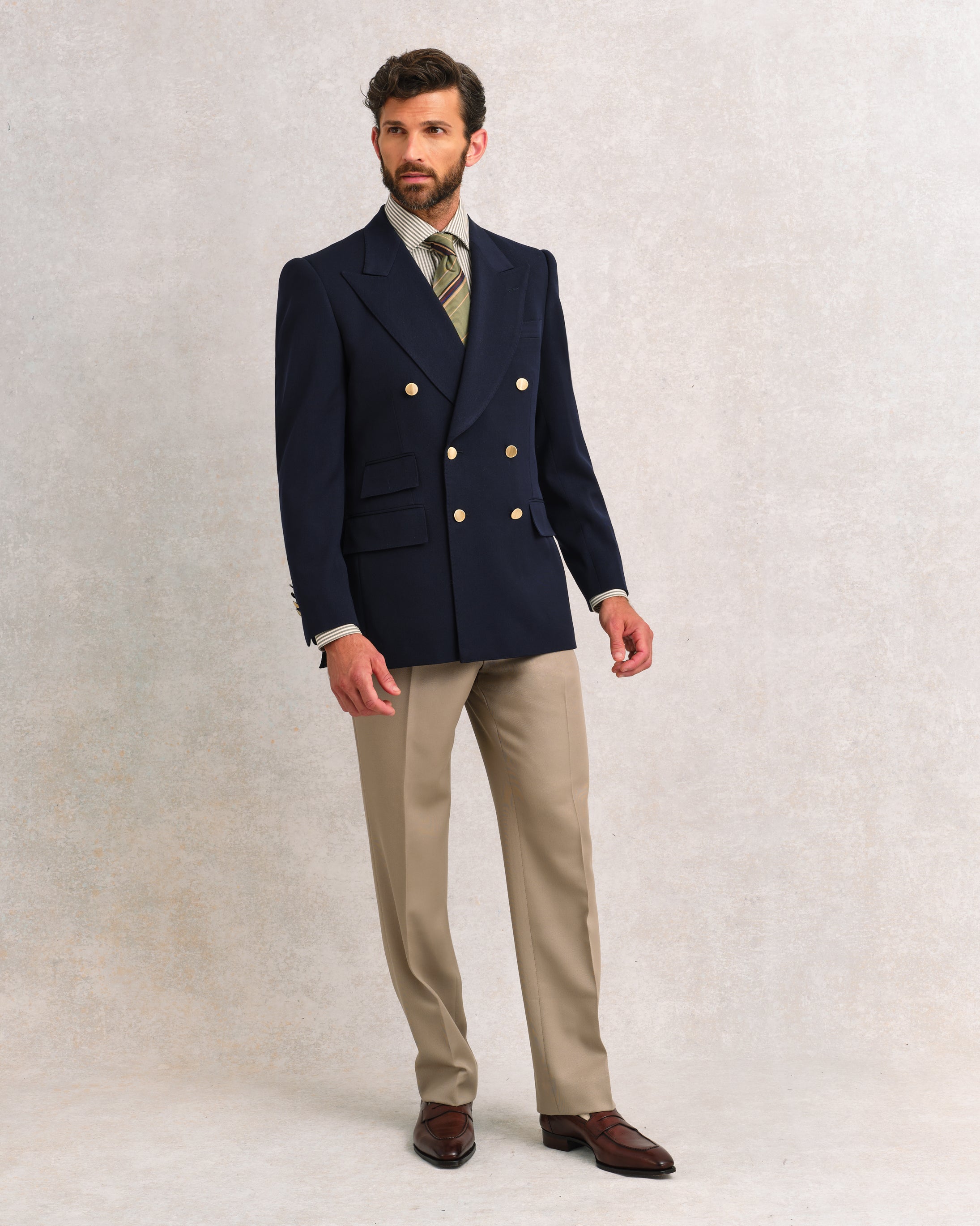 Perhaps our best-known cut is the timeless Signature Double-Breasted Jacket, which has four buttons to fasten and two ‘show buttons’ on the chest. A personal favourite of Edward’s, double-breasted jackets like this lend stature and a touch of authority to the wearer, but can nonetheless still create a playful impression in bold colours, soft textures.