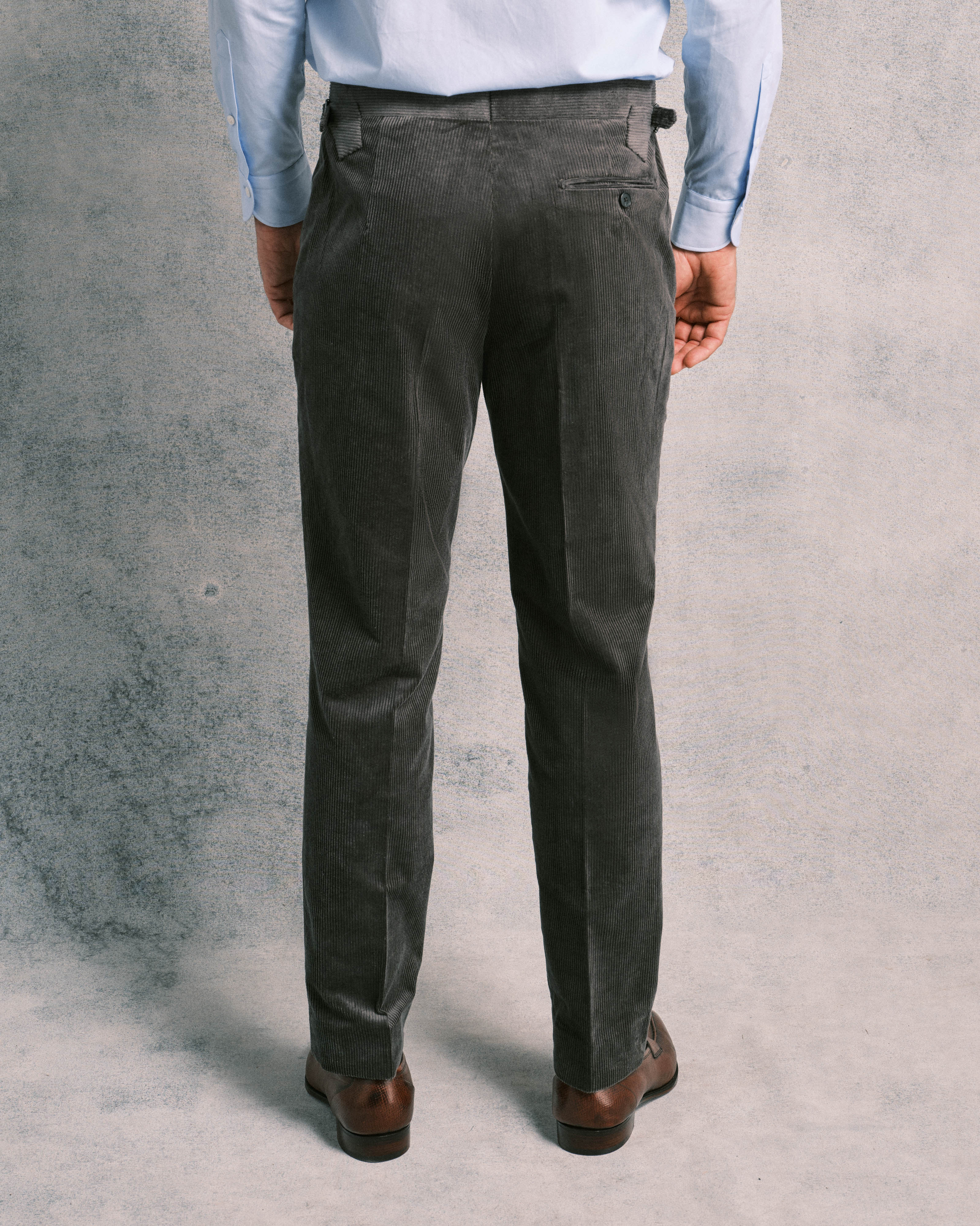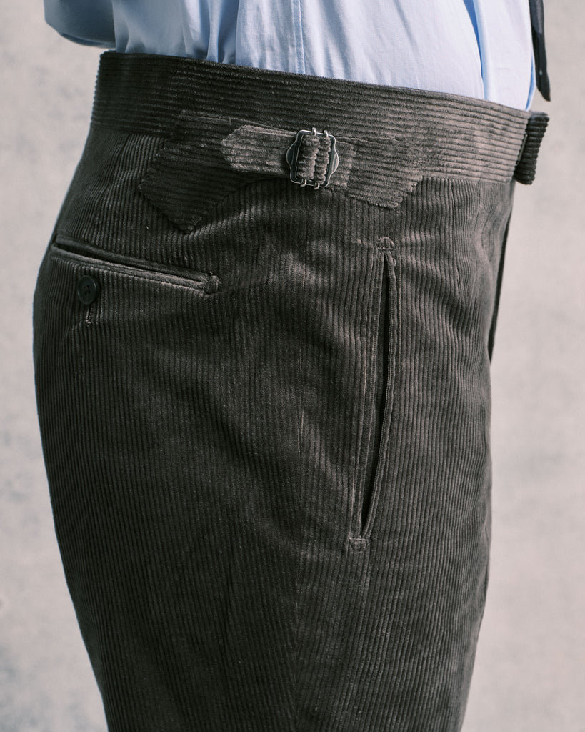 Woven in Italy, this beautiful grey corduroy is woven with a base of 77% Cotton for softness and warmth. This is suplimeted with 22% Tetoron Cotton (a Cotton/polyeter blend), which contributes further durability, while the 1% elastane allows the wearer some forgiving stretch for further comfort. The dense cloth weights a cosy 380g/m, providing warmth and a softness to touch. Neither very wide or very narrow, this cordoroy's wales are around 1/8" in width, seperated by 1/8" channels.