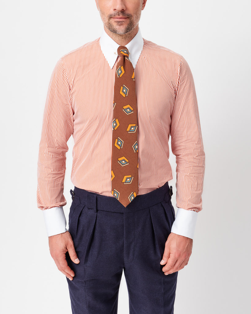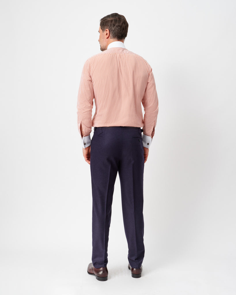 We have paired the double-breasted jacket with our full-cut heritage navy flannel trousers, but for those that prefer a more modern and sleek trousers, our contemporary cut trousers are available here.