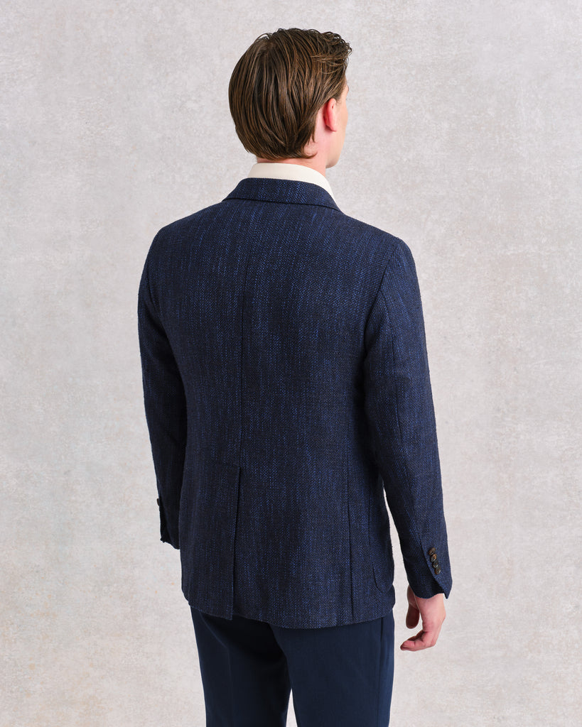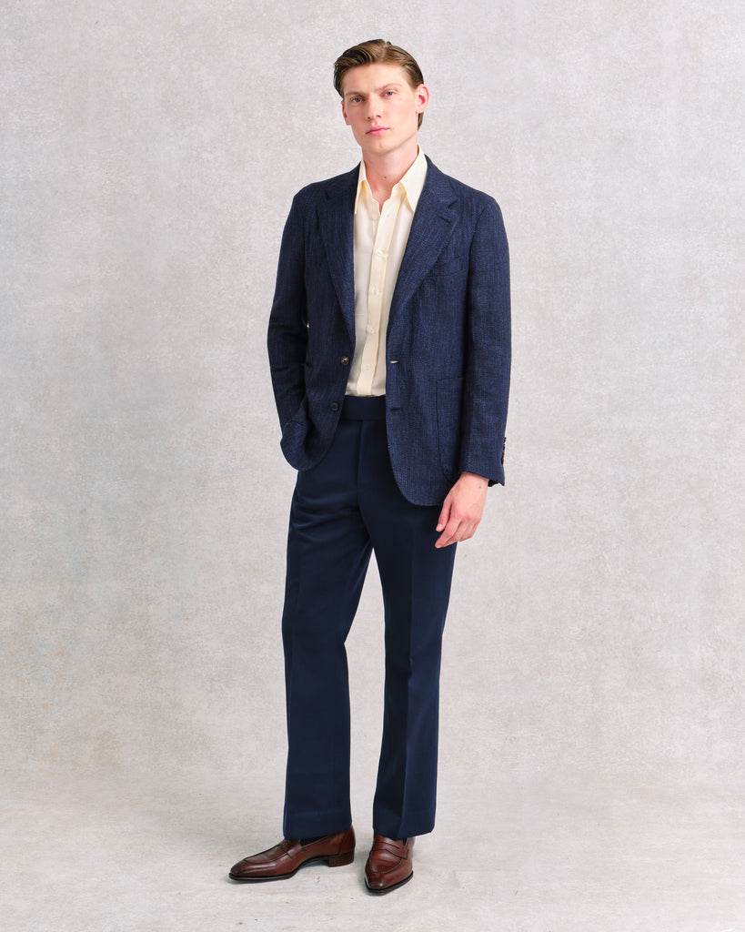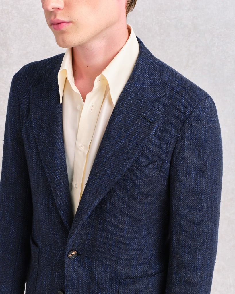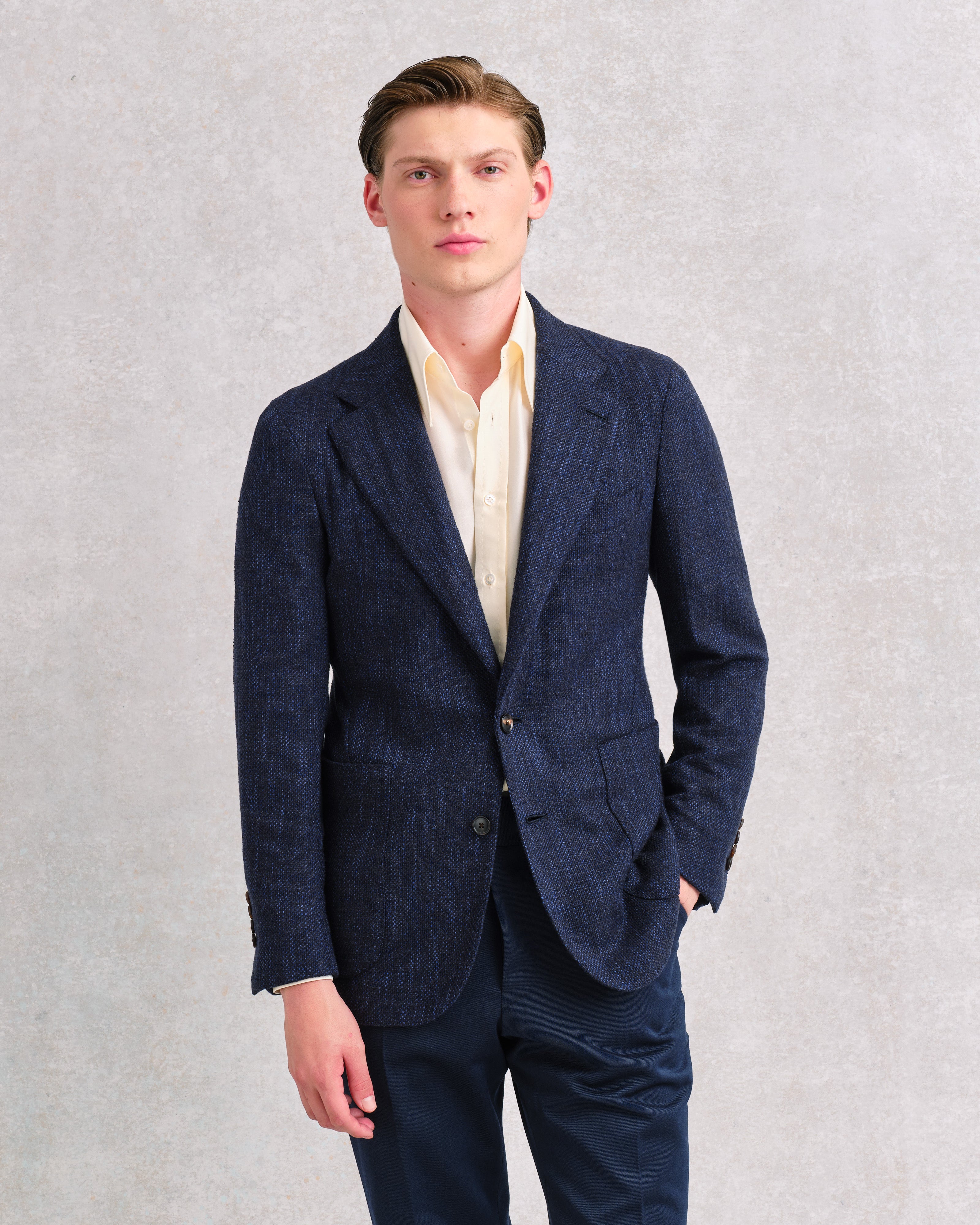 A refined, understated blazer with natural Sexton ease. Woven in a wool, silk, and cotton blend, the loose basket weave mixes navy and midnight tones to create subtle depth and a gentle iridescence from the silk. The single-breasted cut with notch lapels and patch pockets keeps it relaxed and versatile, while the texture of the cloth gives quiet sophistication. Simple, elegant, and effortlessly chic.
