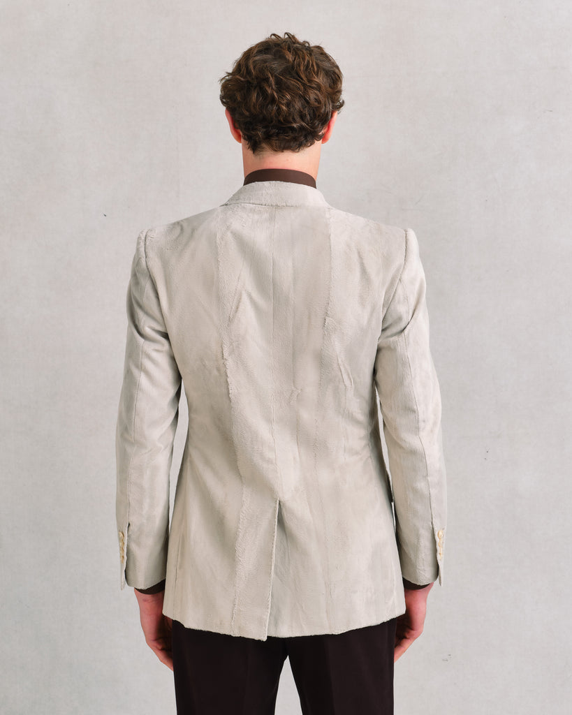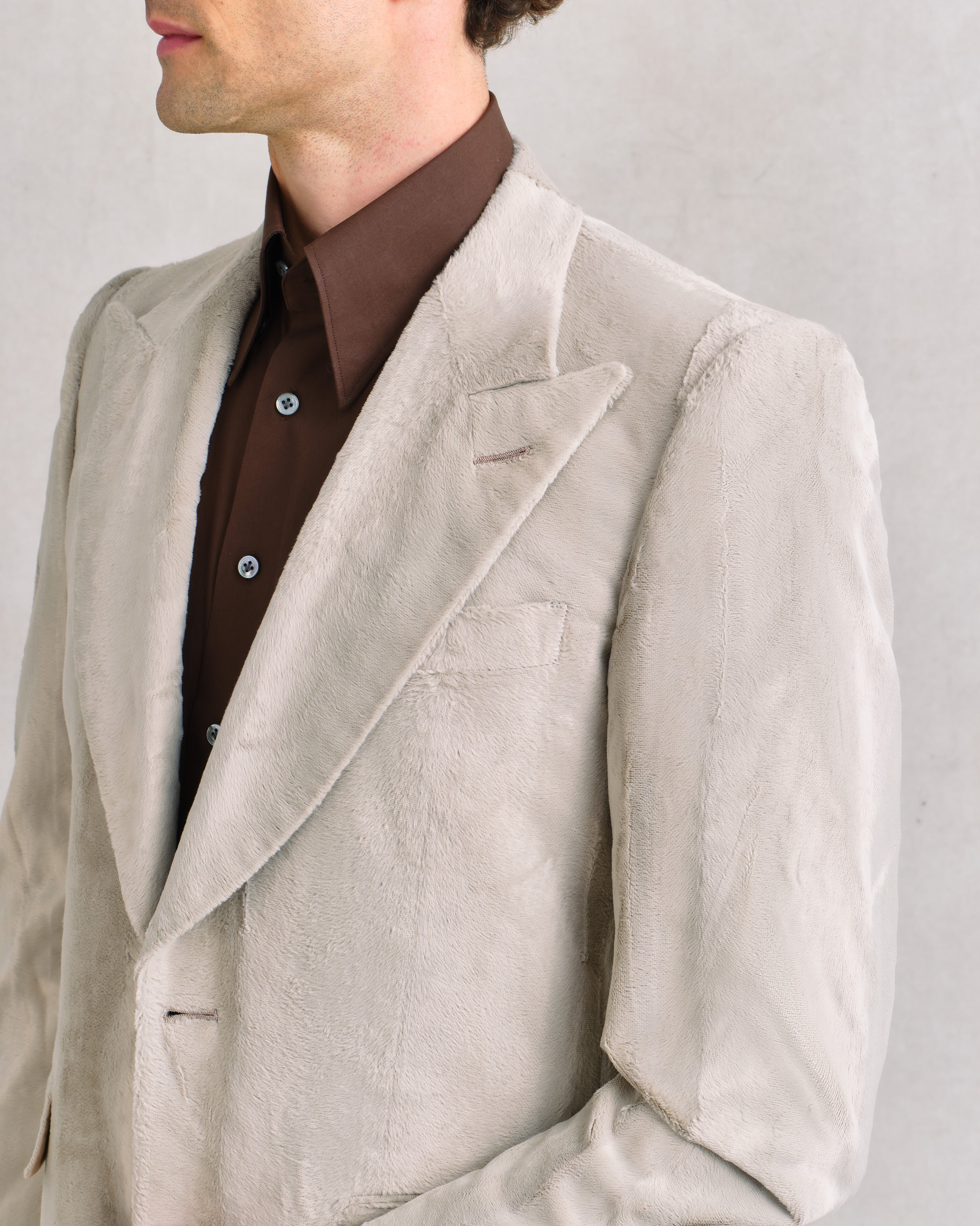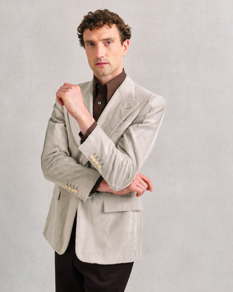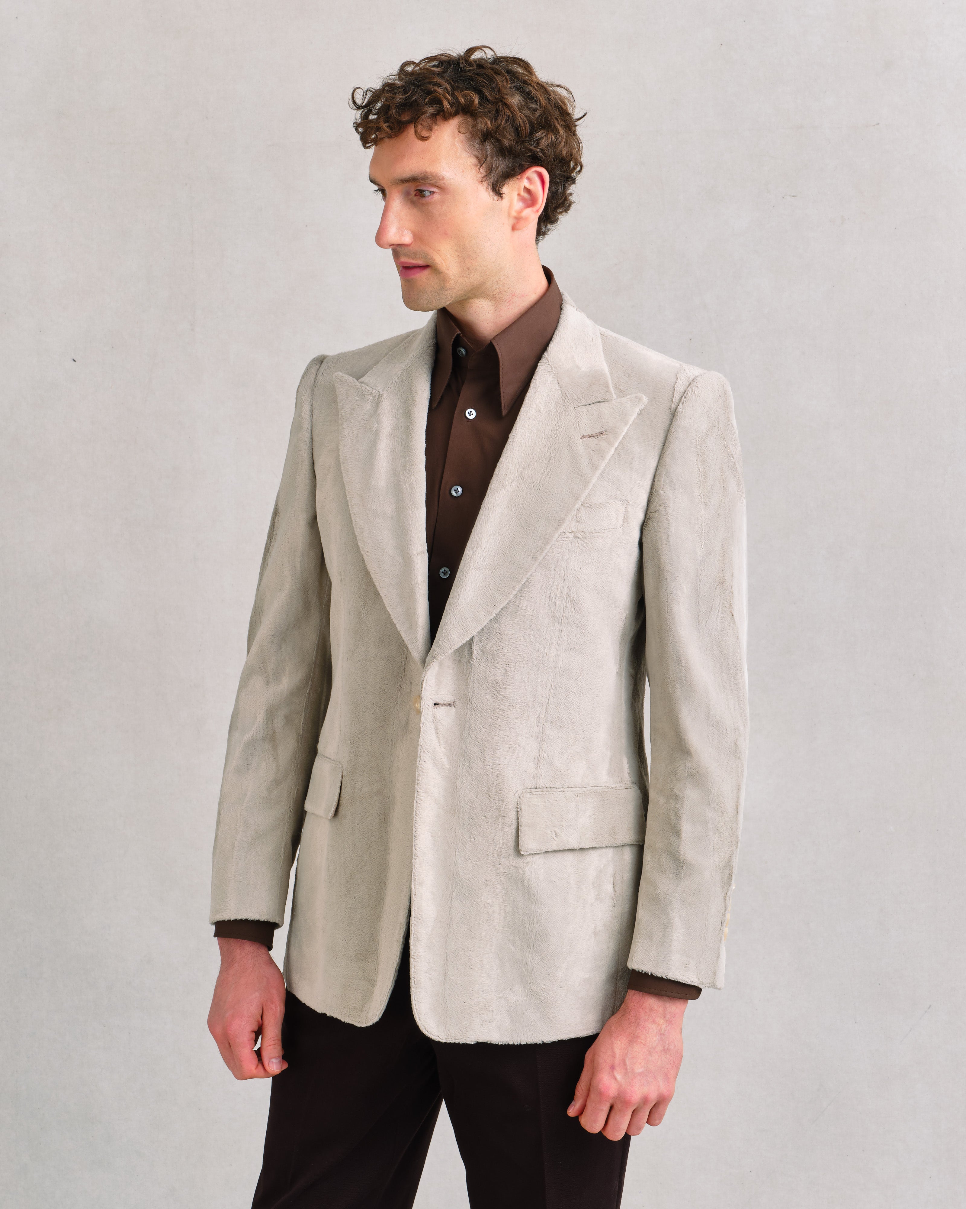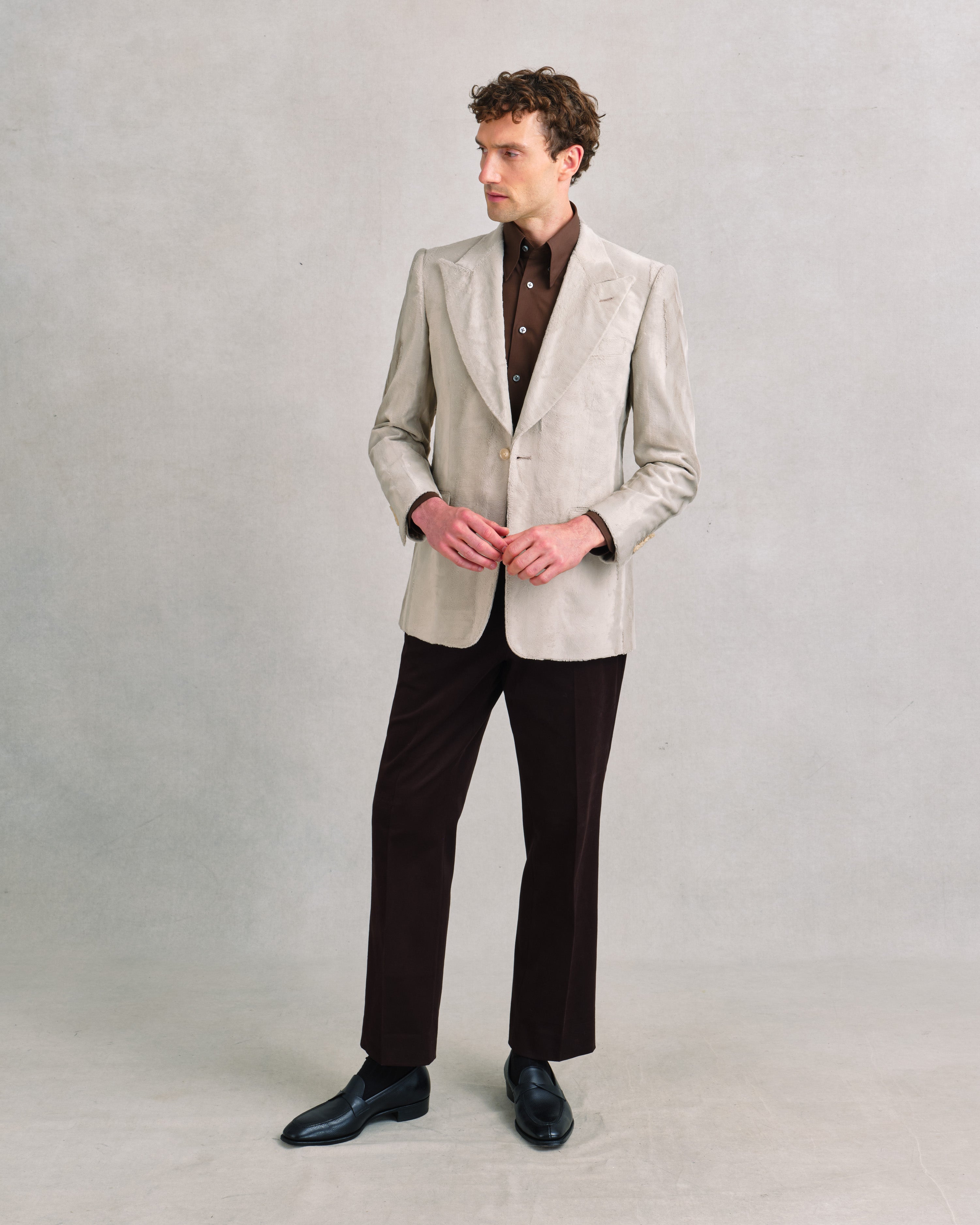 A bold Sexton statement in textured velvet. The cotton-blend cloth has a stony off-white tone, with the pile running in varied directions to create depth and movement. Cut in a sleek heritage silhouette, it’s striking yet surprisingly versatile—refined with black dress trousers, rich with chocolate brown, or relaxed with denim. Paired with one of Sexton’s silk shirts, it becomes pure evening glamour: confident, tactile, and unmistakably Sexton.