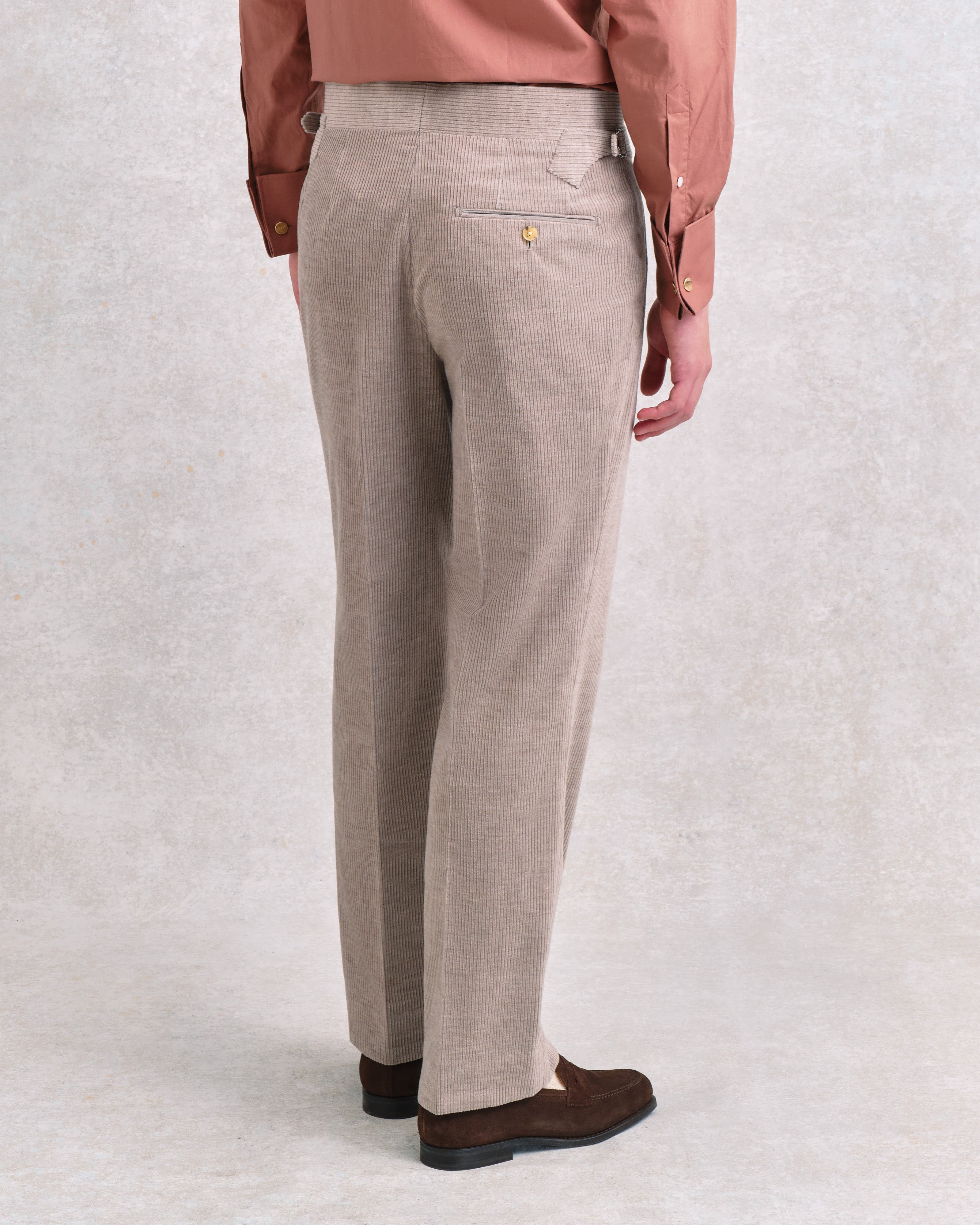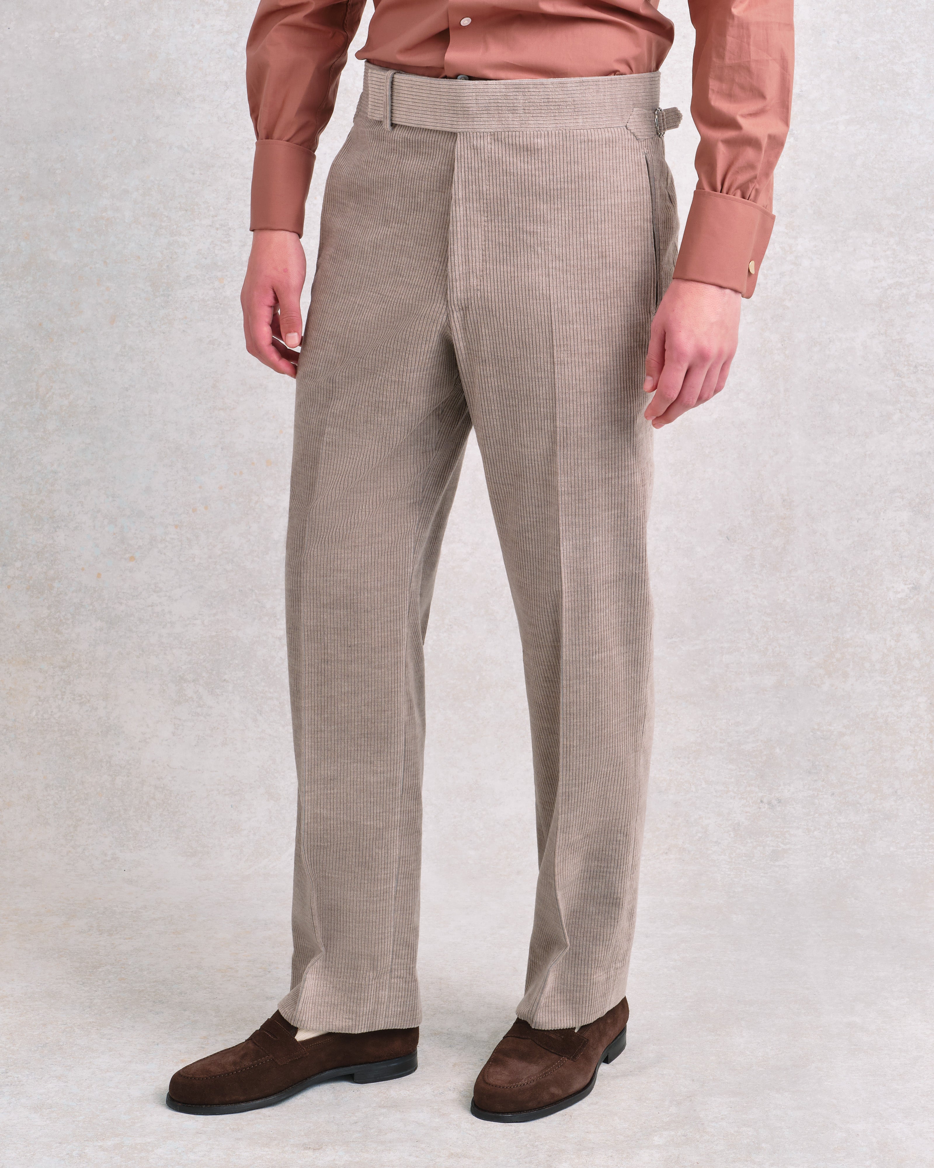 Full and soft in line, these trousers are tailored in a wide-wale taupe corduroy of 90% cotton and 10% cashmere. The fabric’s cashmere content gives a gentle sheen and smooth touch, while the earthy tone keeps them versatile. Ideal with the matching drape jacket or paired with sports jackets and knits, they bring warmth, texture, and Sexton ease to autumn dressing.
